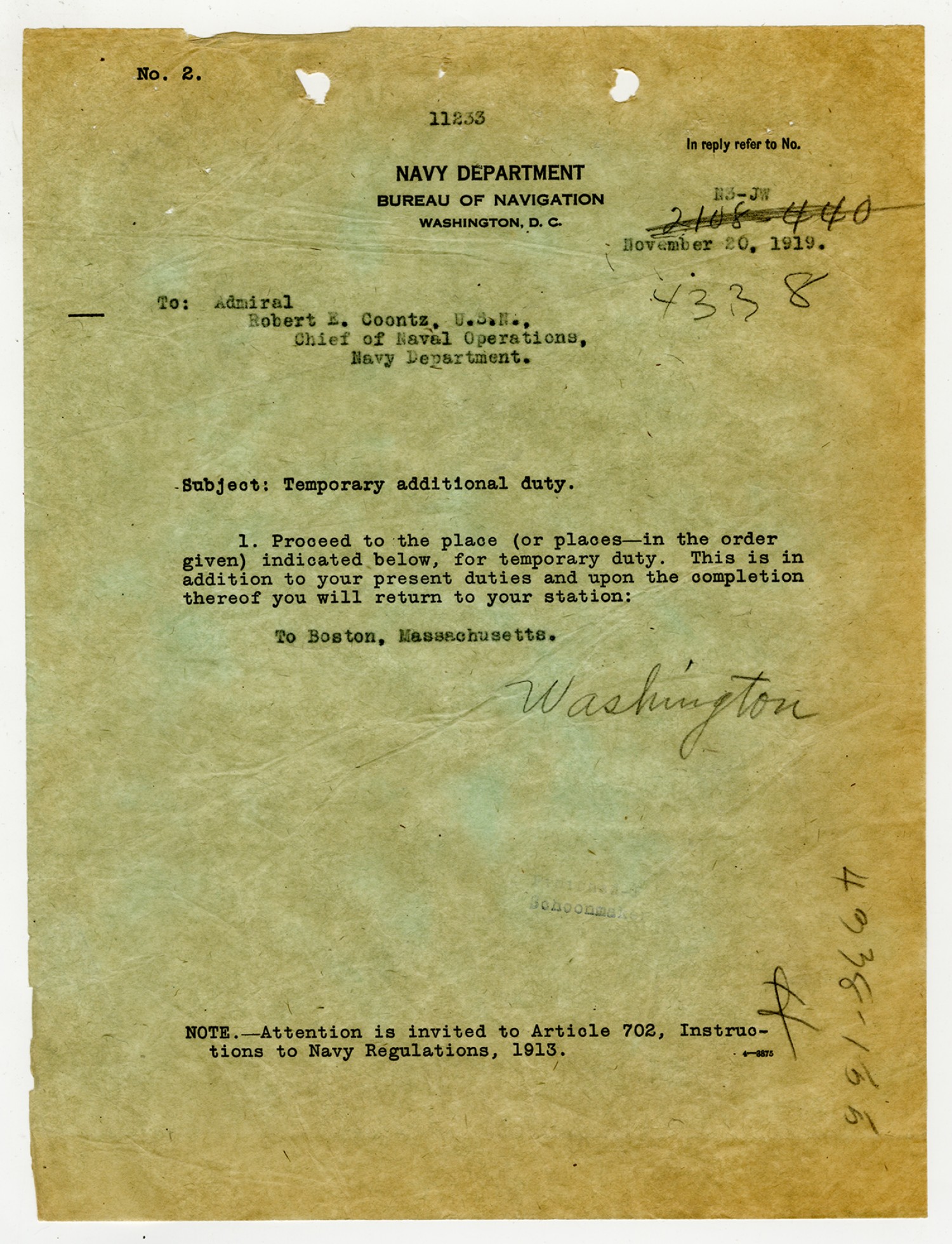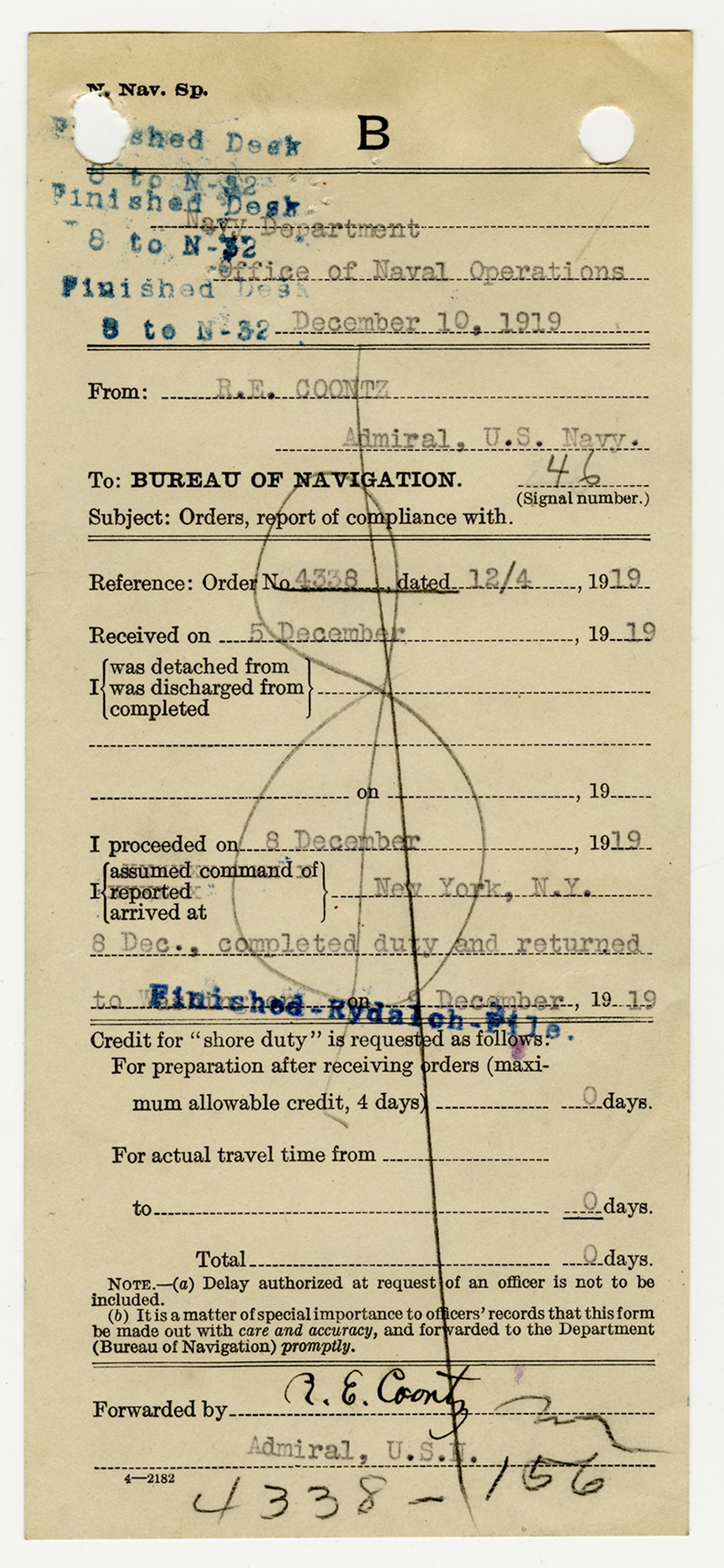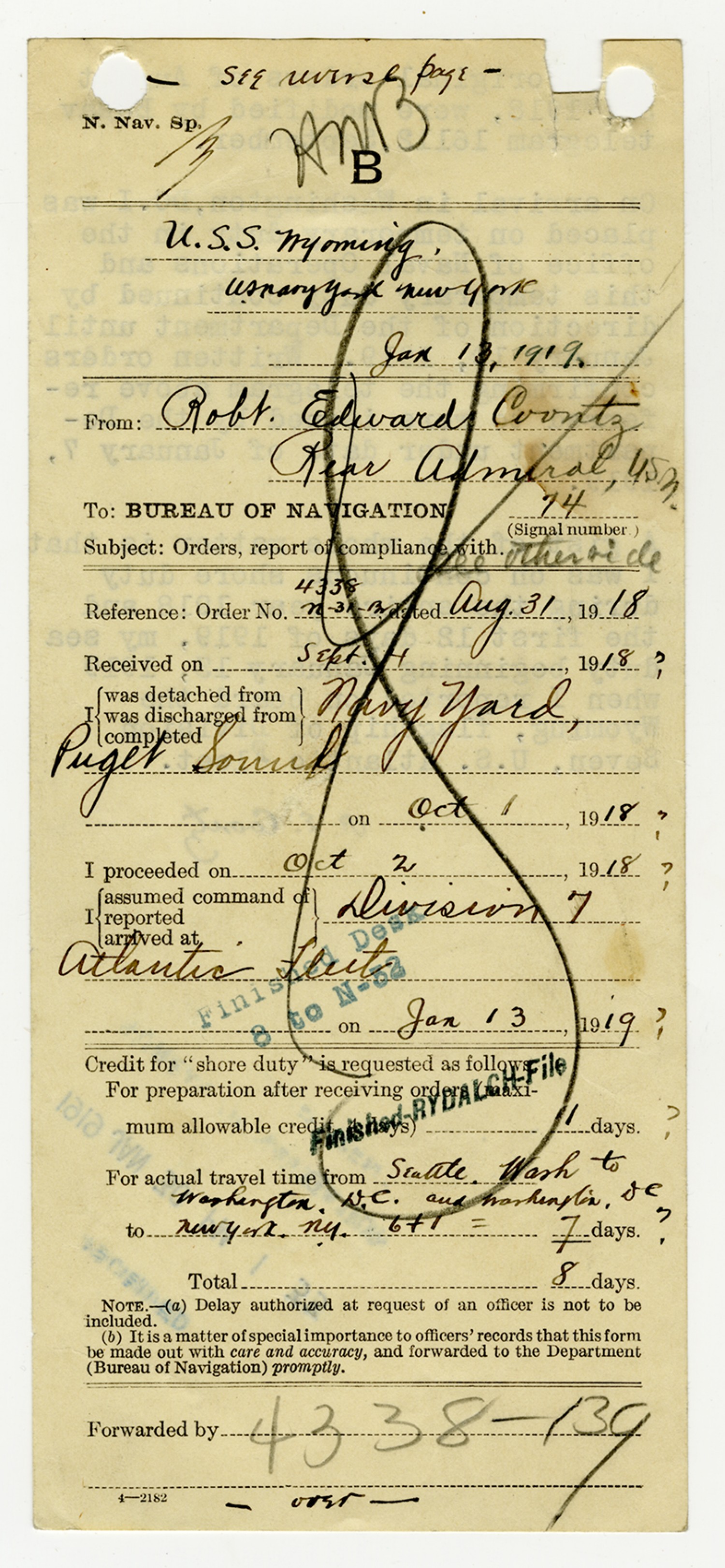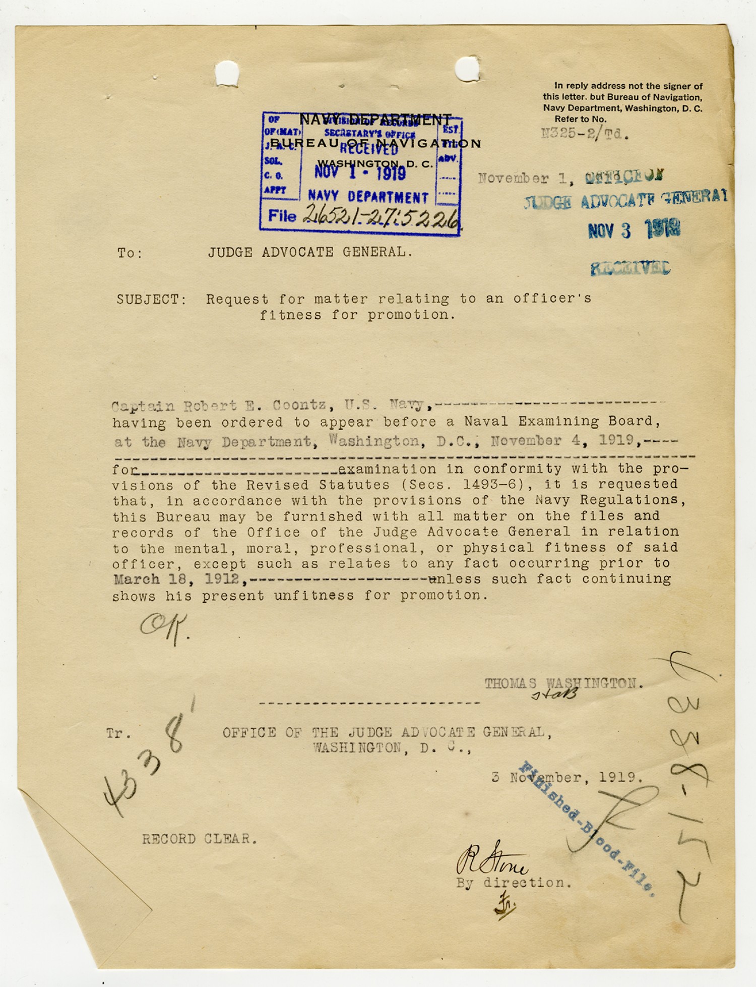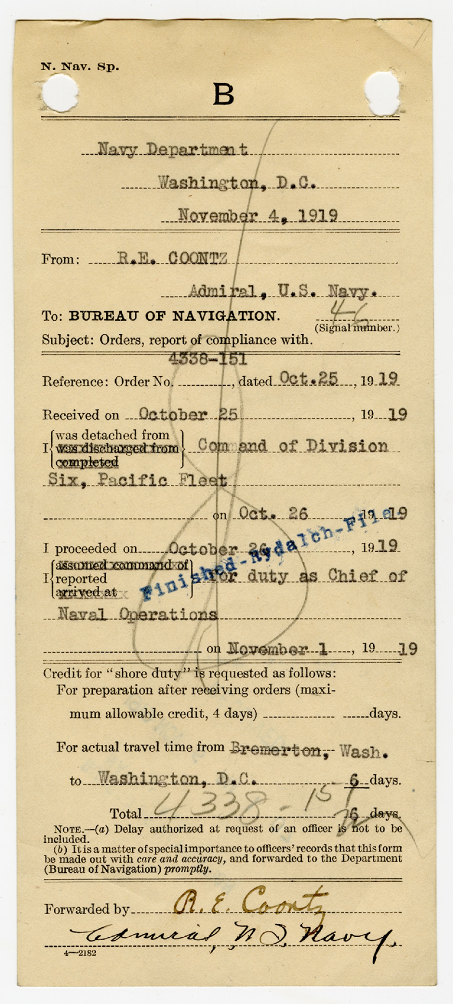 Robert E. Coontz letter to the Bureau of Navigation - November 13, 1919