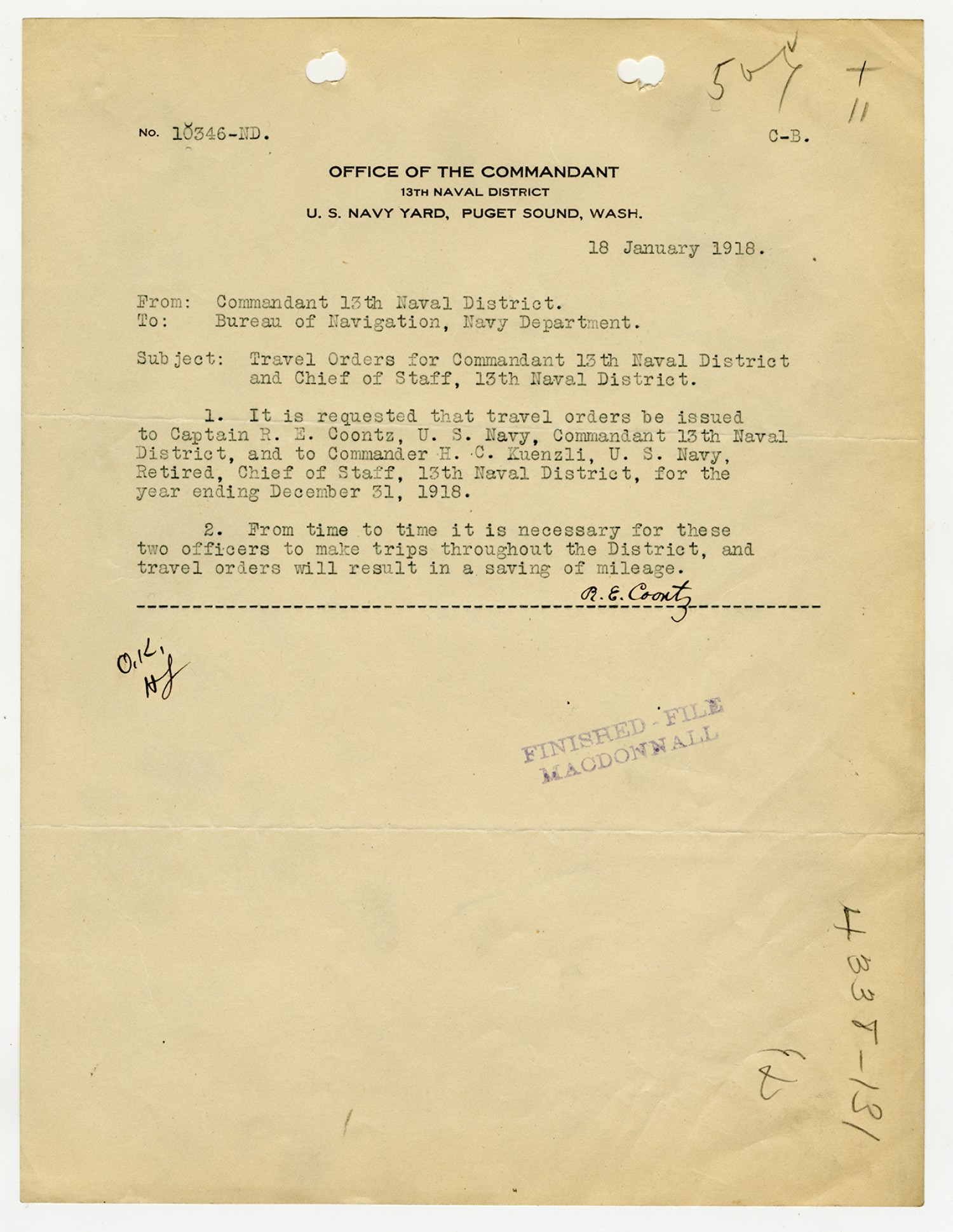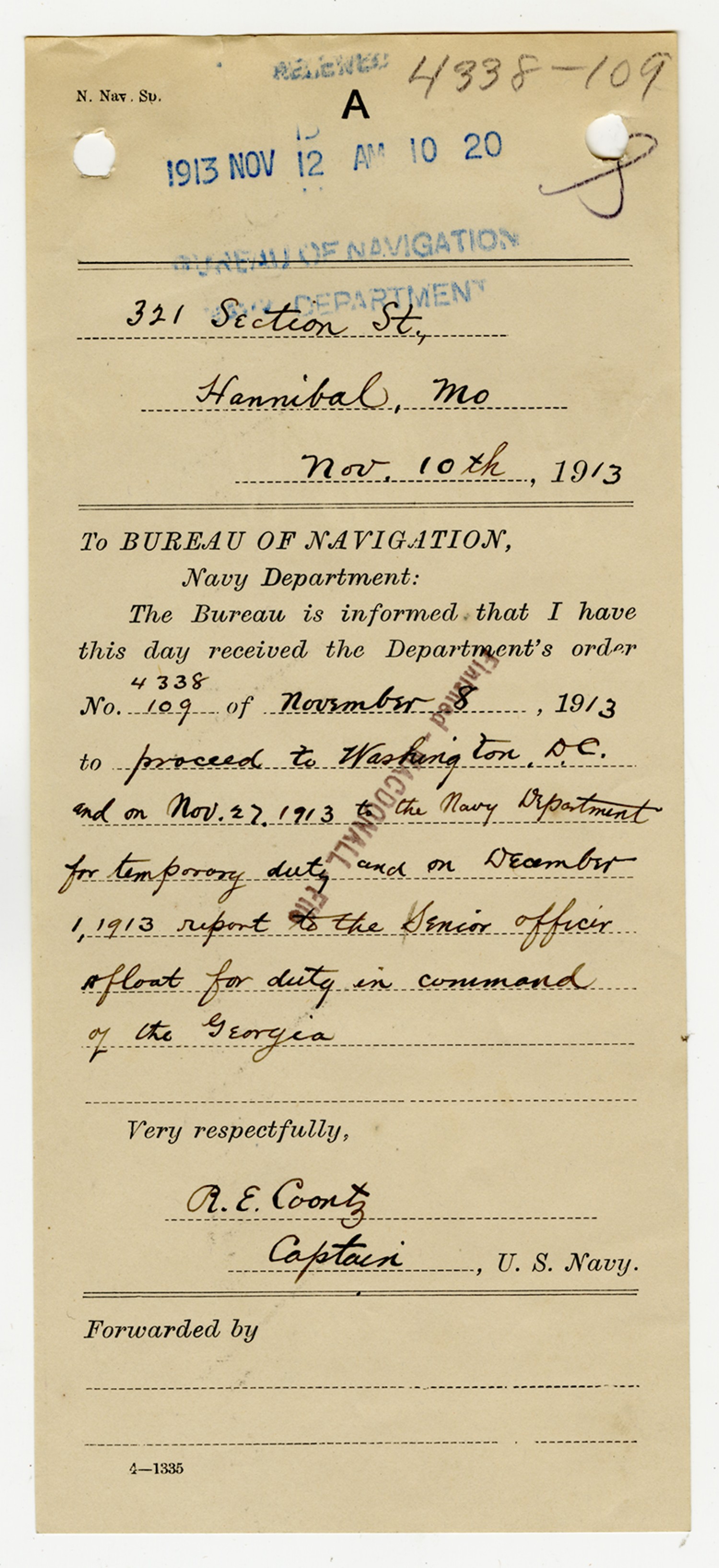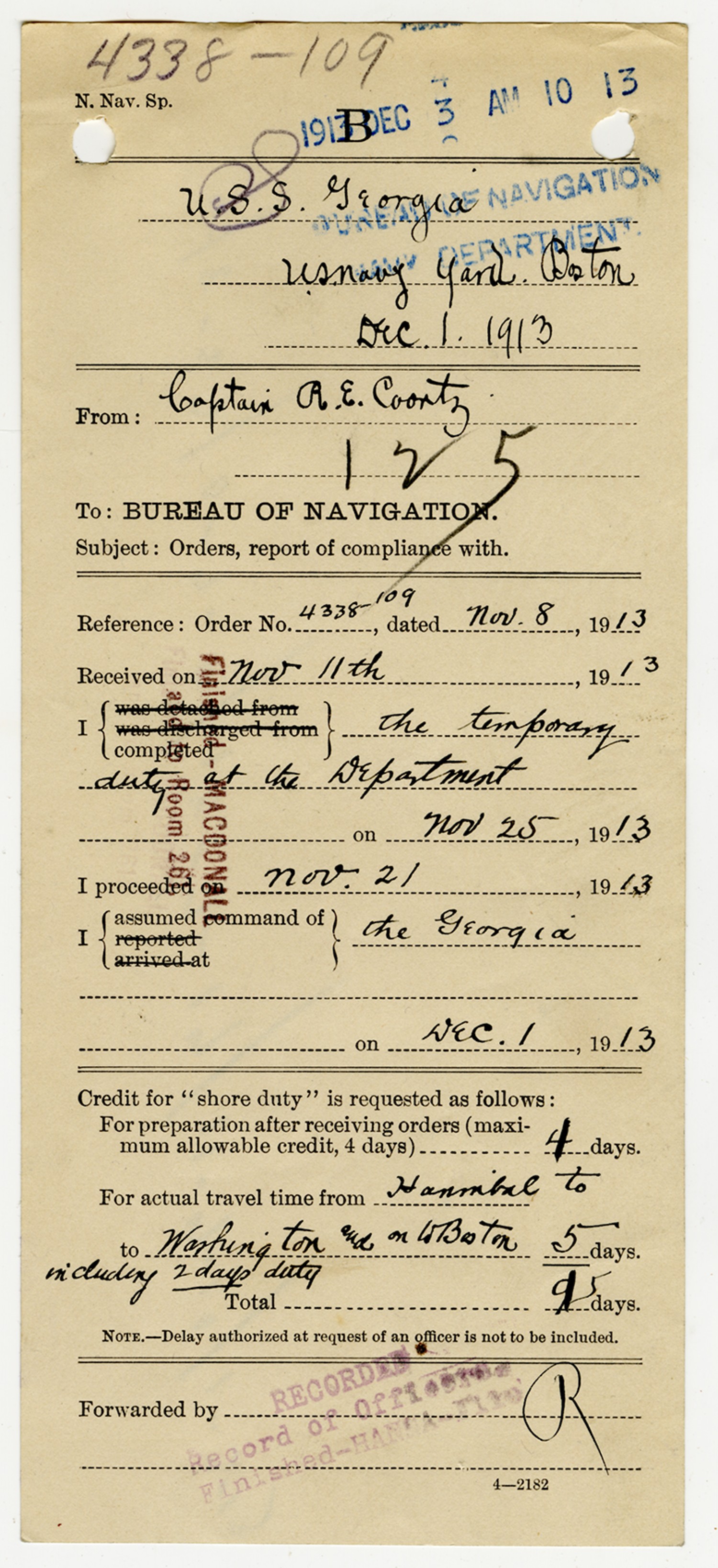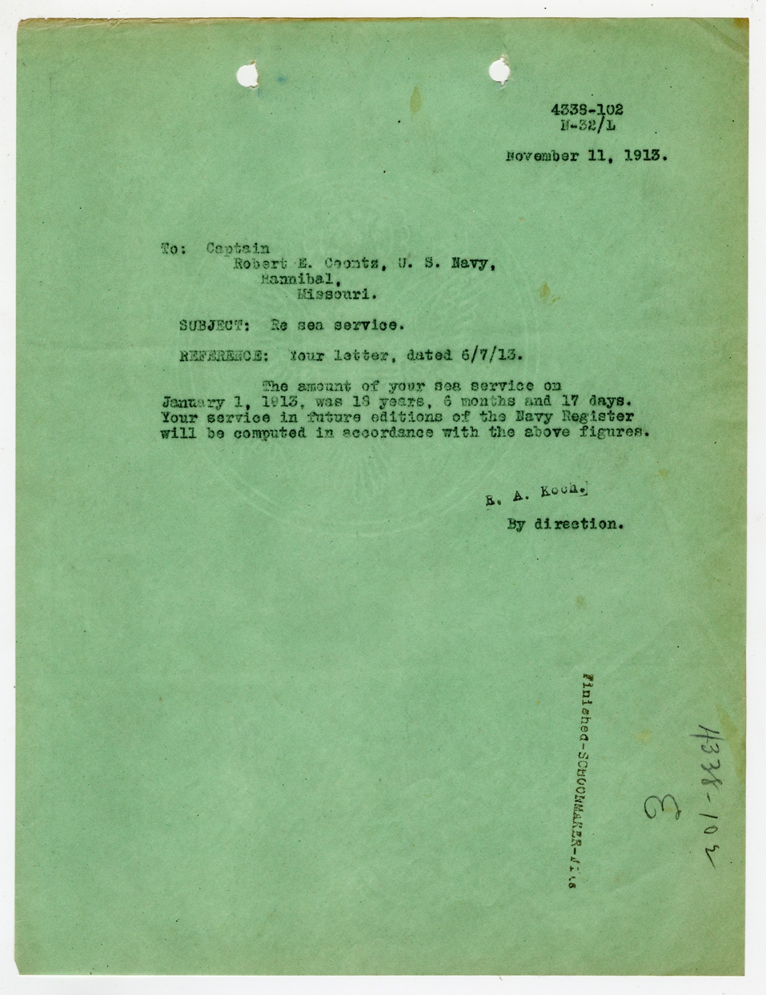 Robert E. Coontz letter to the Bureau of Navigation - November 13, 1919