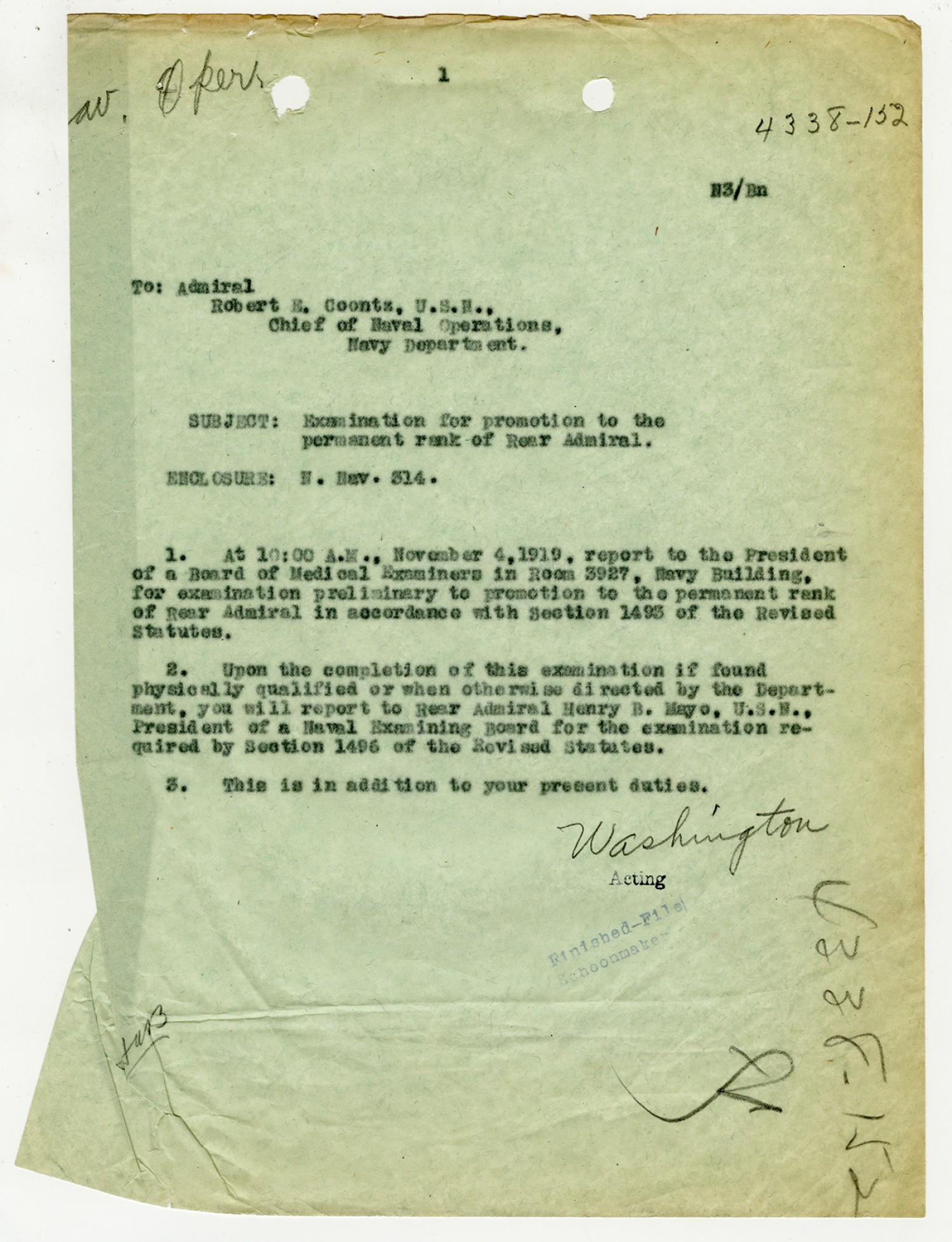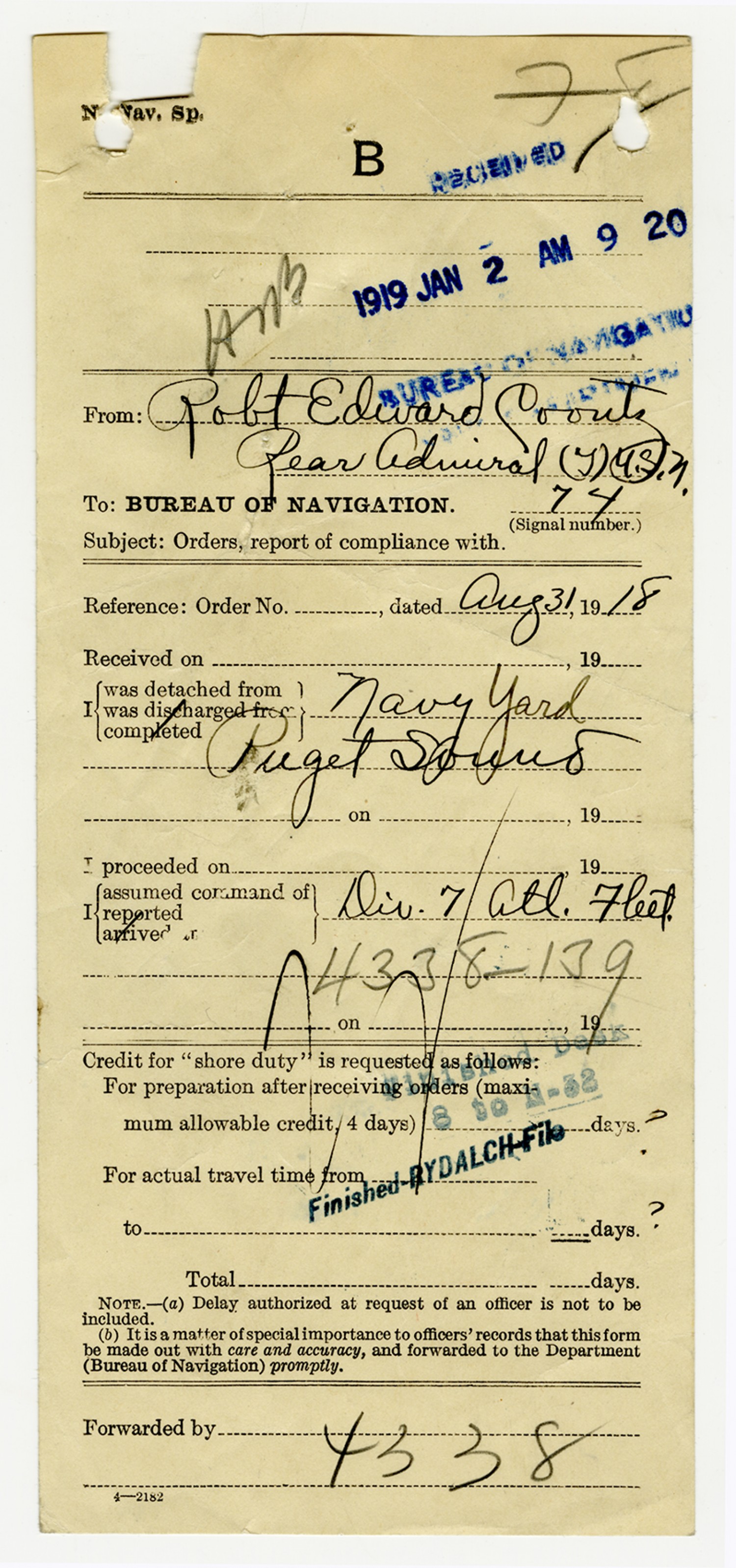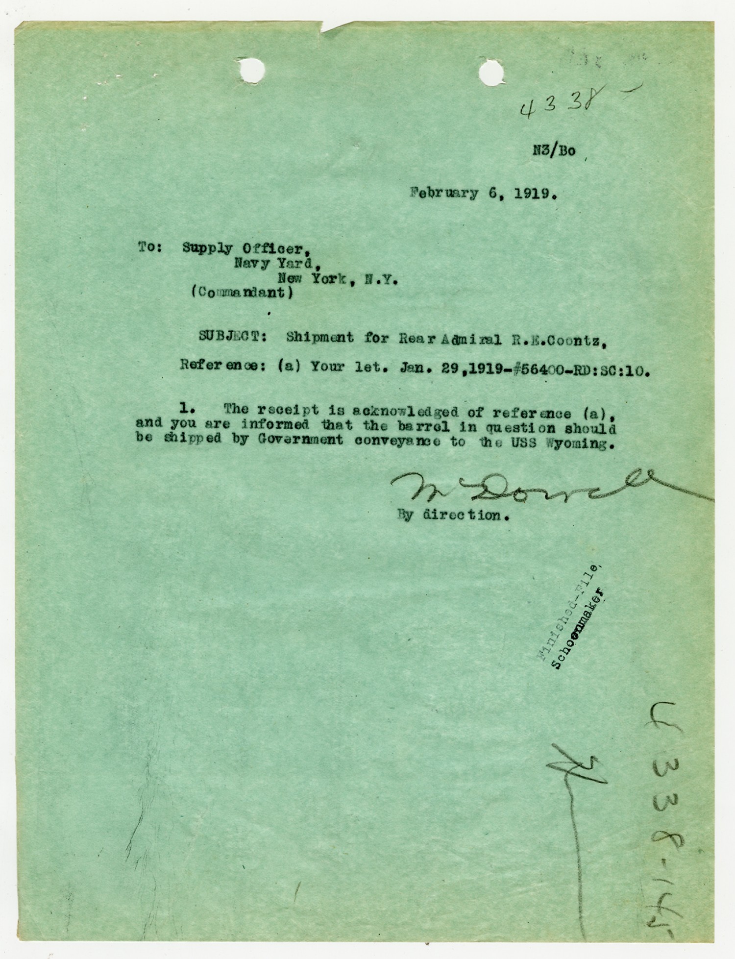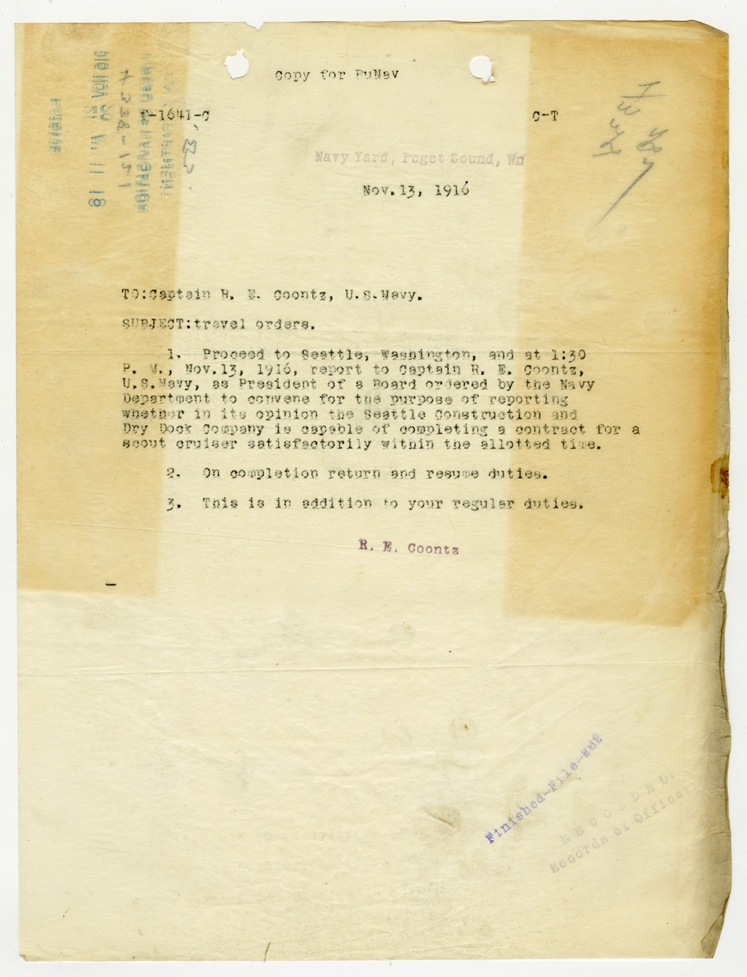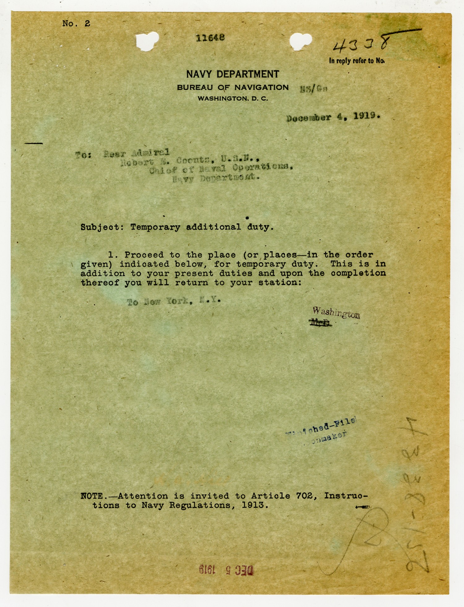 Robert E. Coontz letter to the Bureau of Navigation - November 13, 1919