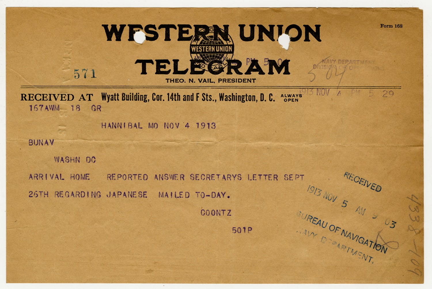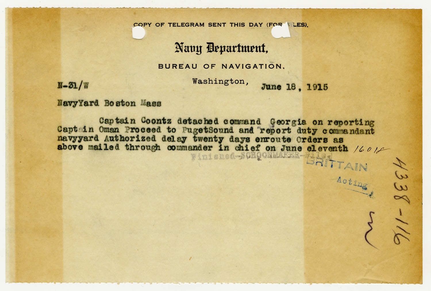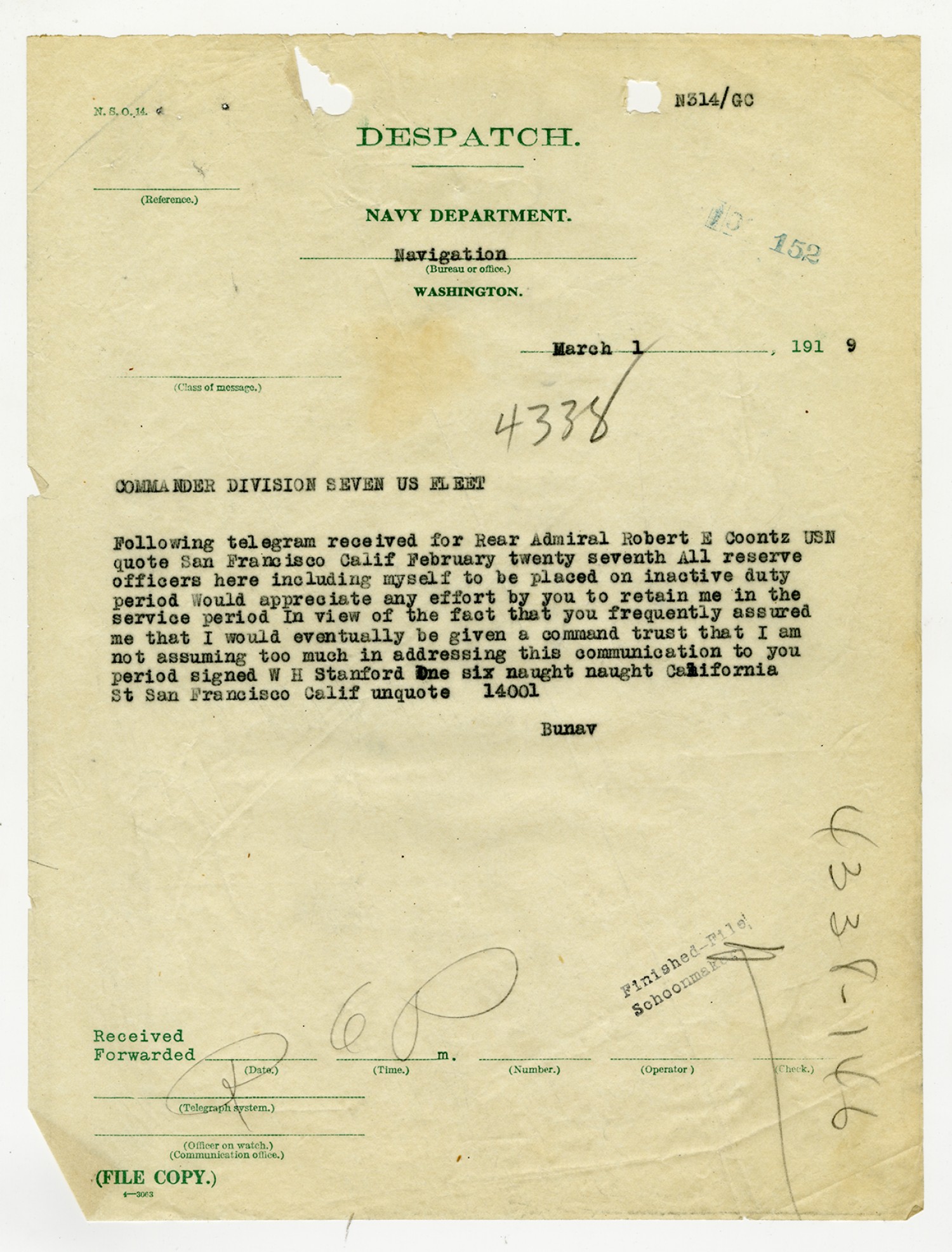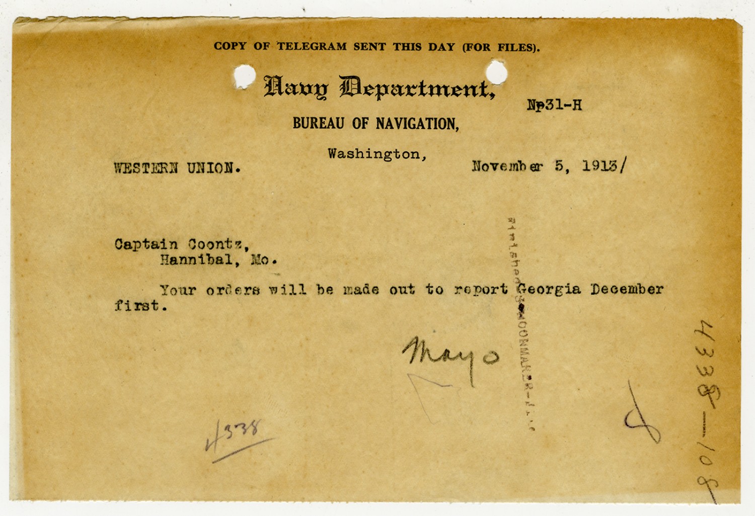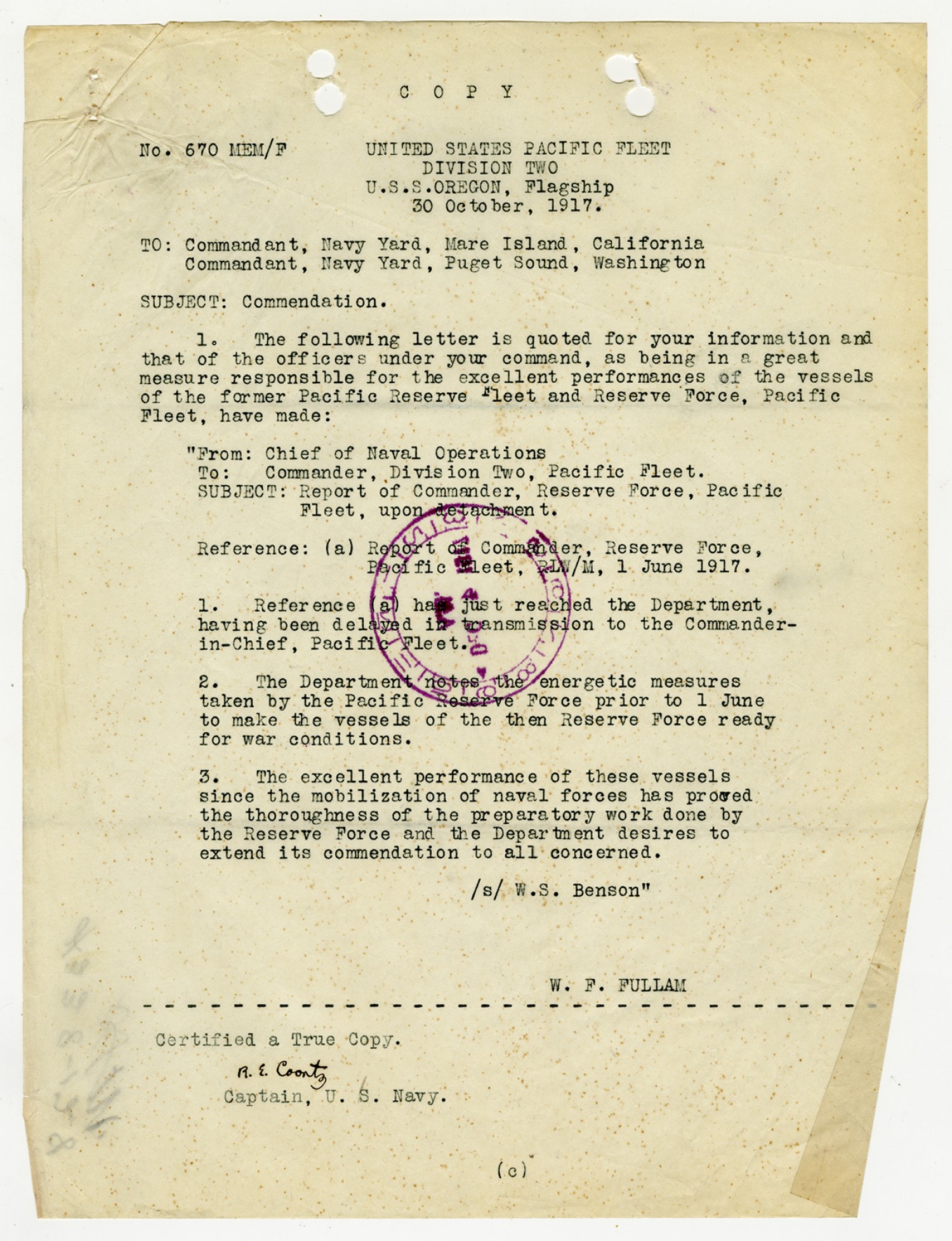 Robert E. Coontz letter to the Bureau of Navigation - November 13, 1919