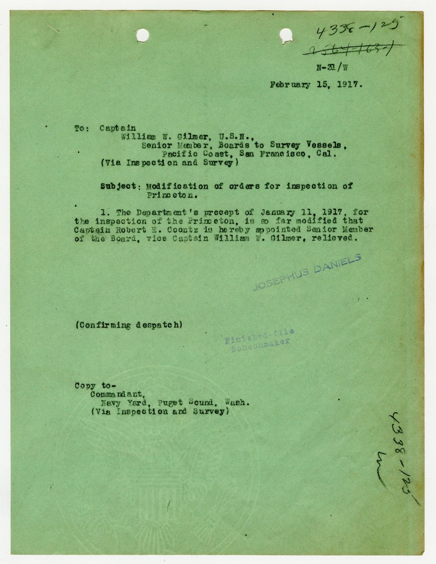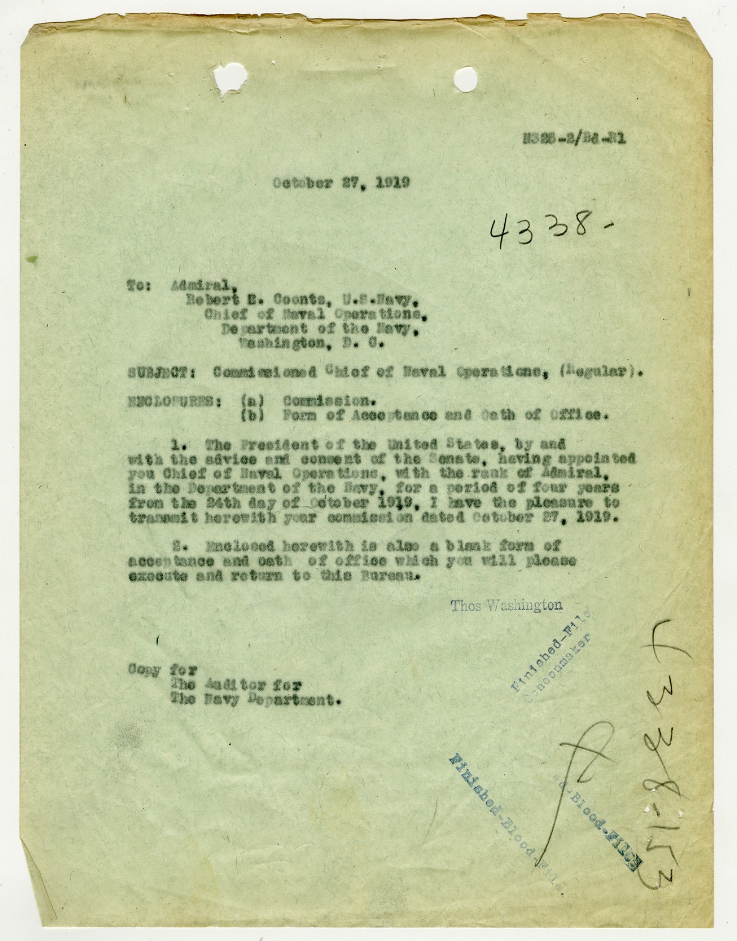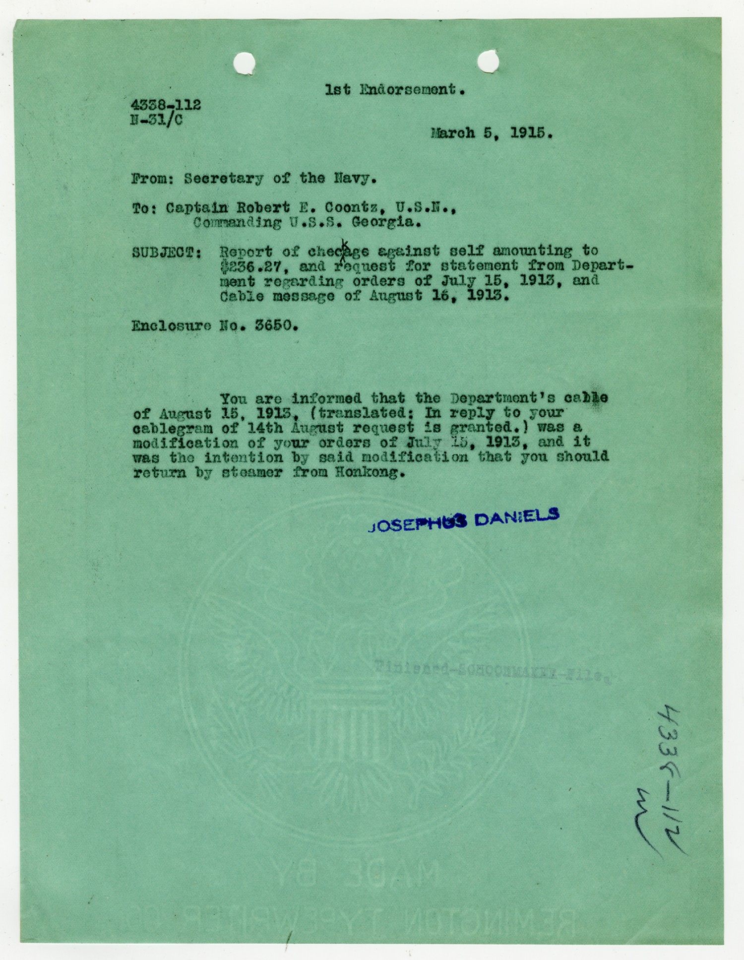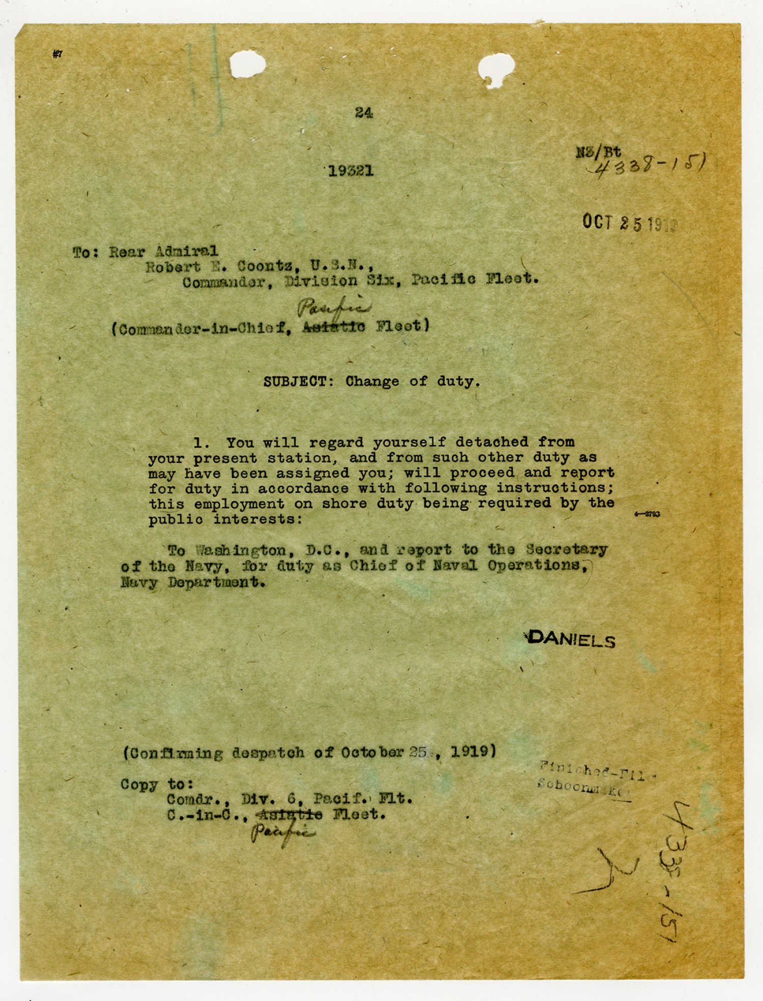 Josephus Daniels letter to Robert E. Coontz - October 25, 1919