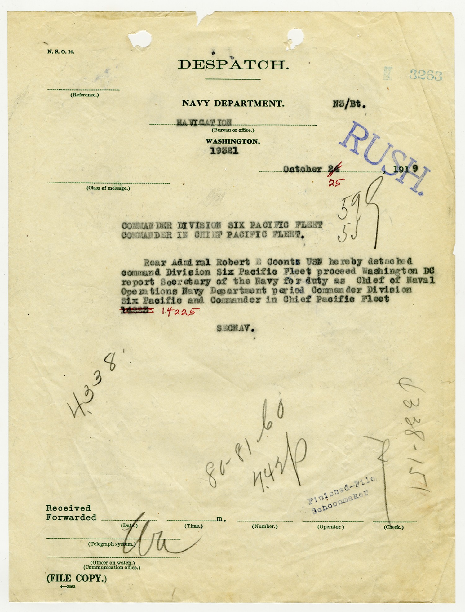 Secretary of the Navy letter the Commander in Chief of the Pacific Fleet - October 25, 1919
