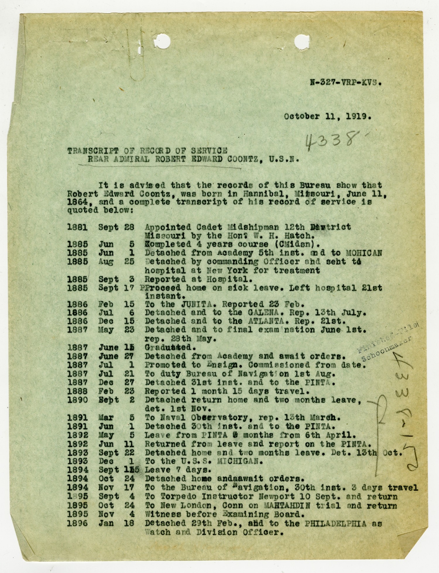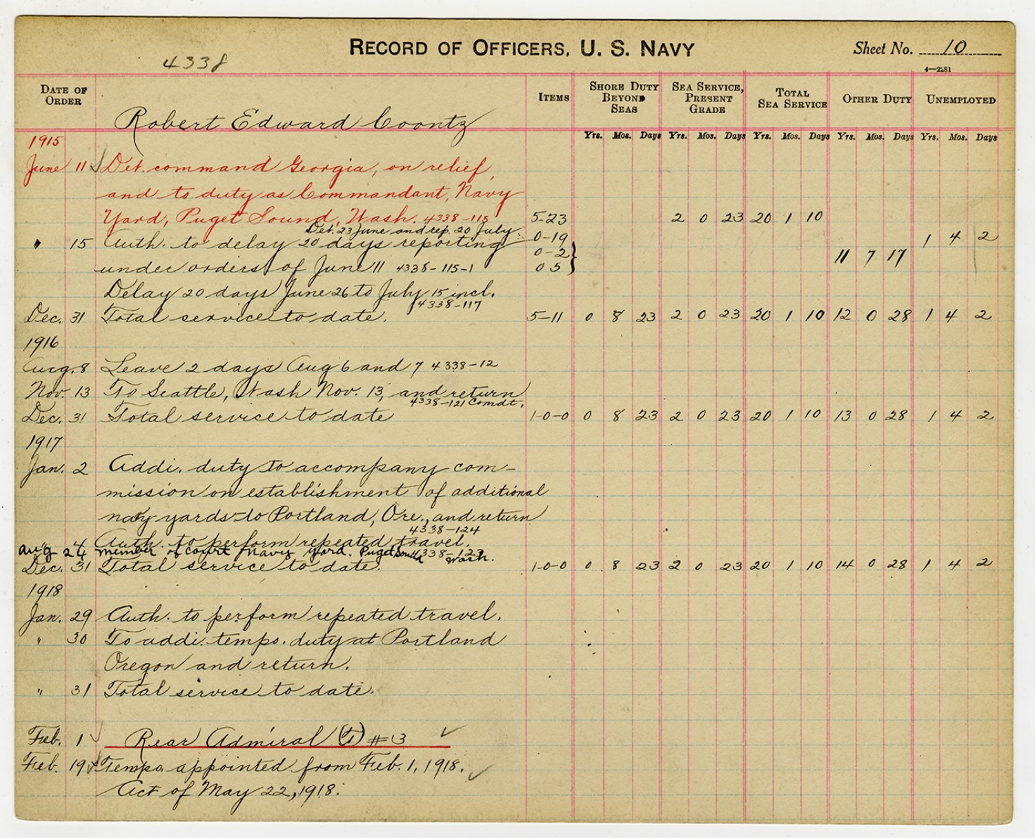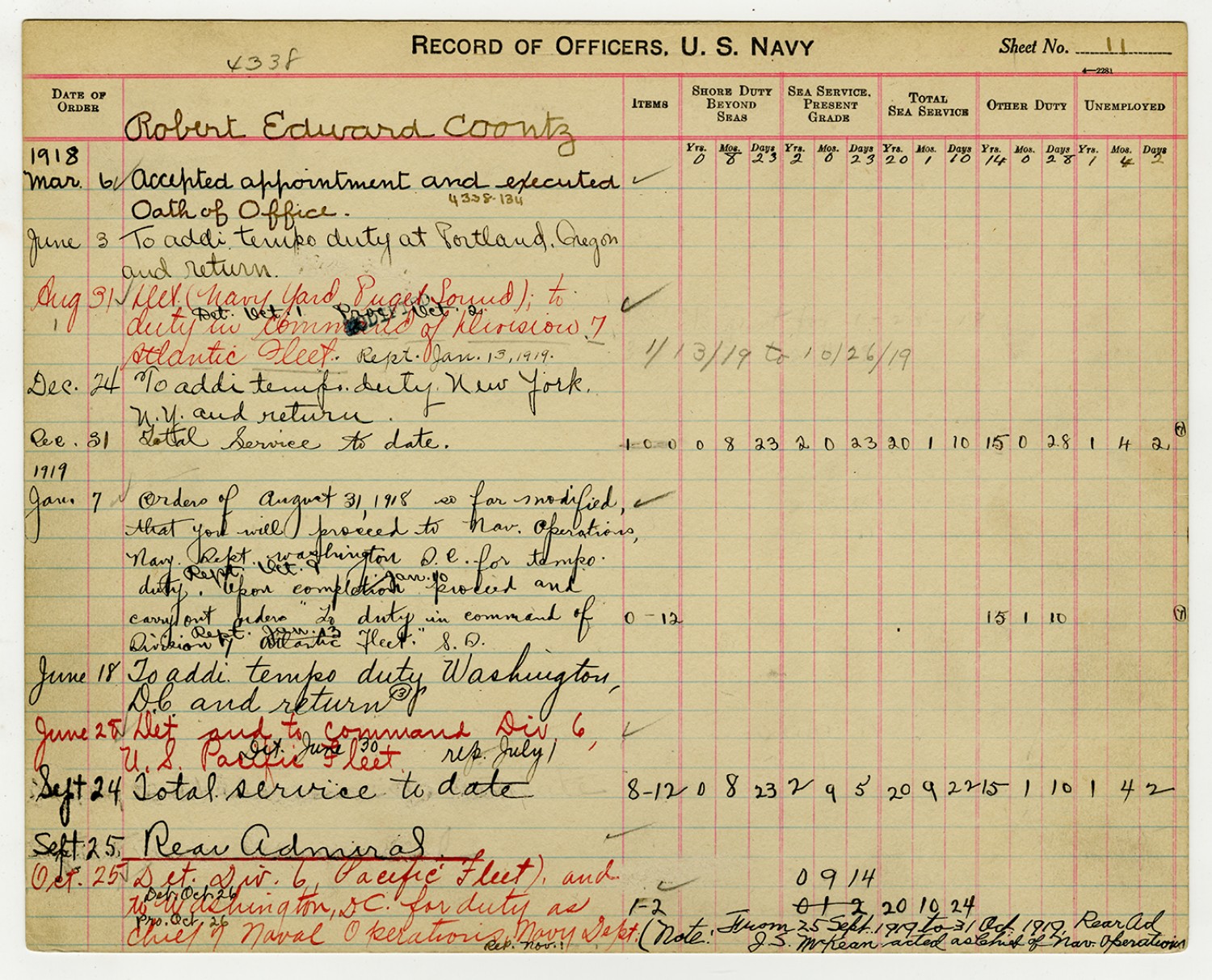 Record of Service for Robert E. Coontz - October 11, 1919