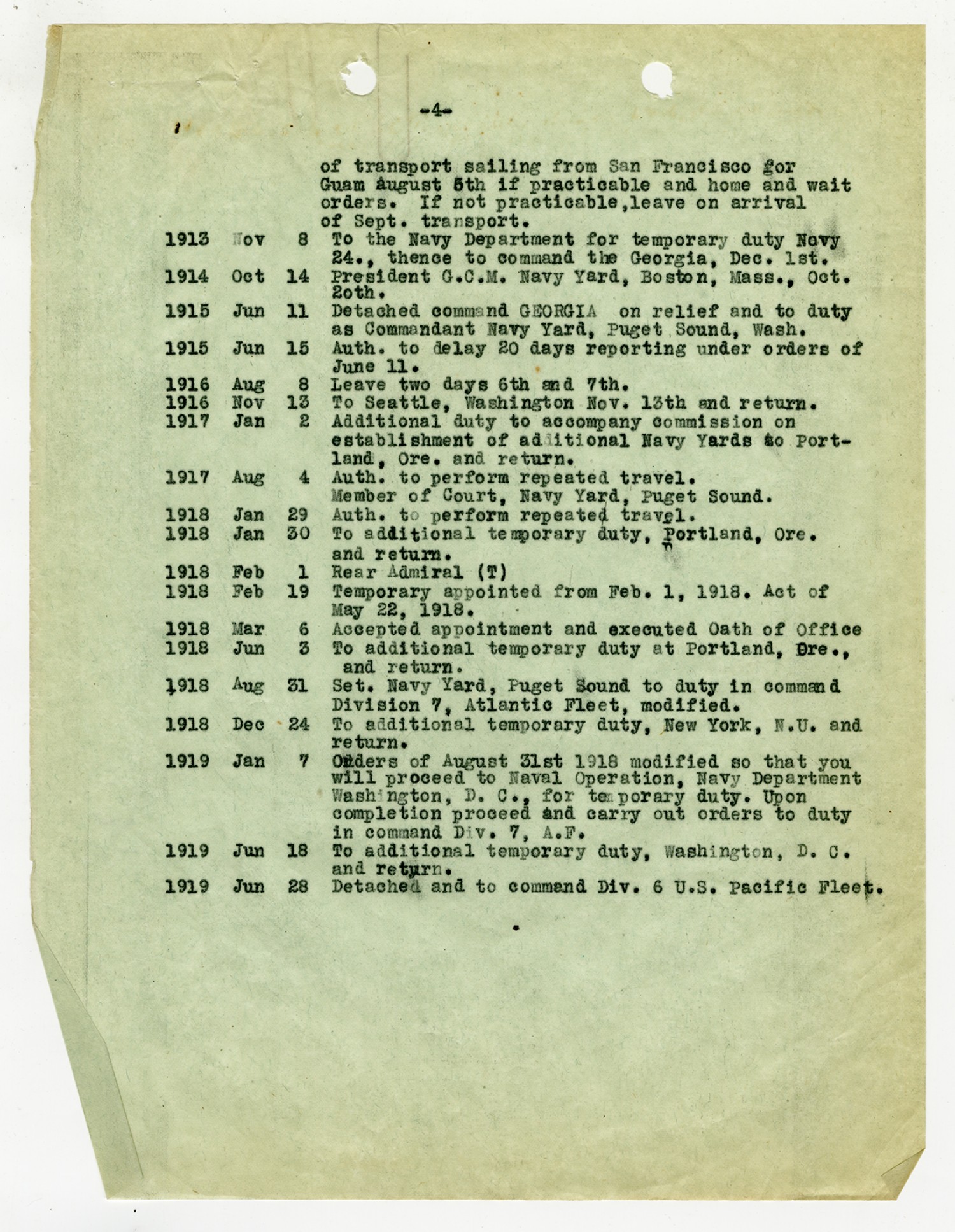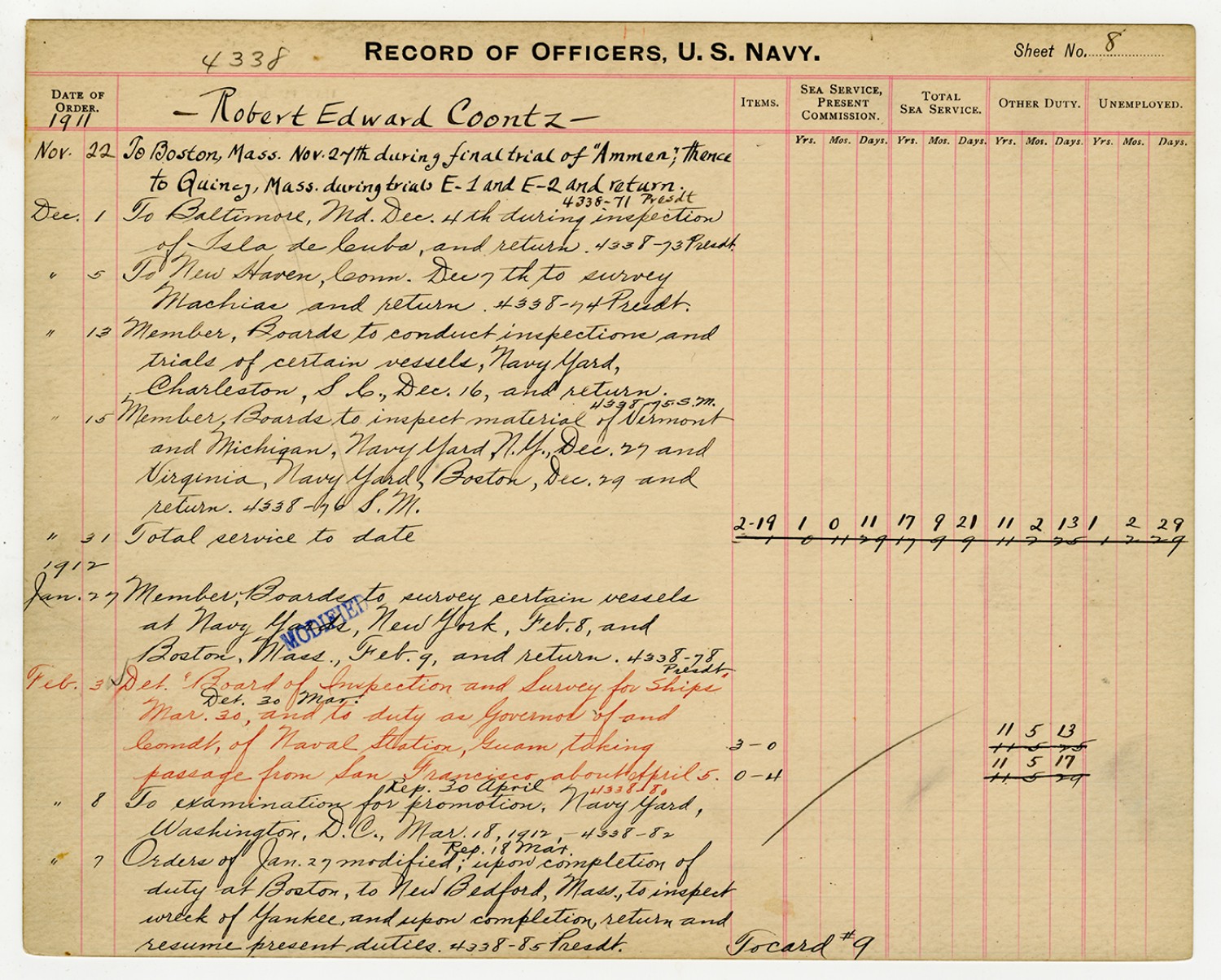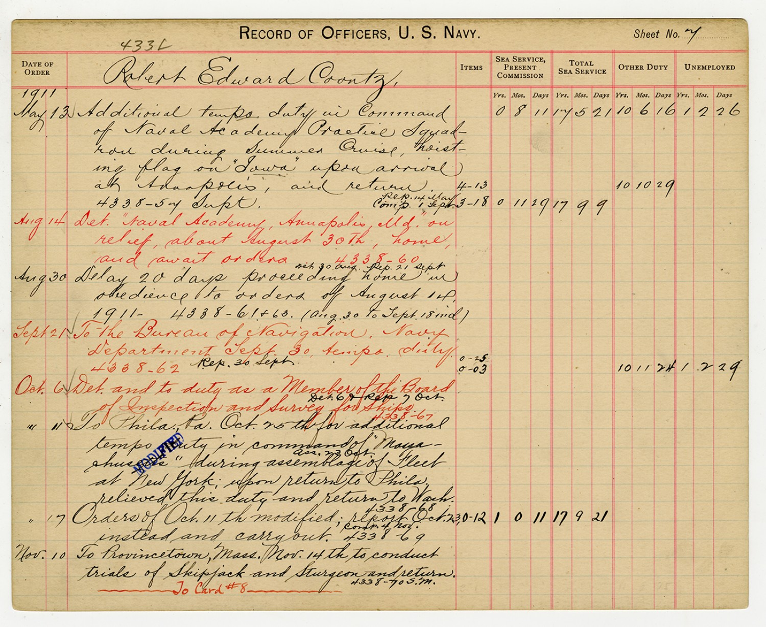 Record of Service for Robert E. Coontz - October 11, 1919