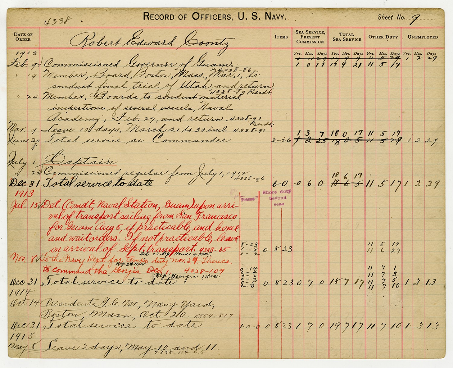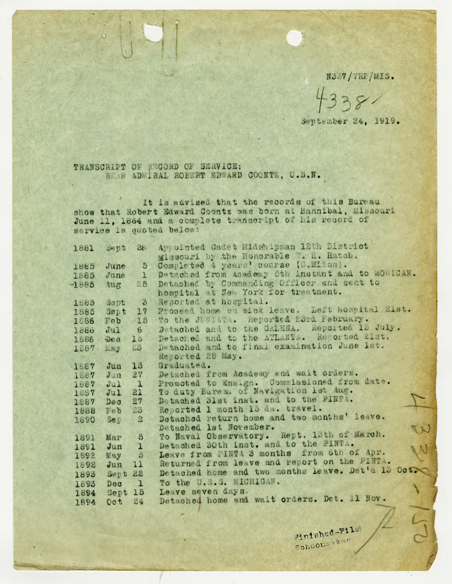 Record of Service for Robert E. Coontz - September 24, 1919