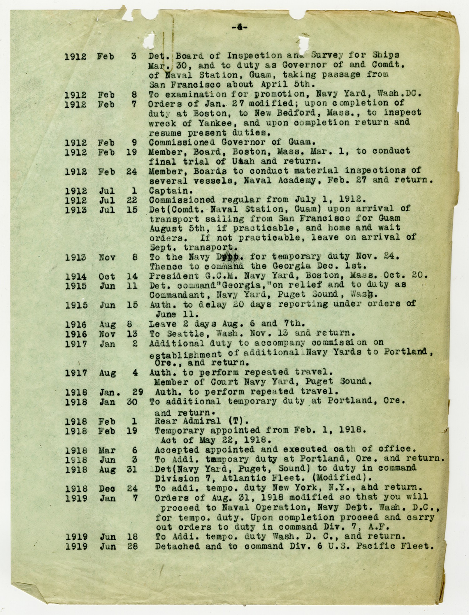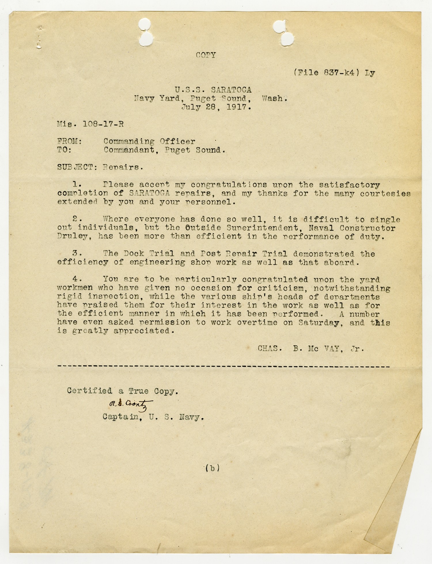 Letter to Commander Division Seven U.S. Fleet - March 1, 1919
