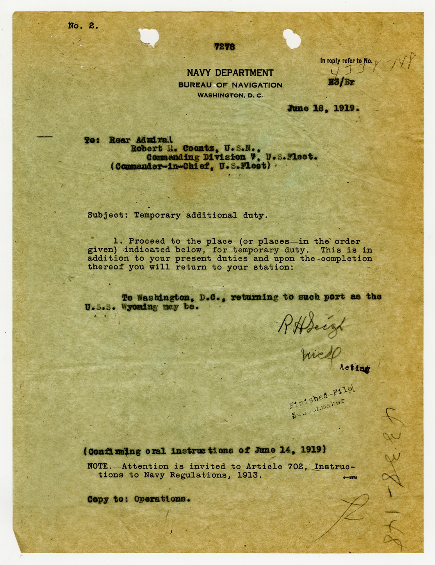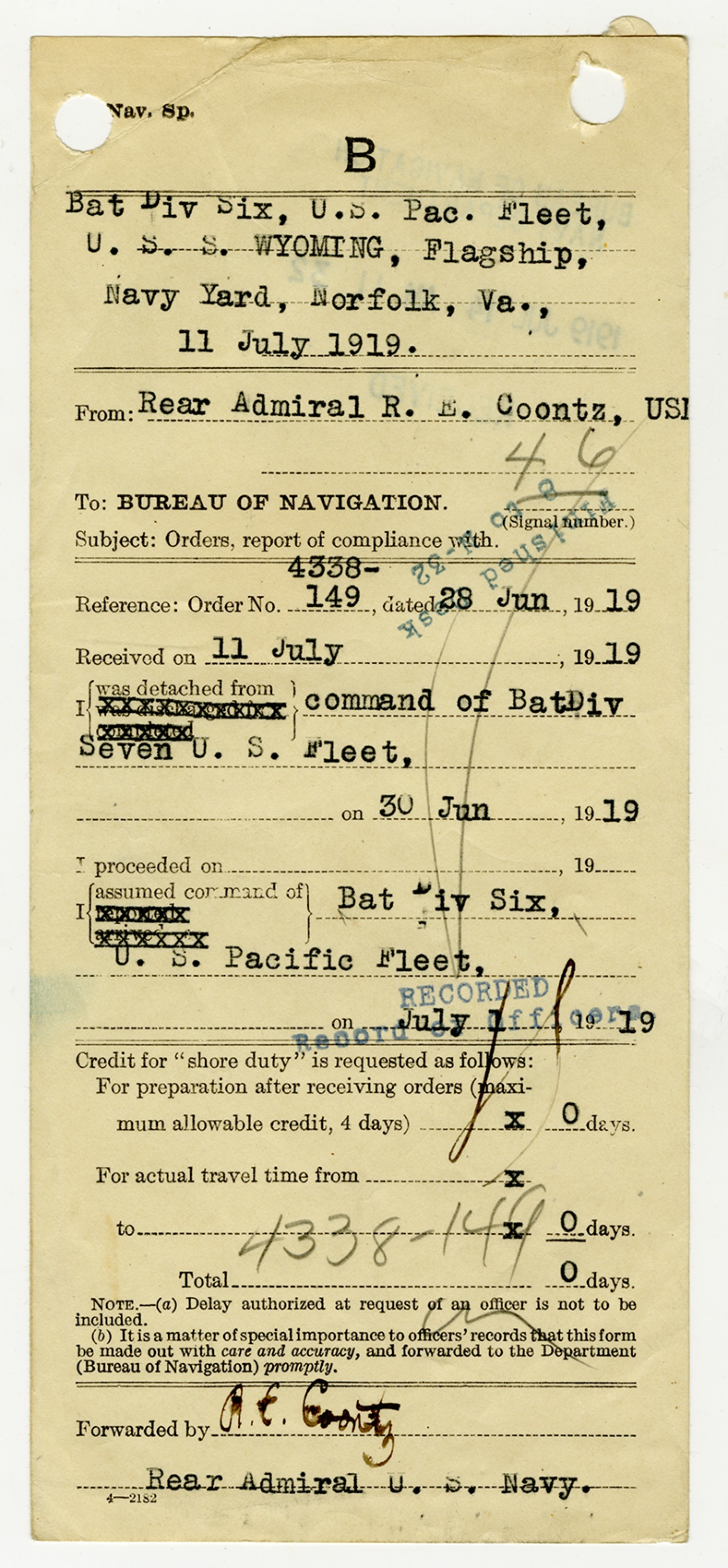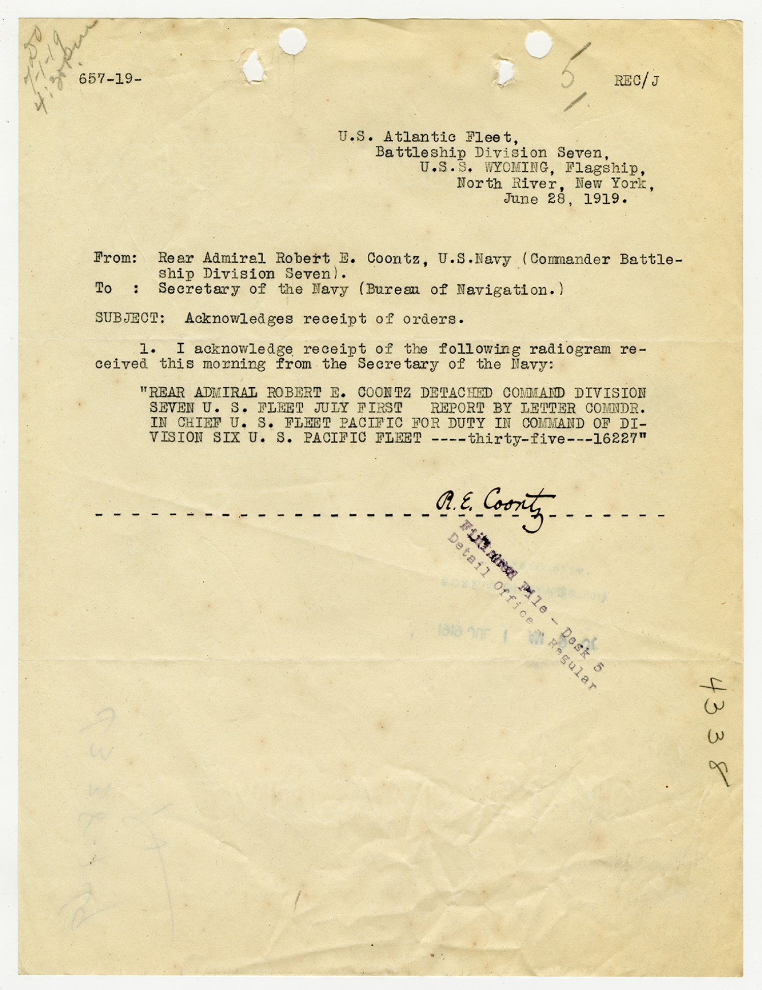 Robert E. Coontz letter to the Secretary of the Navy - June 28, 1919
