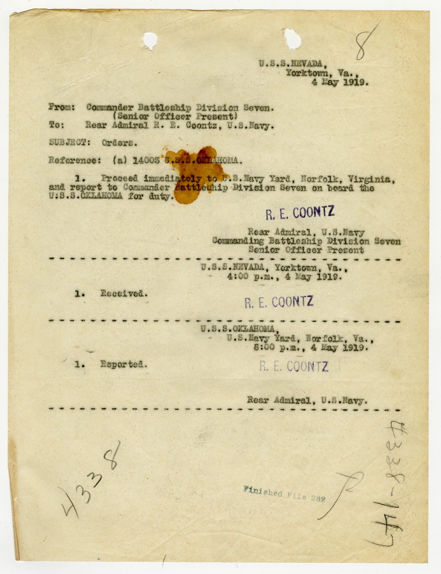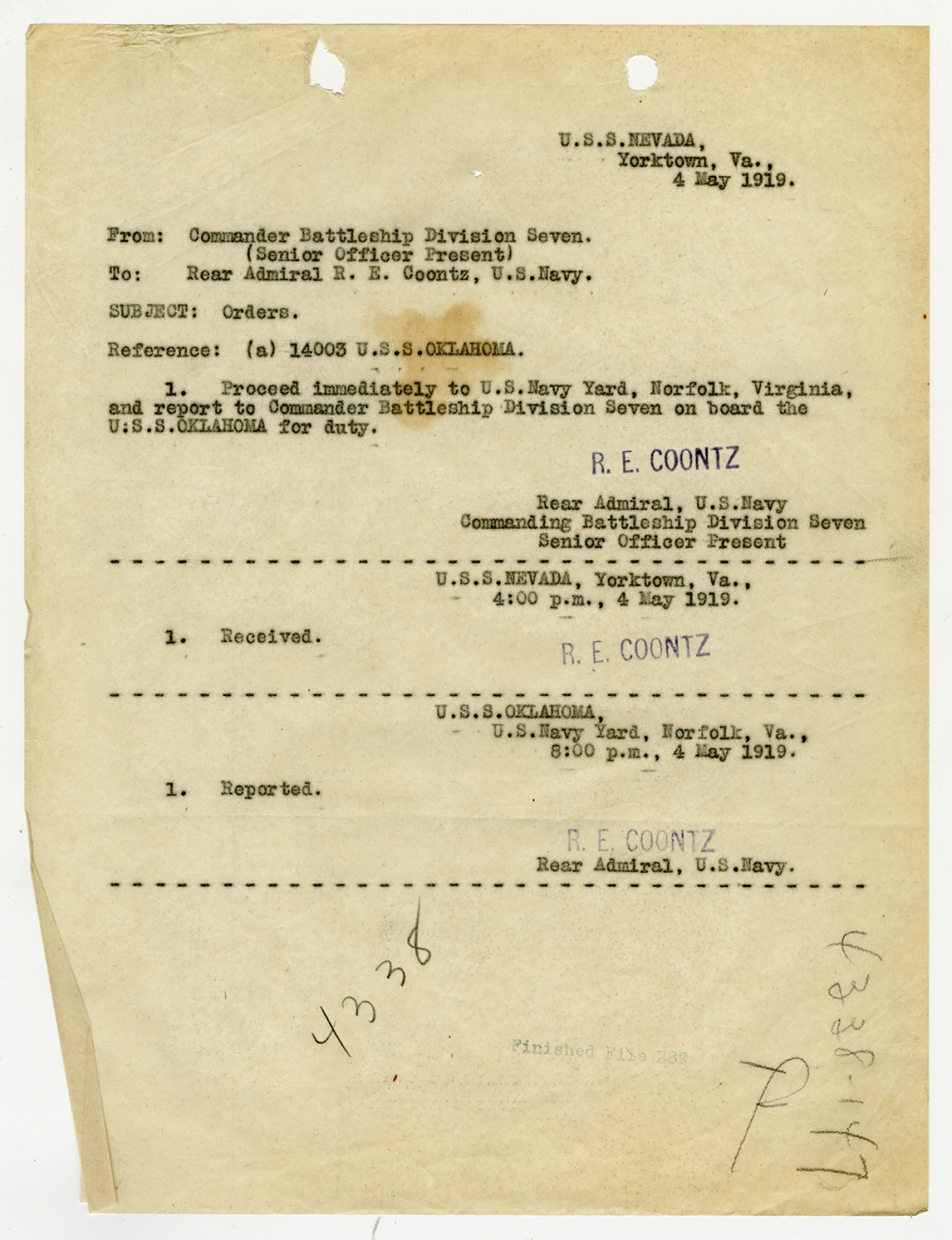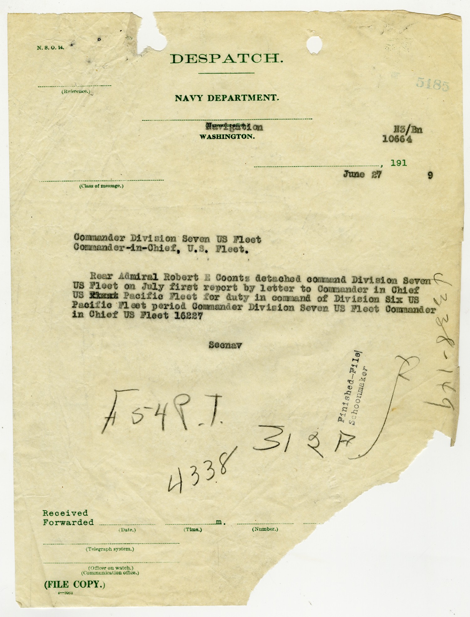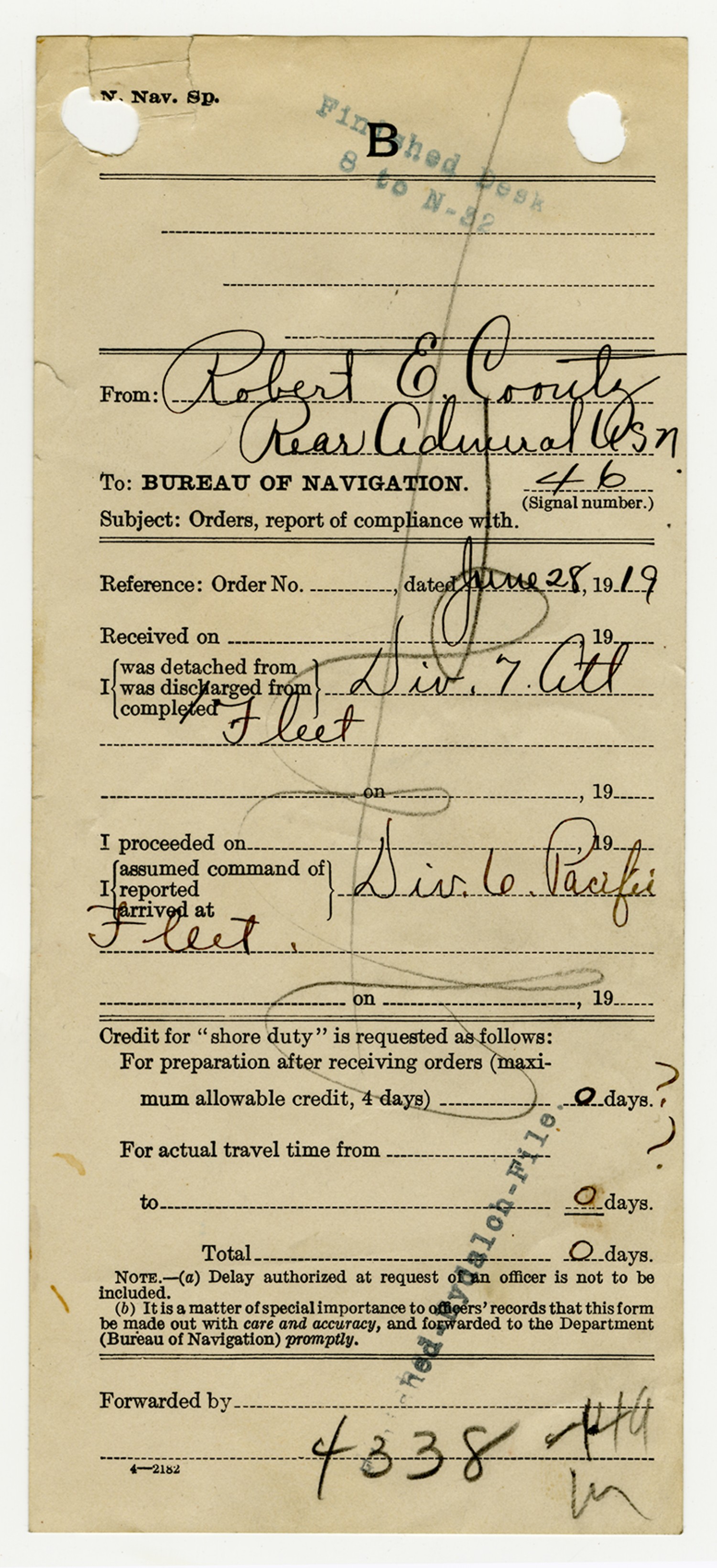 Robert E. Coontz letter to the Secretary of the Navy - June 28, 1919