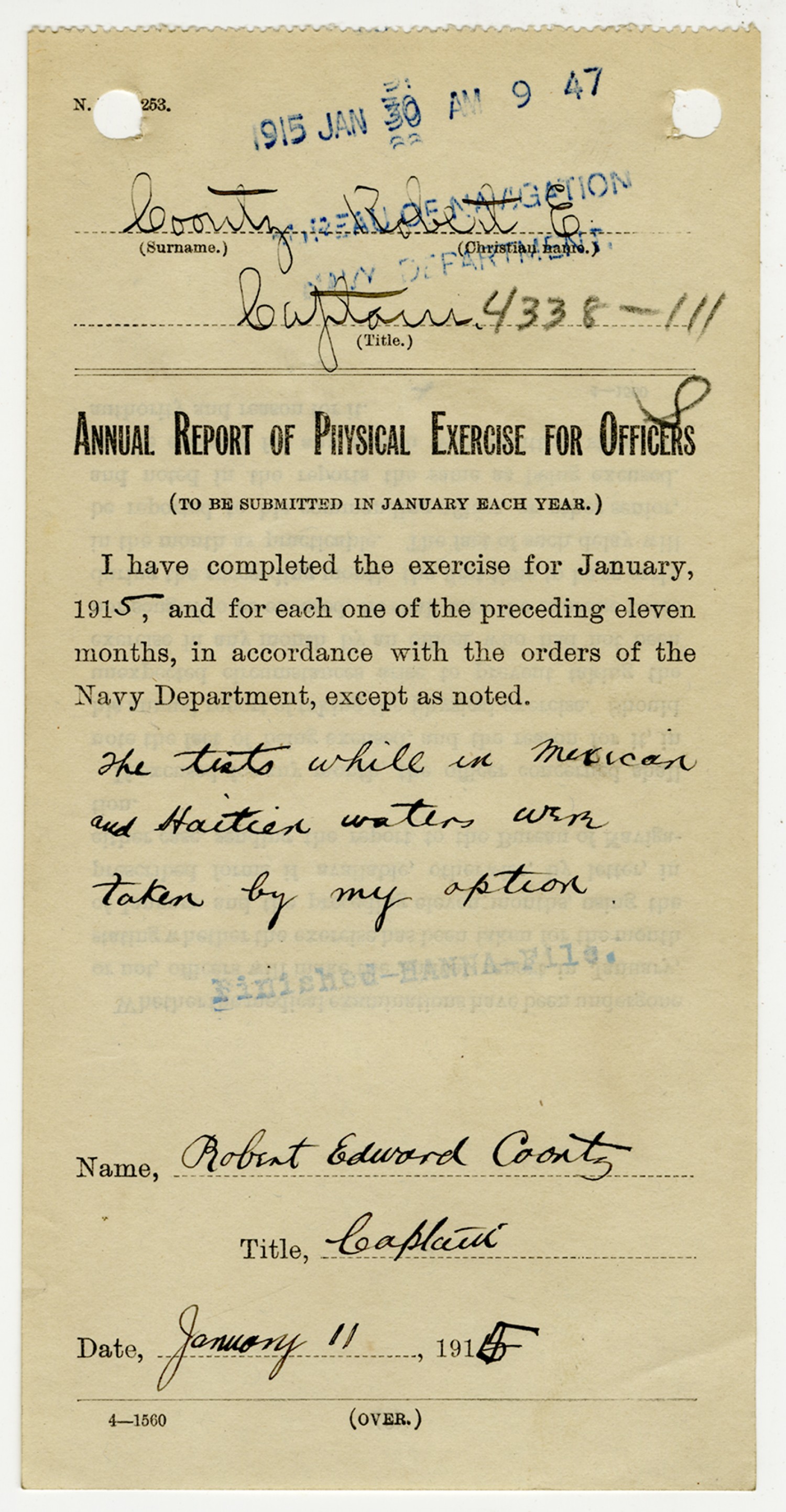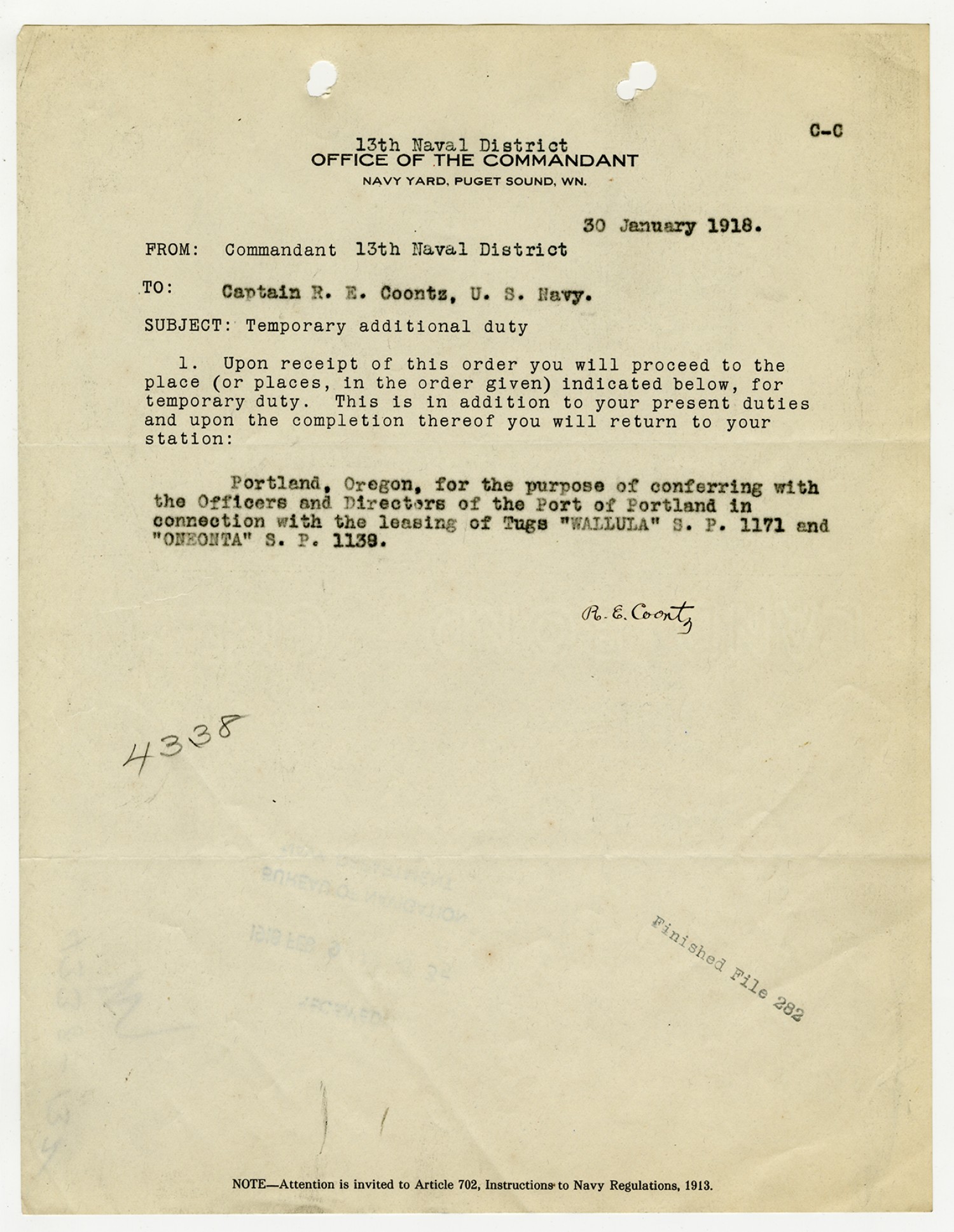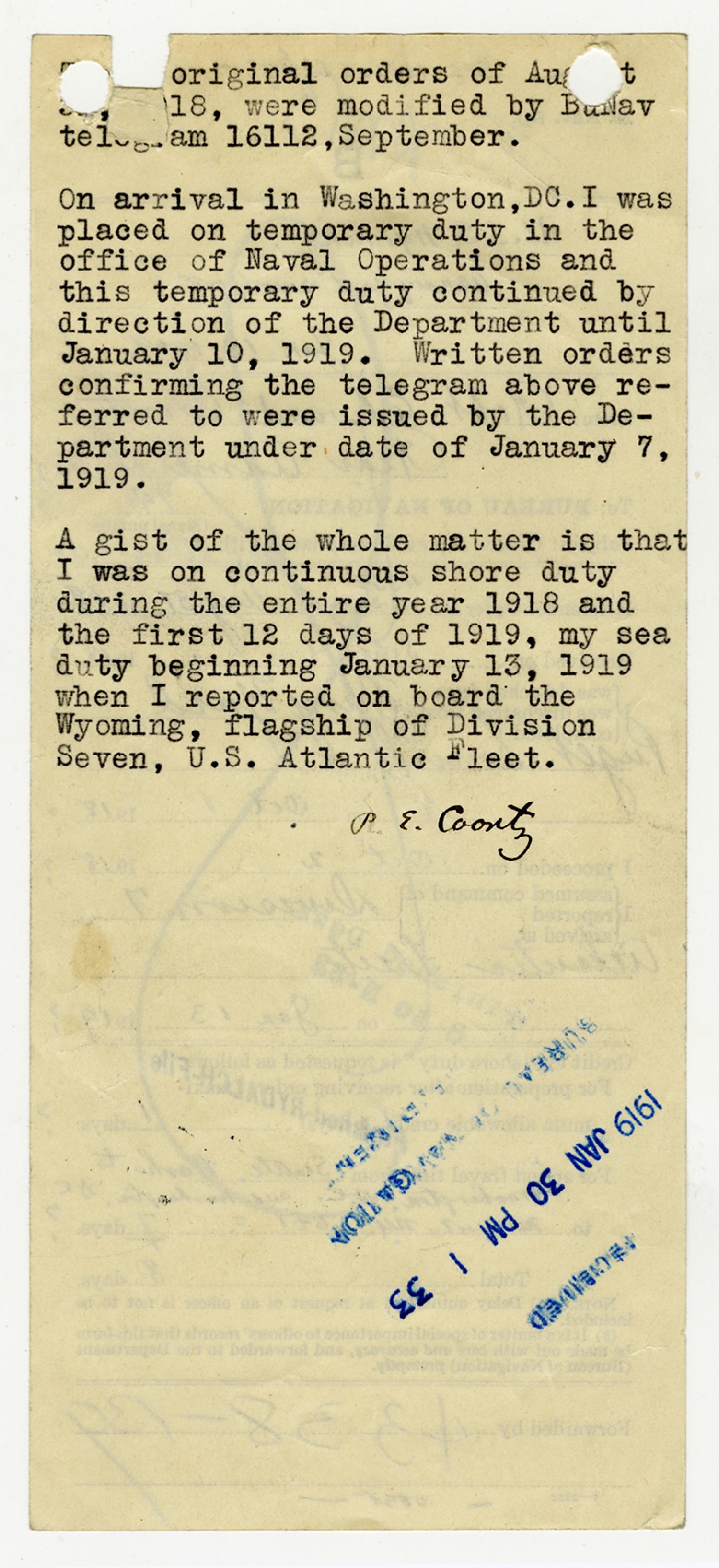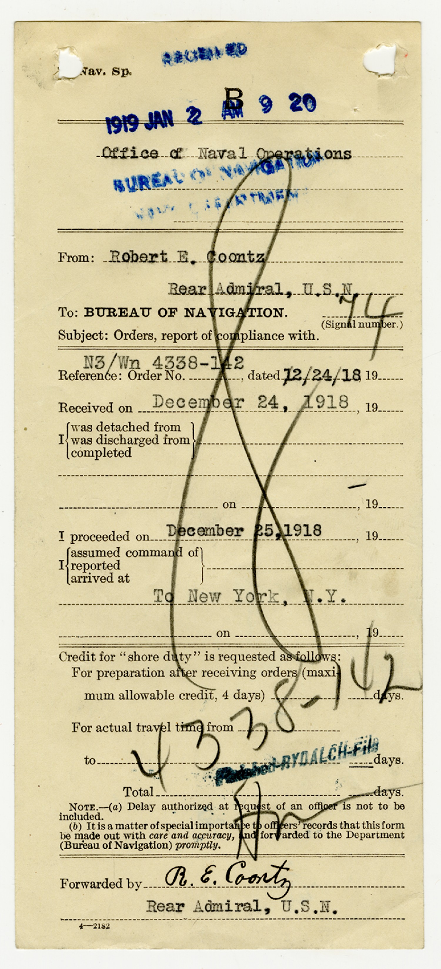 Robert Edward Coontz Compliance with Orders - January 13, 1919
