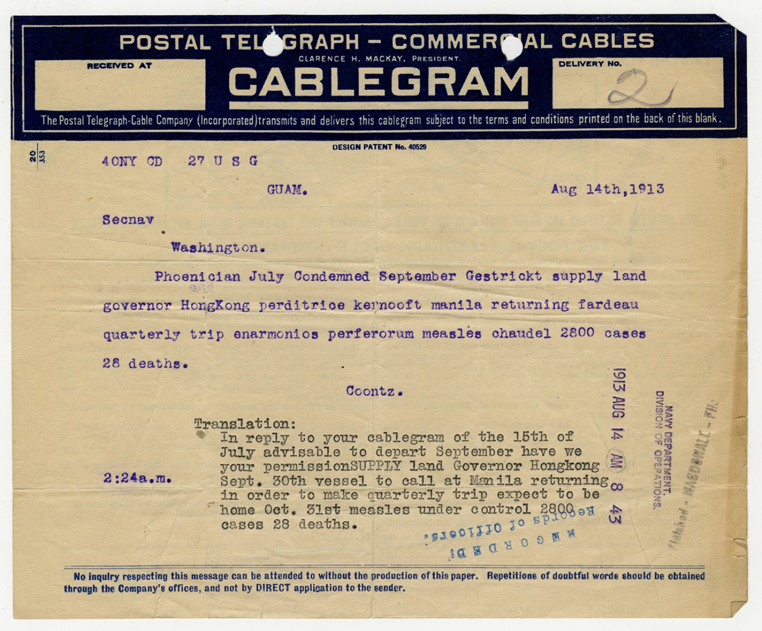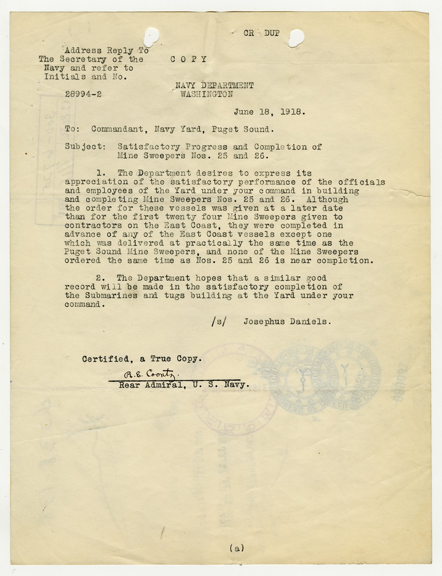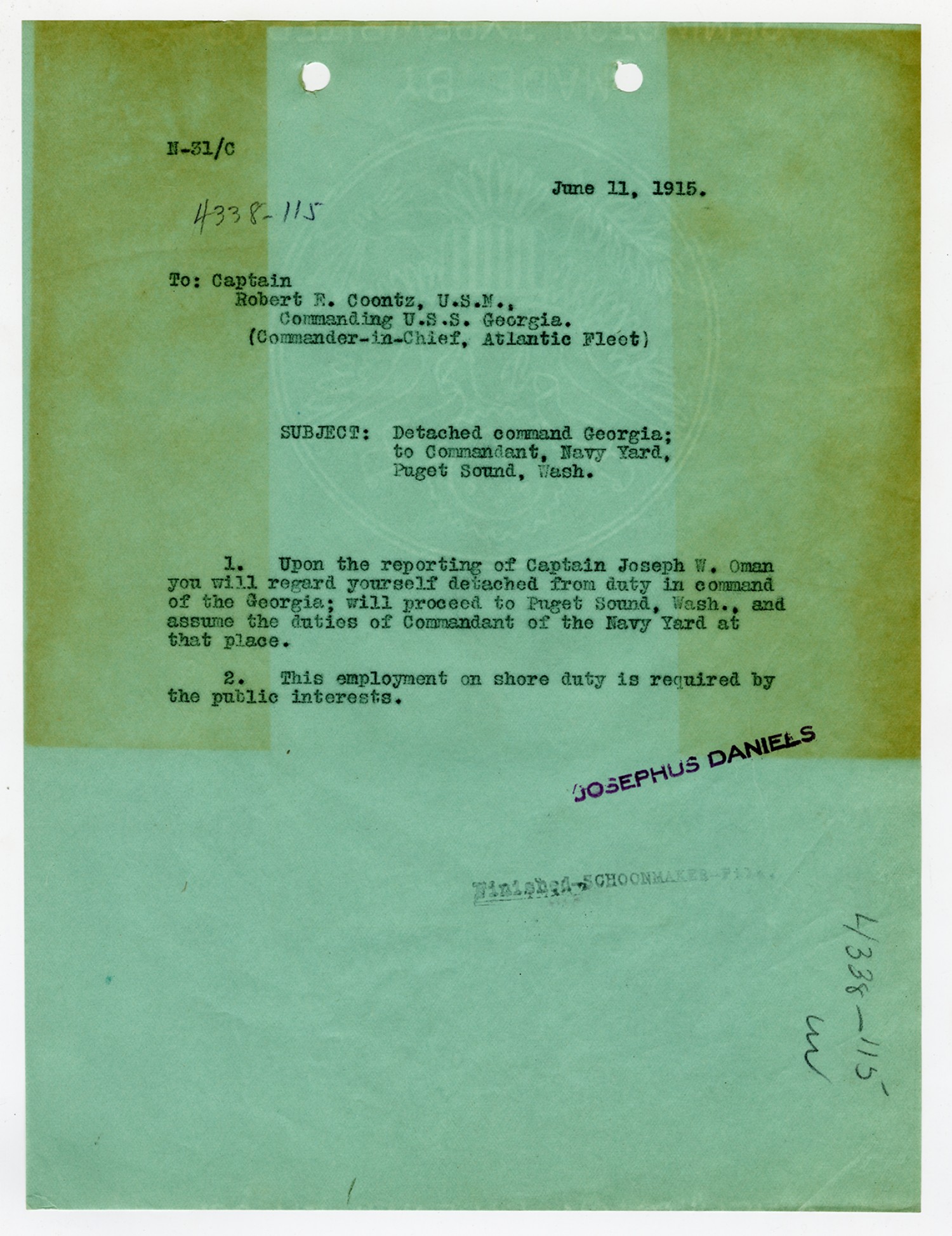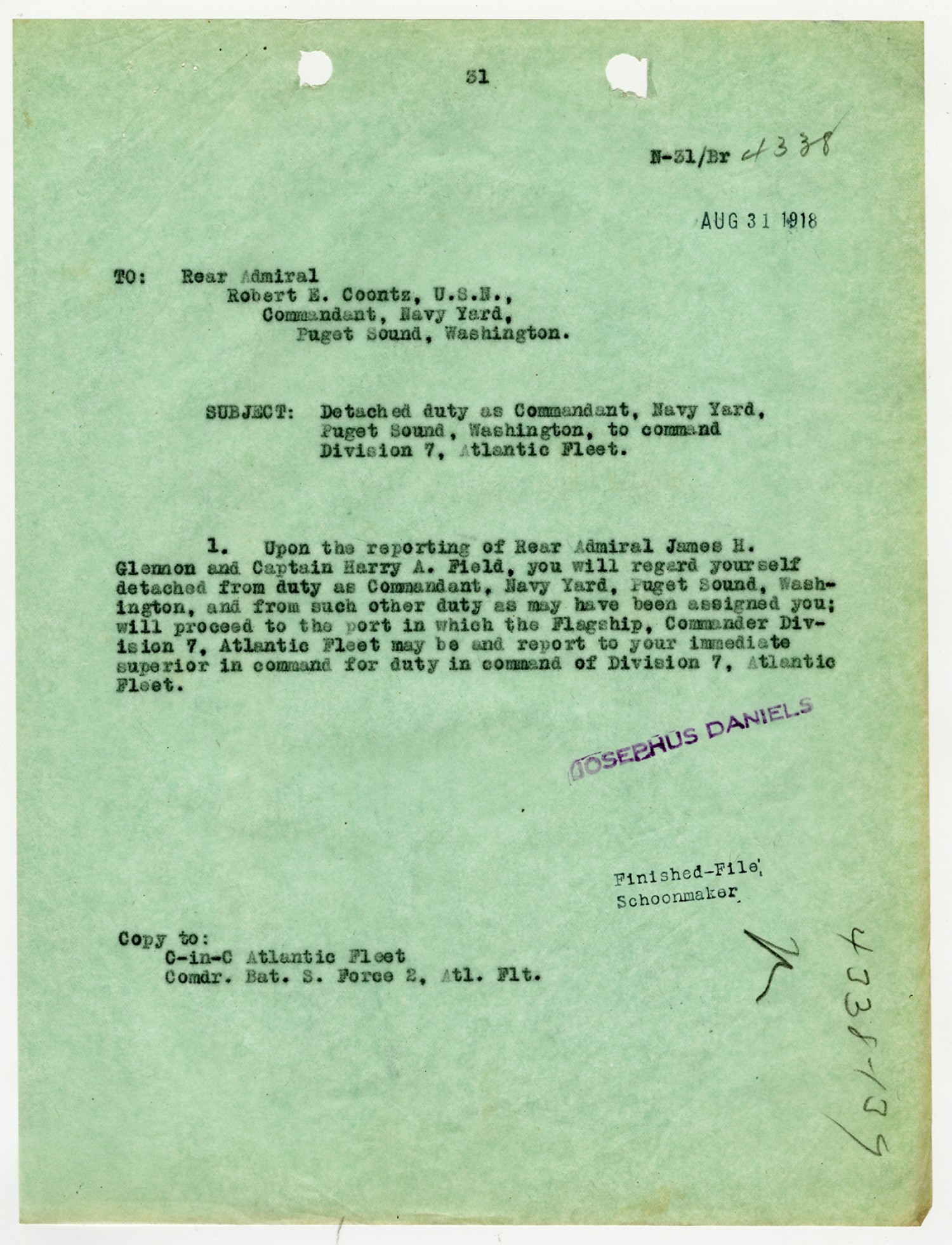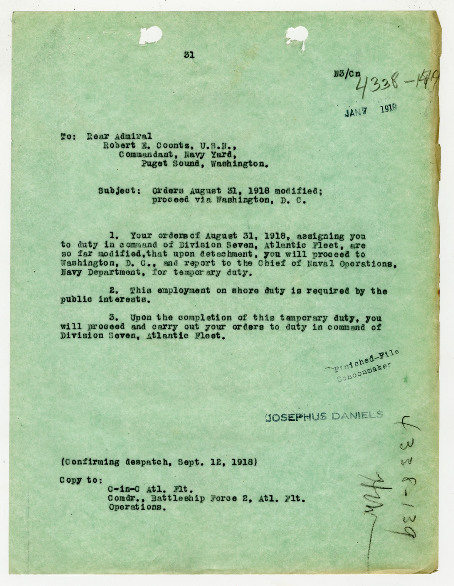 Josephus Daniels letter to Robert E. Coontz - June 28, 1919