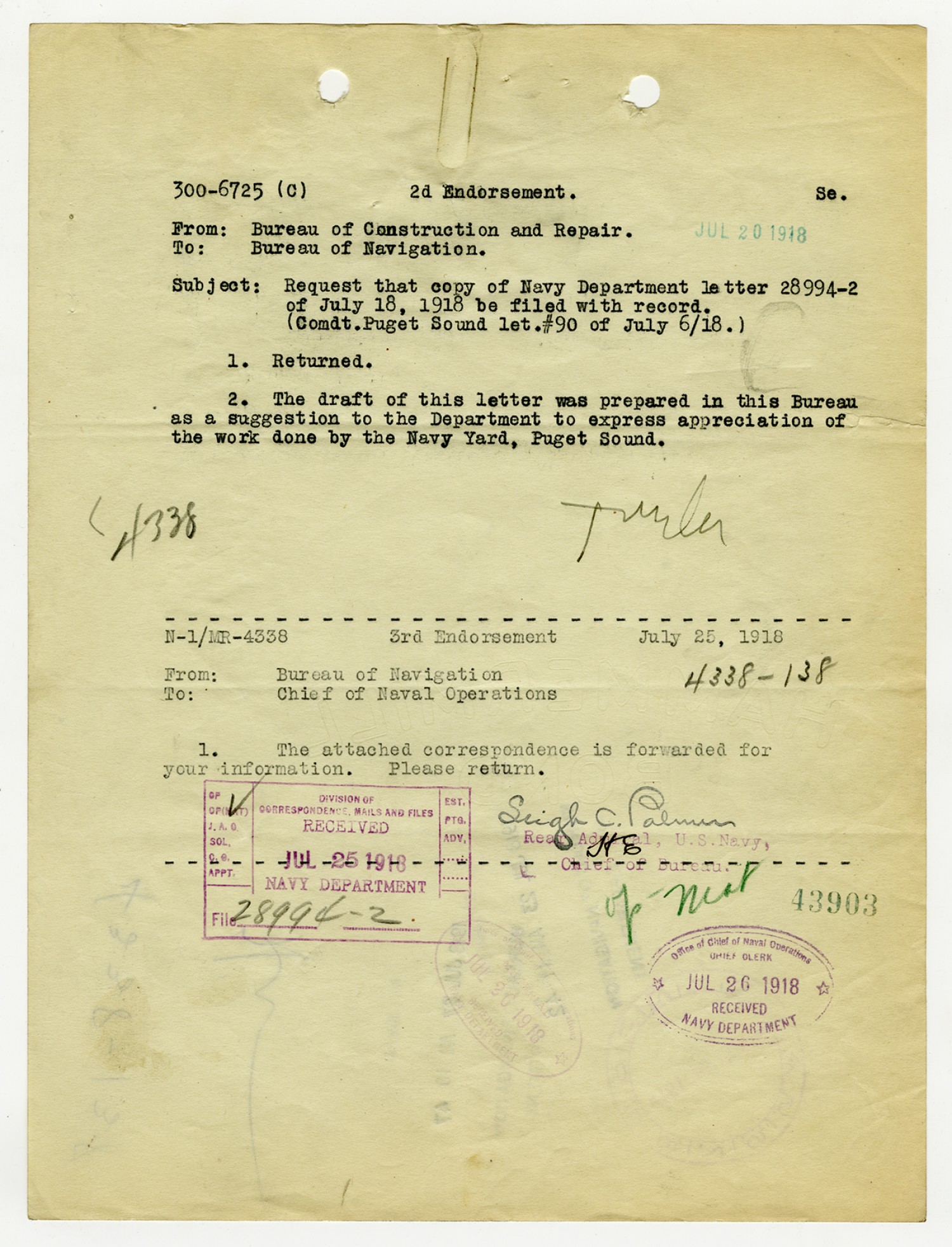 Robert E. Coontz letter to the Chief of the Bureau of Navigation - July 23, 1930