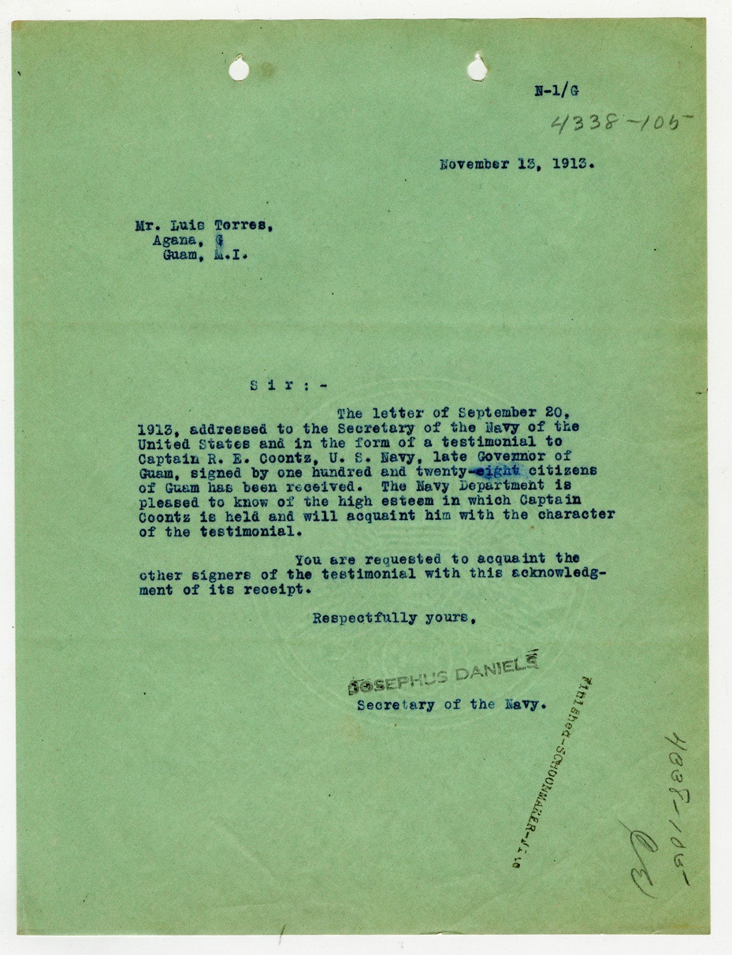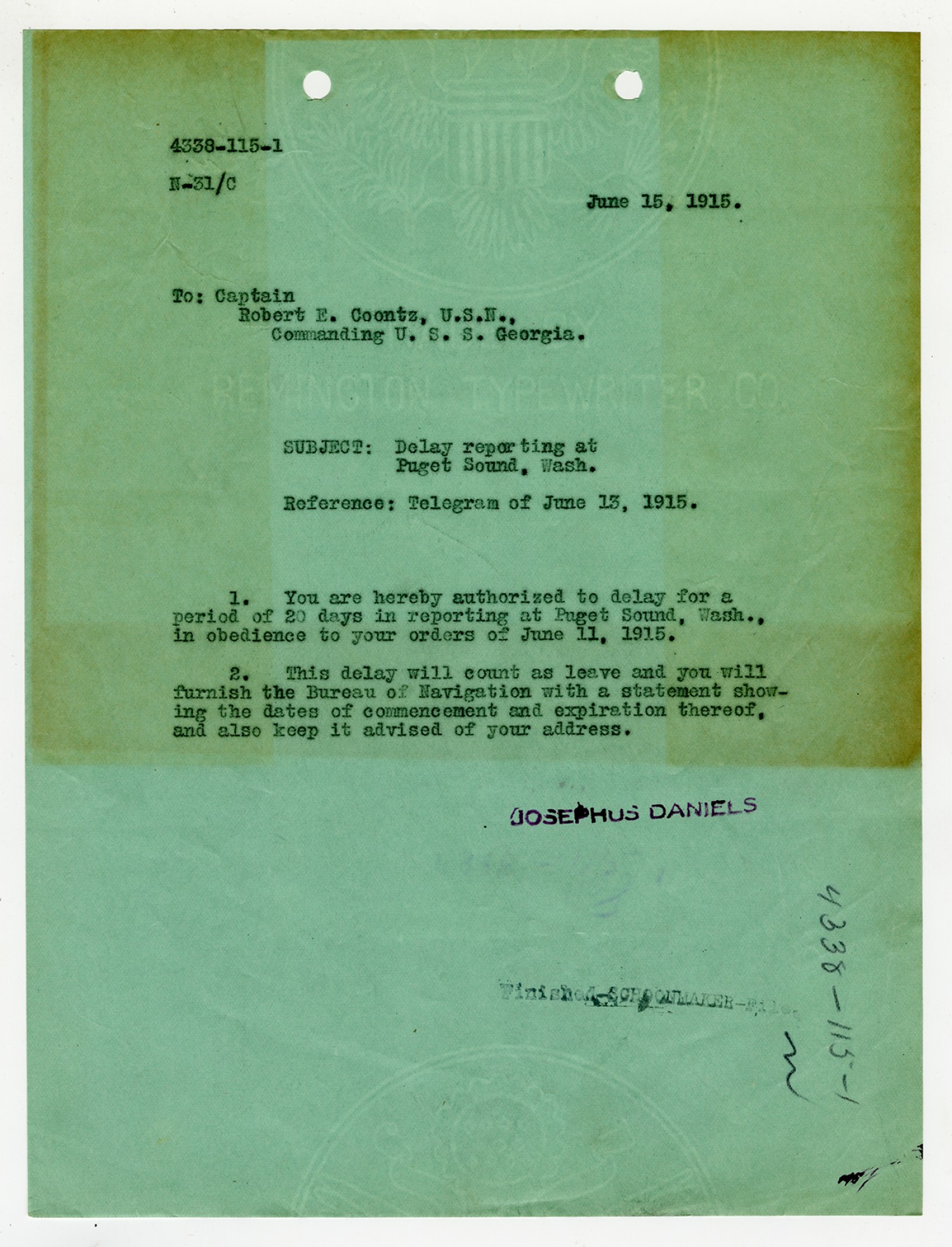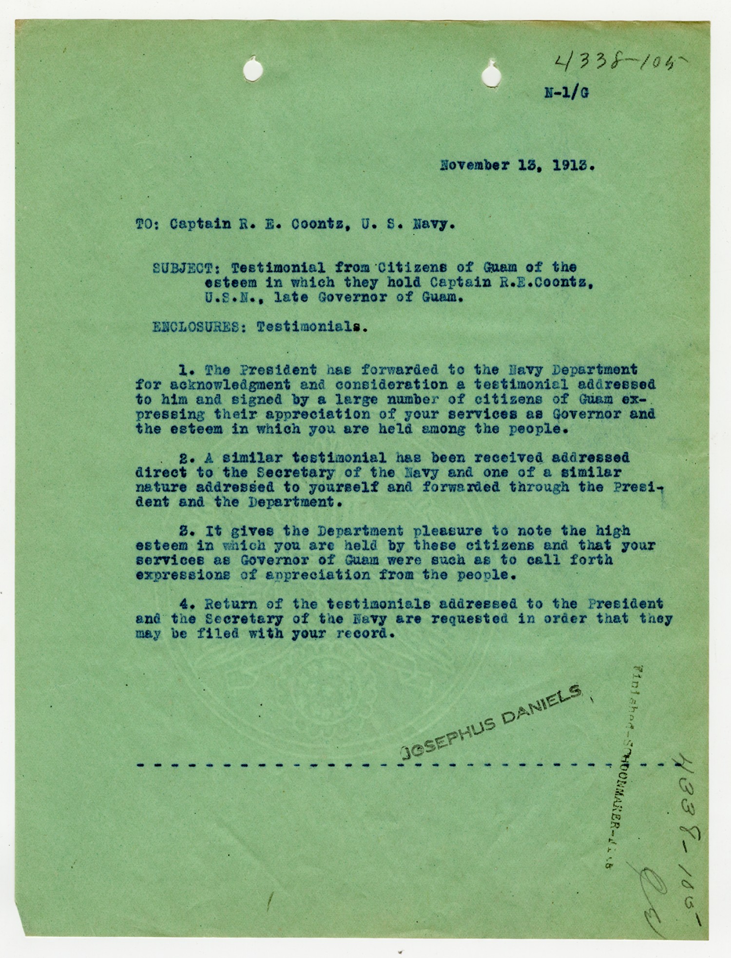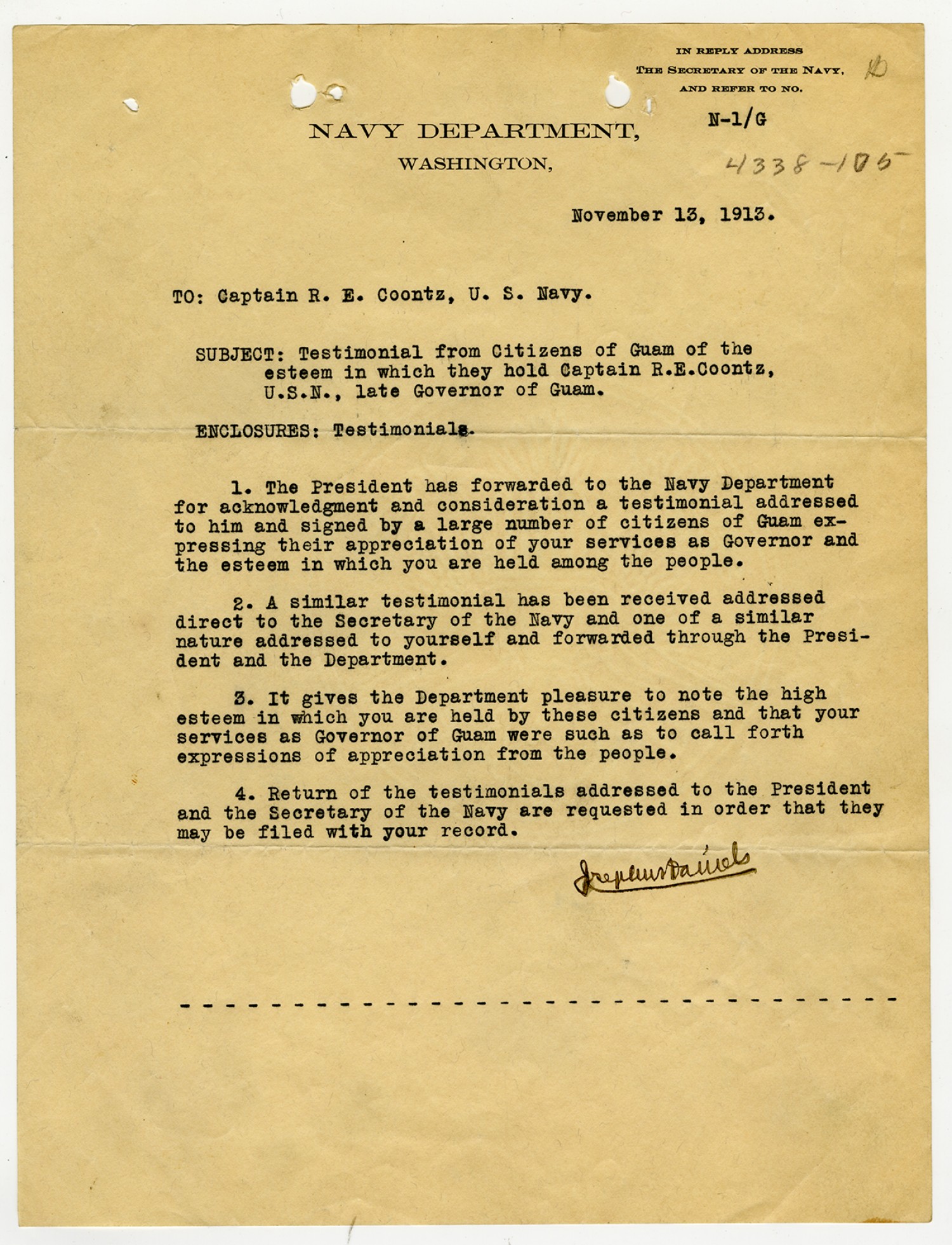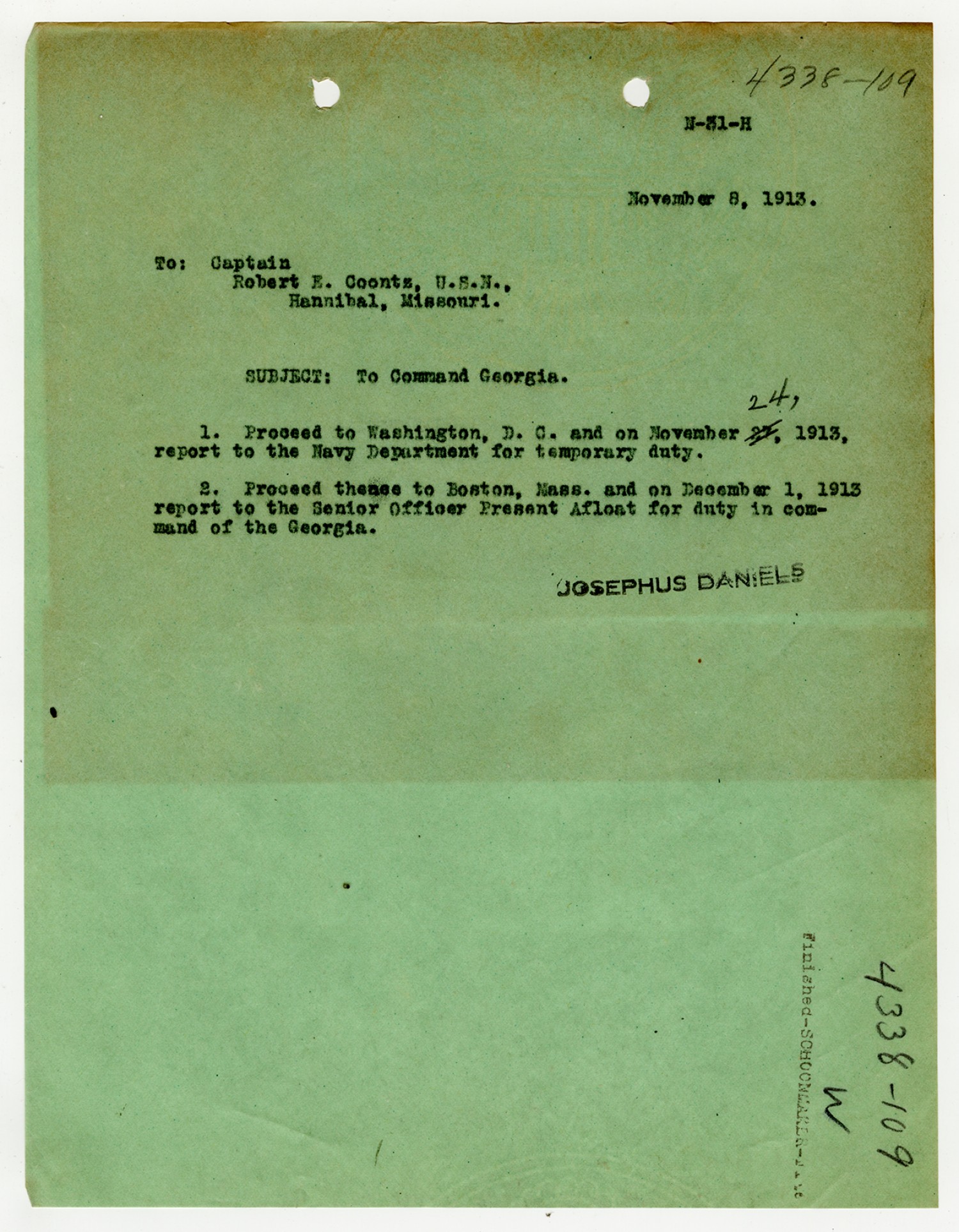 Josephus Daniels letter to Robert E. Coontz - November 4, 1919