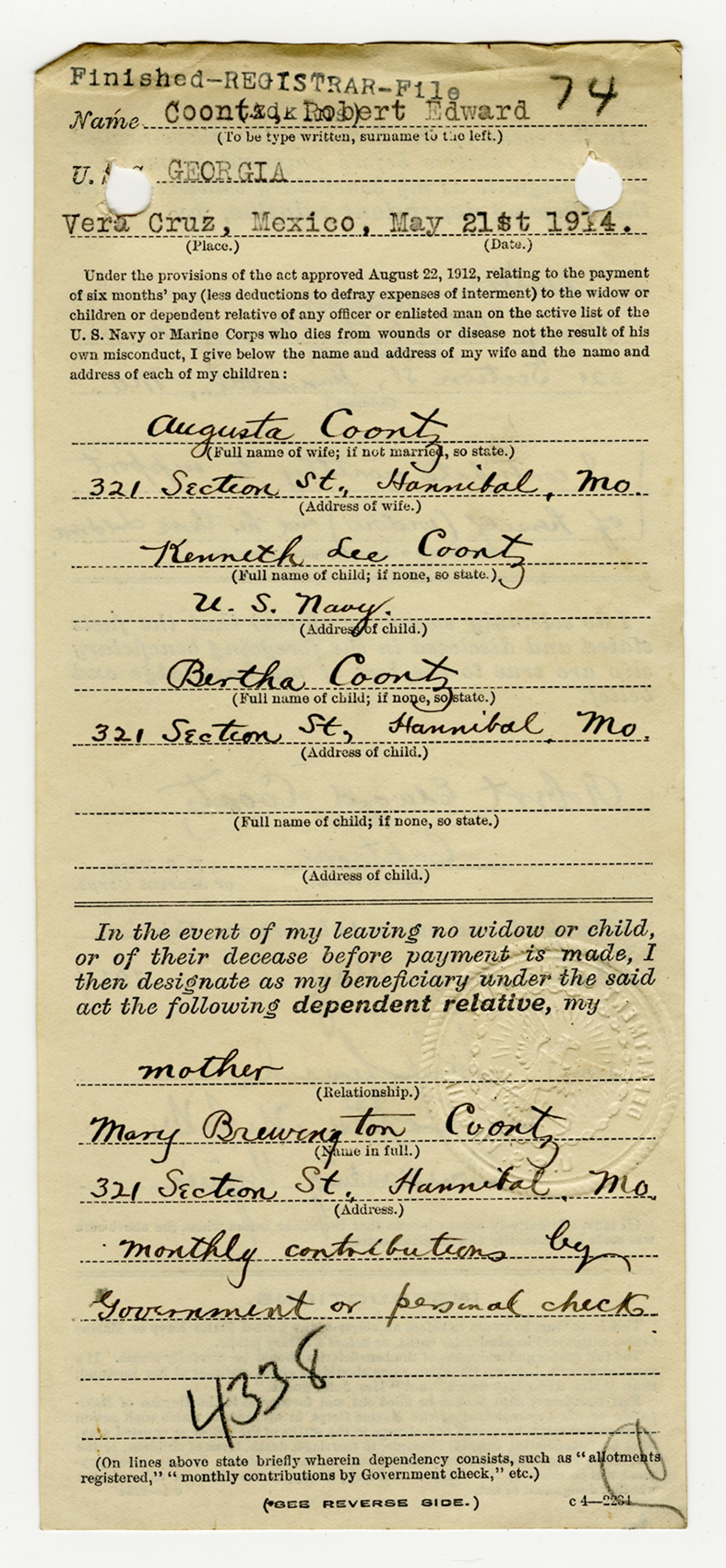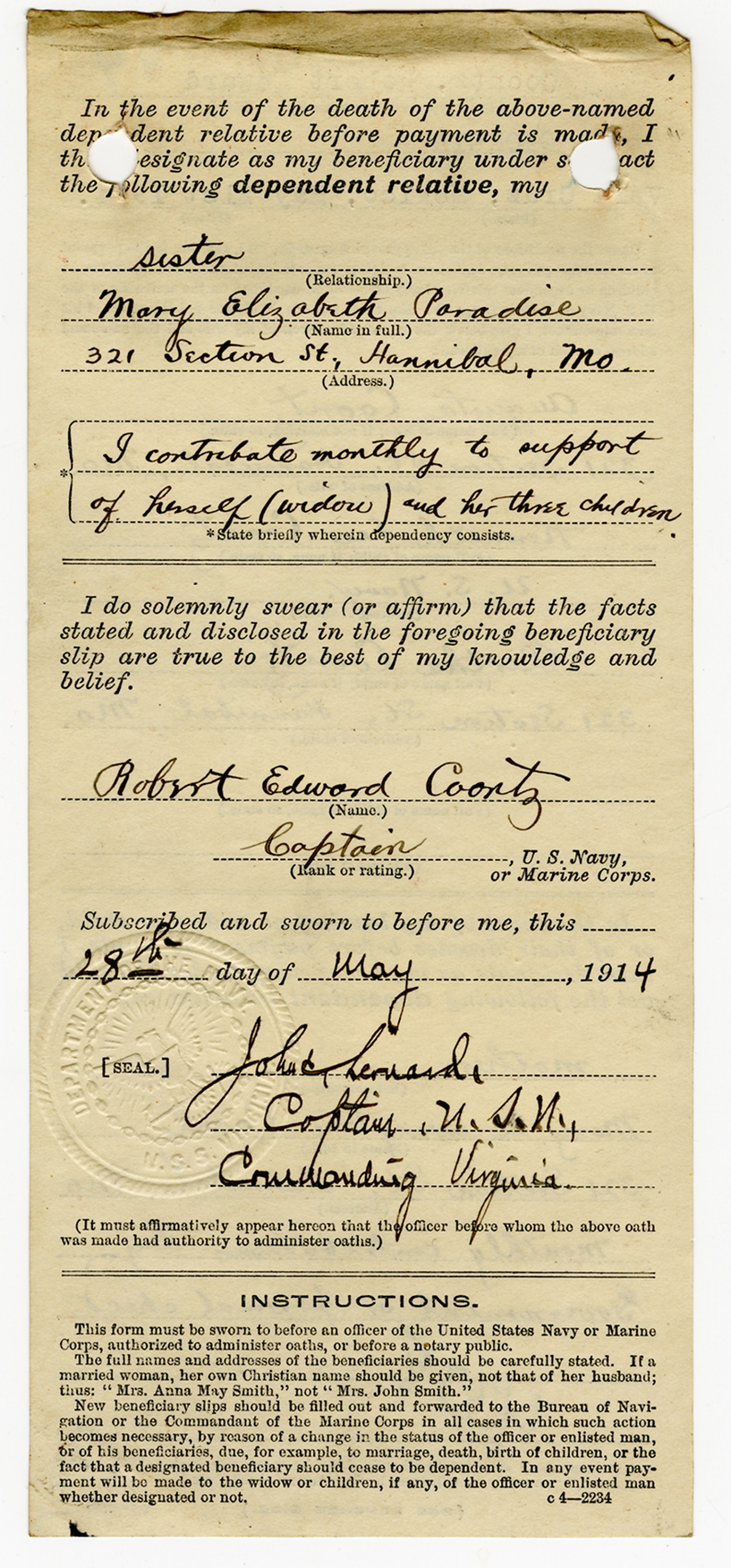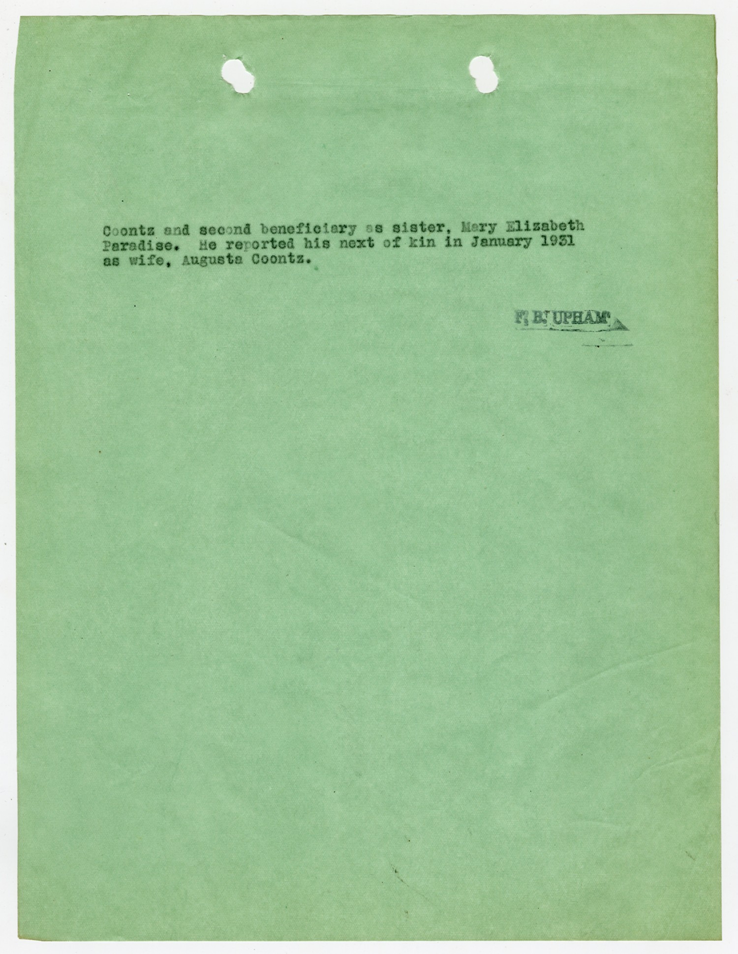Robert E. Coontz Benificiary Slip - ca. 1930