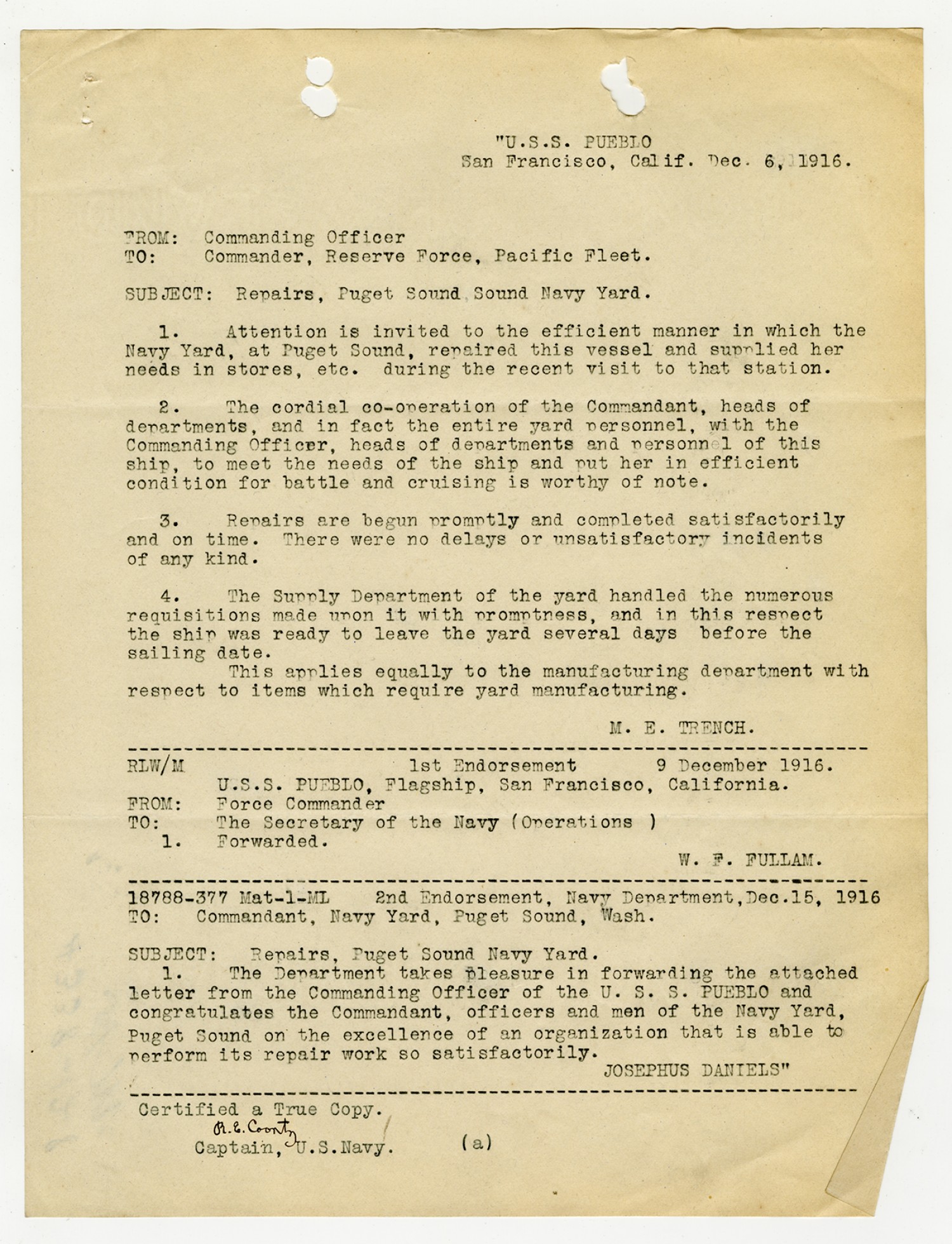 Commanding Officer letter to the Commander of the Pacific Fleet - December 6, 1916