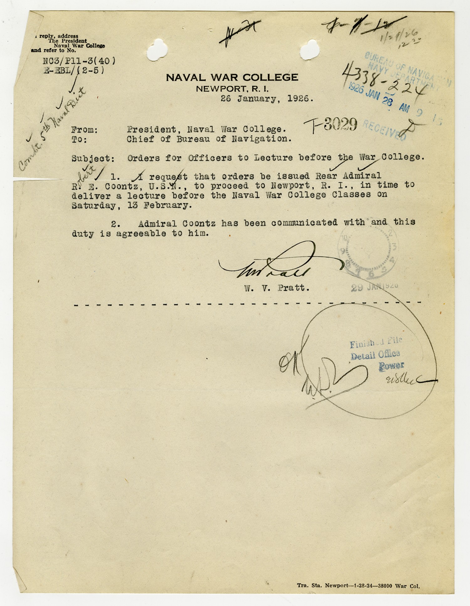 W.V. Pratt letter to the Chief of the Bureau of Navigation - January 26, 1926