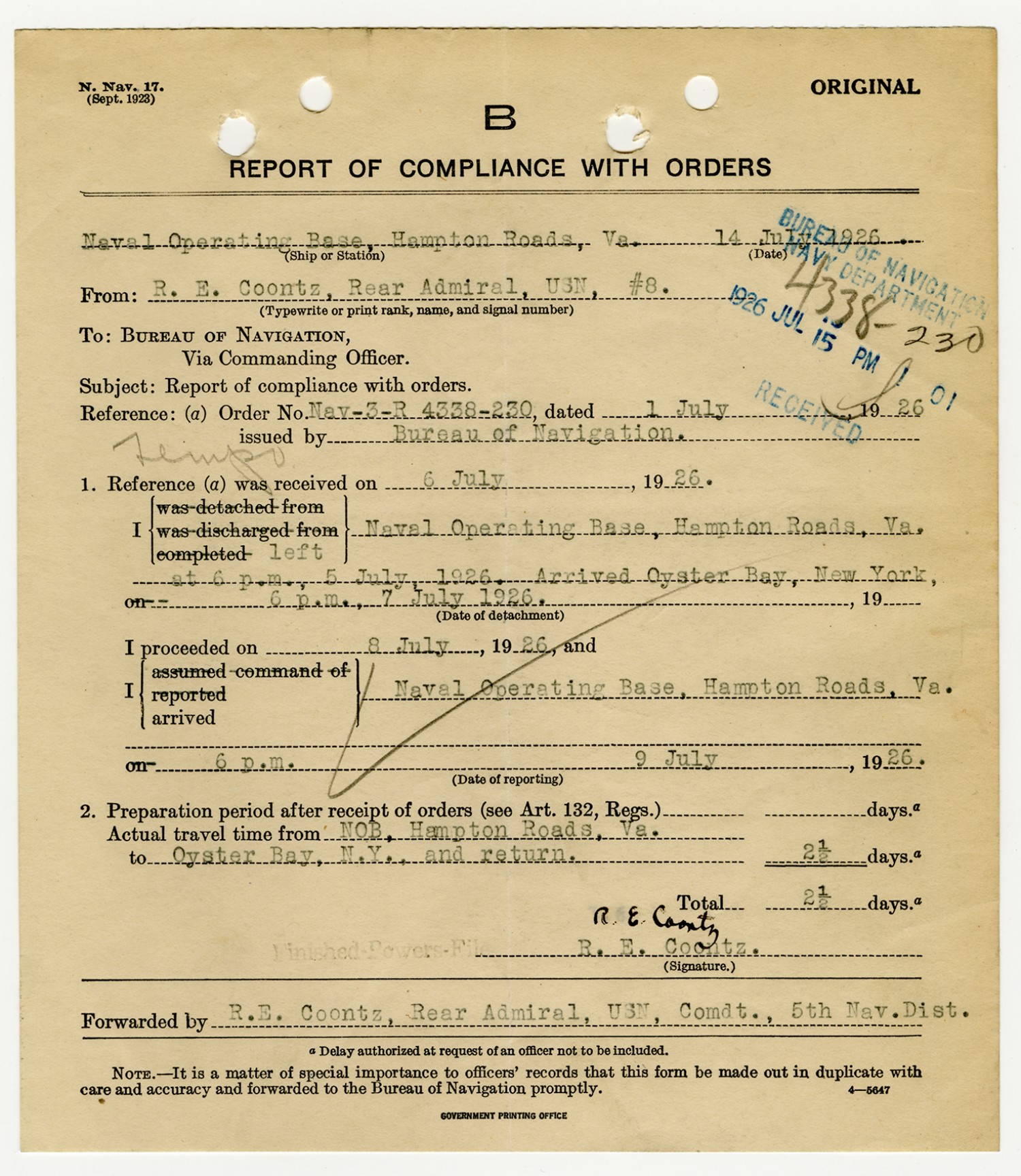 Robert E. Coontz Report of Compliance with Orders - July 14, 1926