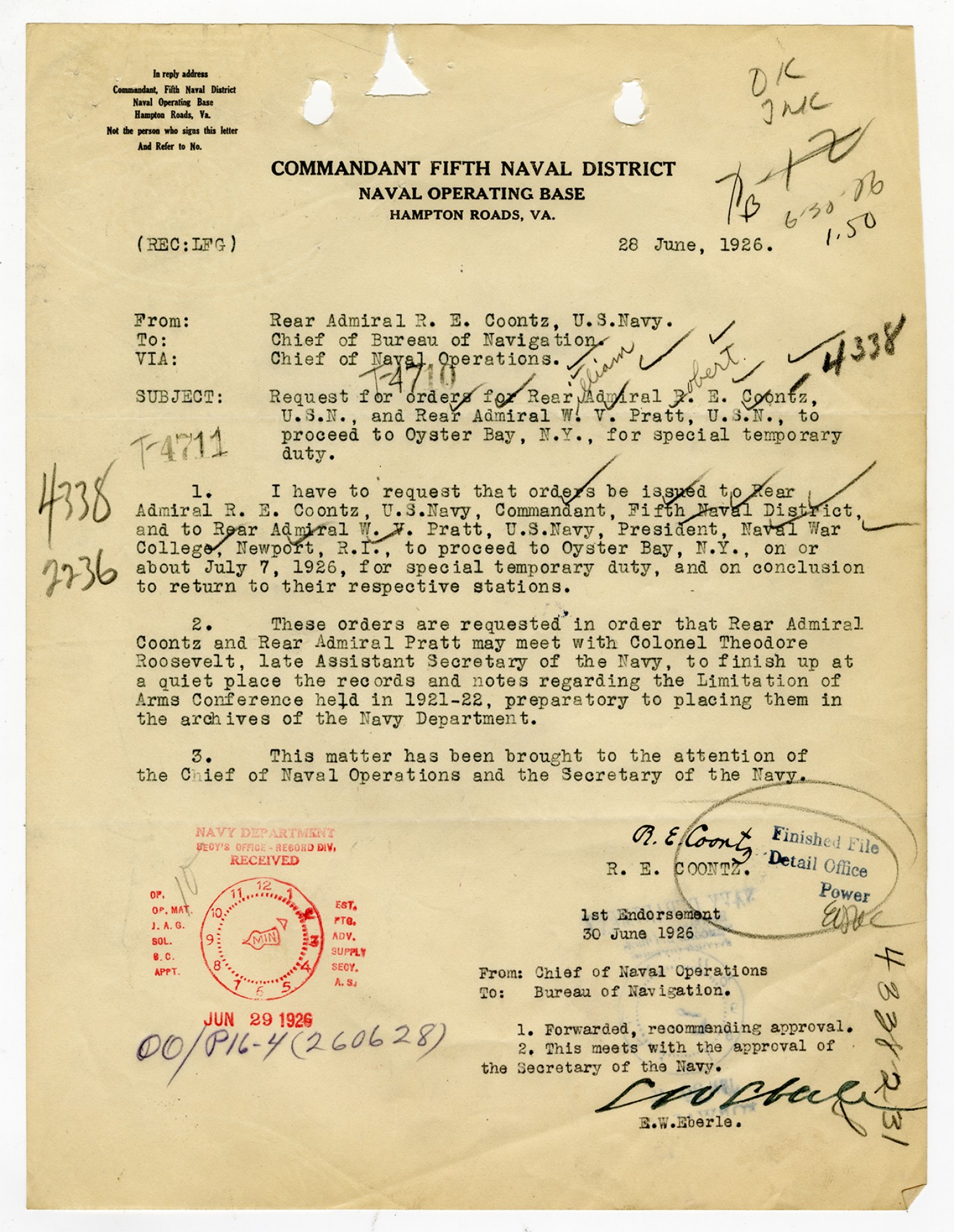 Robert E. Coontz letter to the Chief of the Bureau of Navigation - June 28, 1926