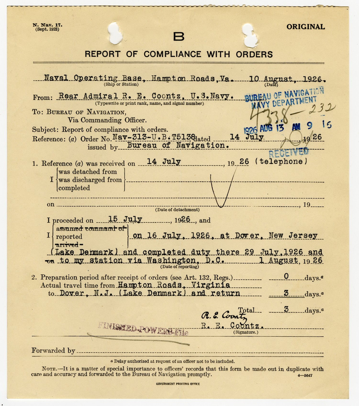 Robert E. Coontz Report of Compliance with Orders - August 10, 1926