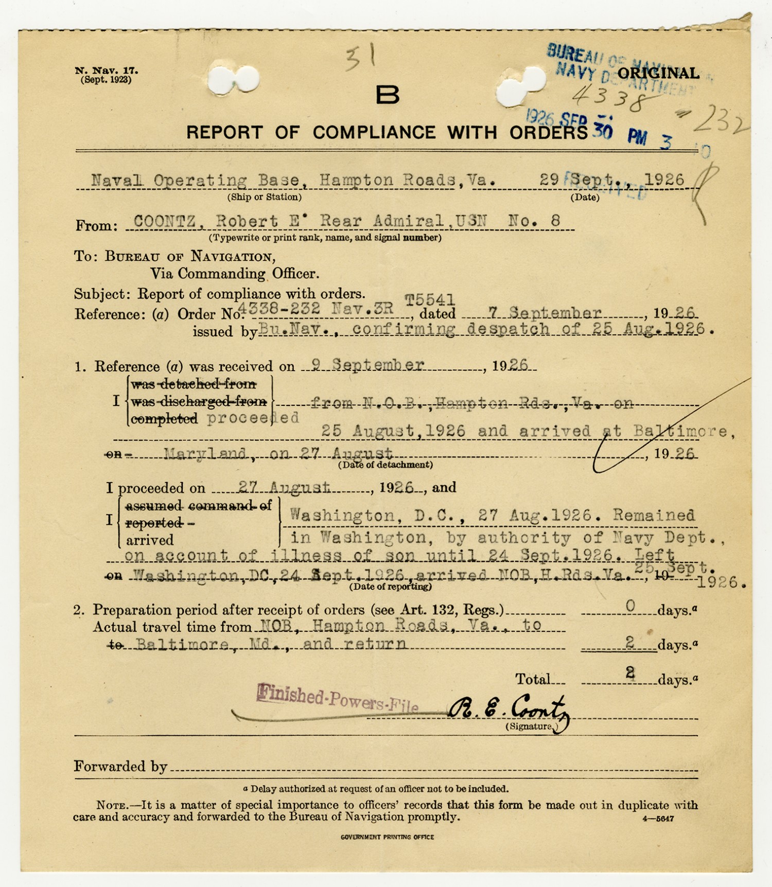 Robert E. Coontz Report of Compliance with Orders - September 29, 1926