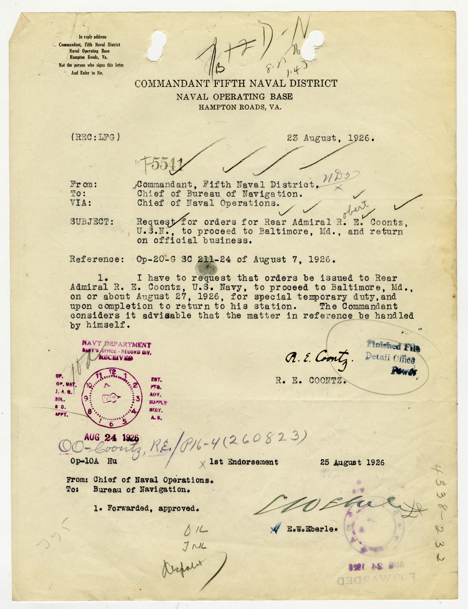 Robert E. Coontz letter to the Chief of the Bureau of Navigation - August 23, 1926