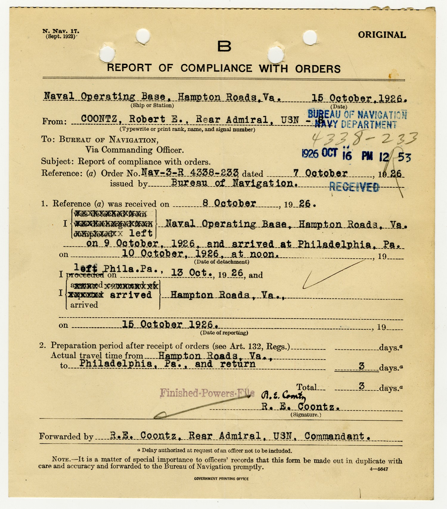 Robert E. Coontz Report of Compliance with Orders - October 15, 1926