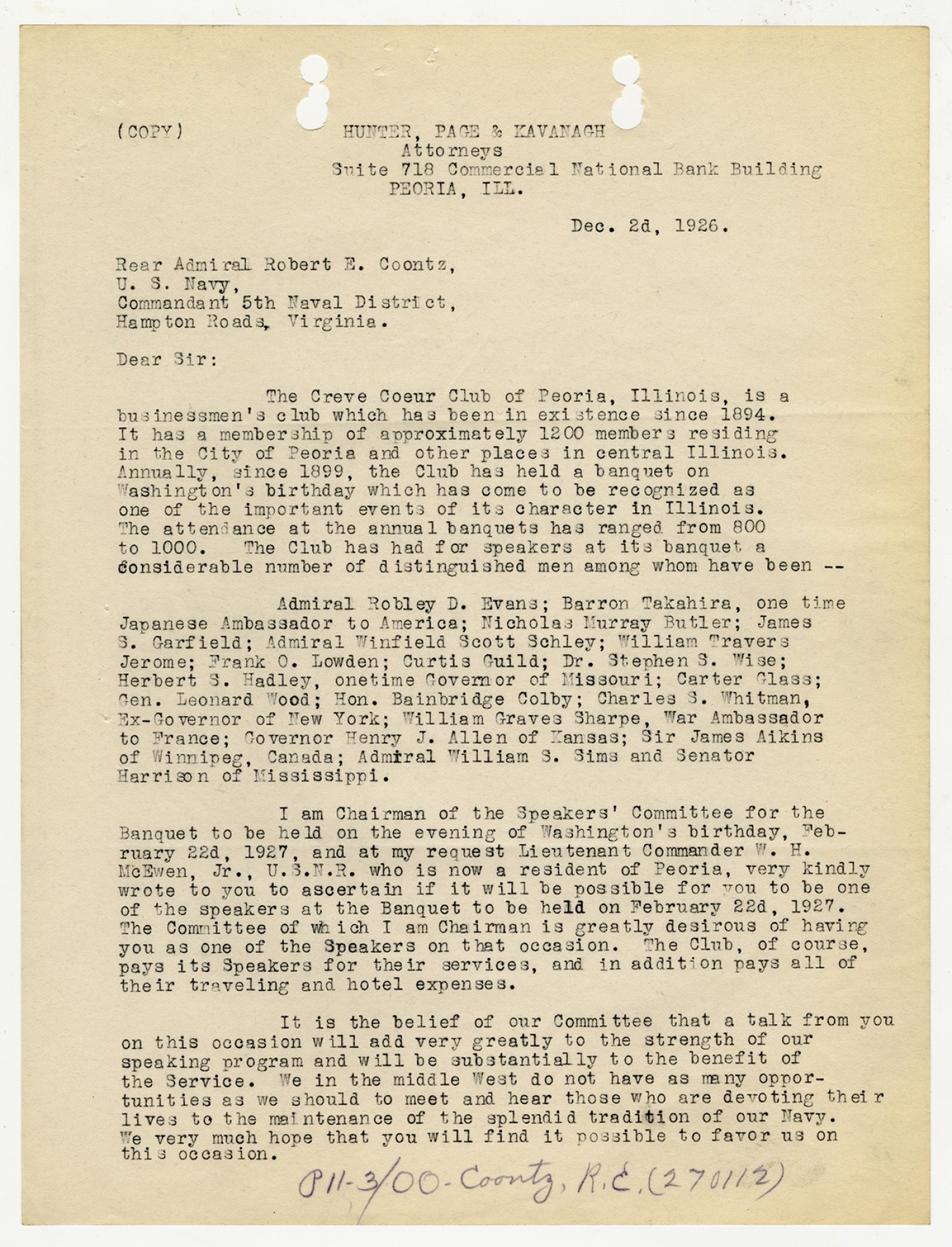 W.M. Hawkins letter to the Navy Department - December 10, 1926
