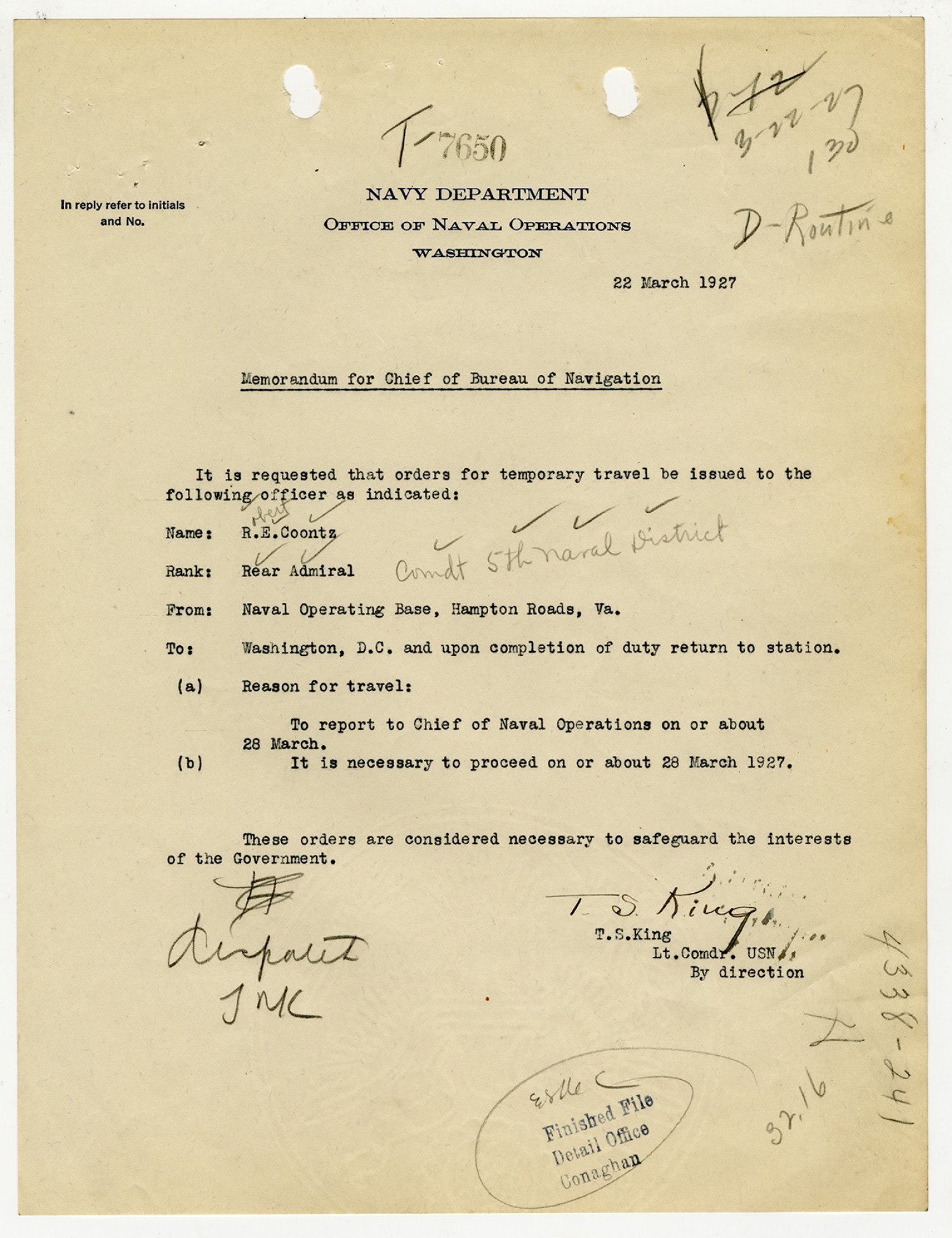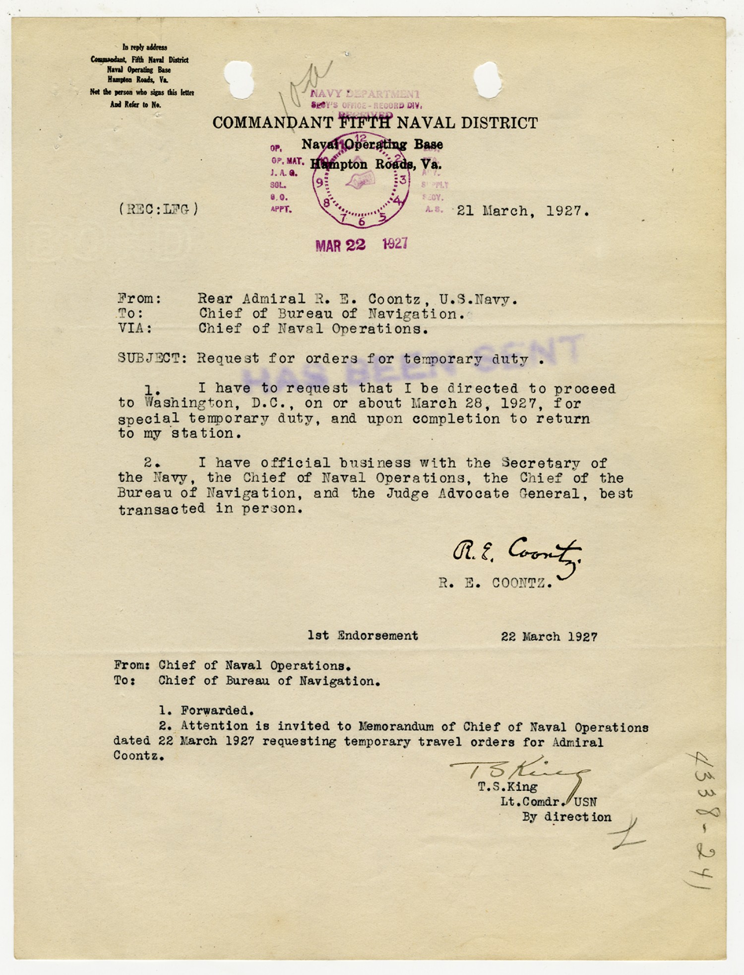 Robert E. Coontz letter to the Chief of the Bureau of Navigation - March 21, 1927
