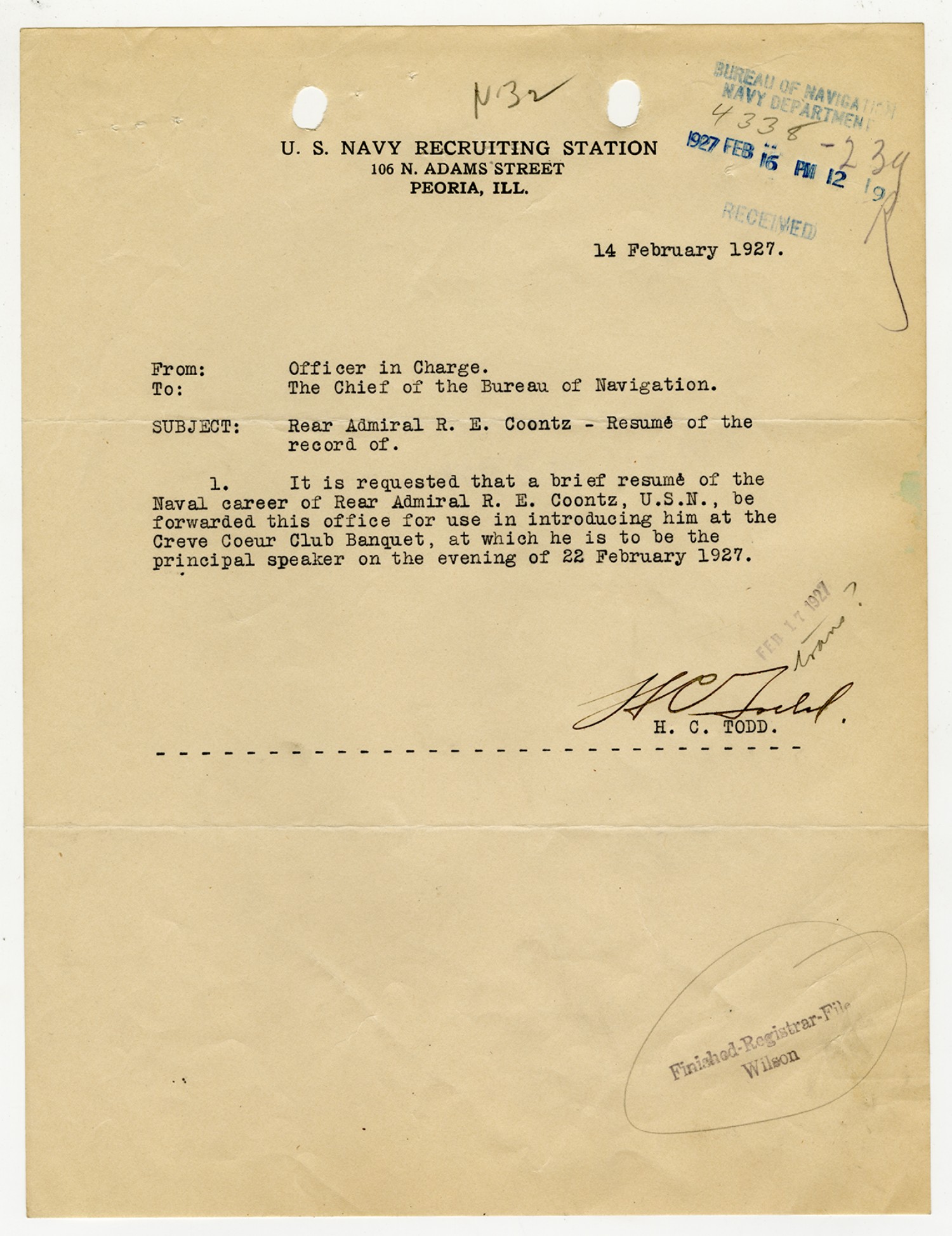 H.C. Todd letter to the Chief of the Bureau of Navigation - February 14, 1927