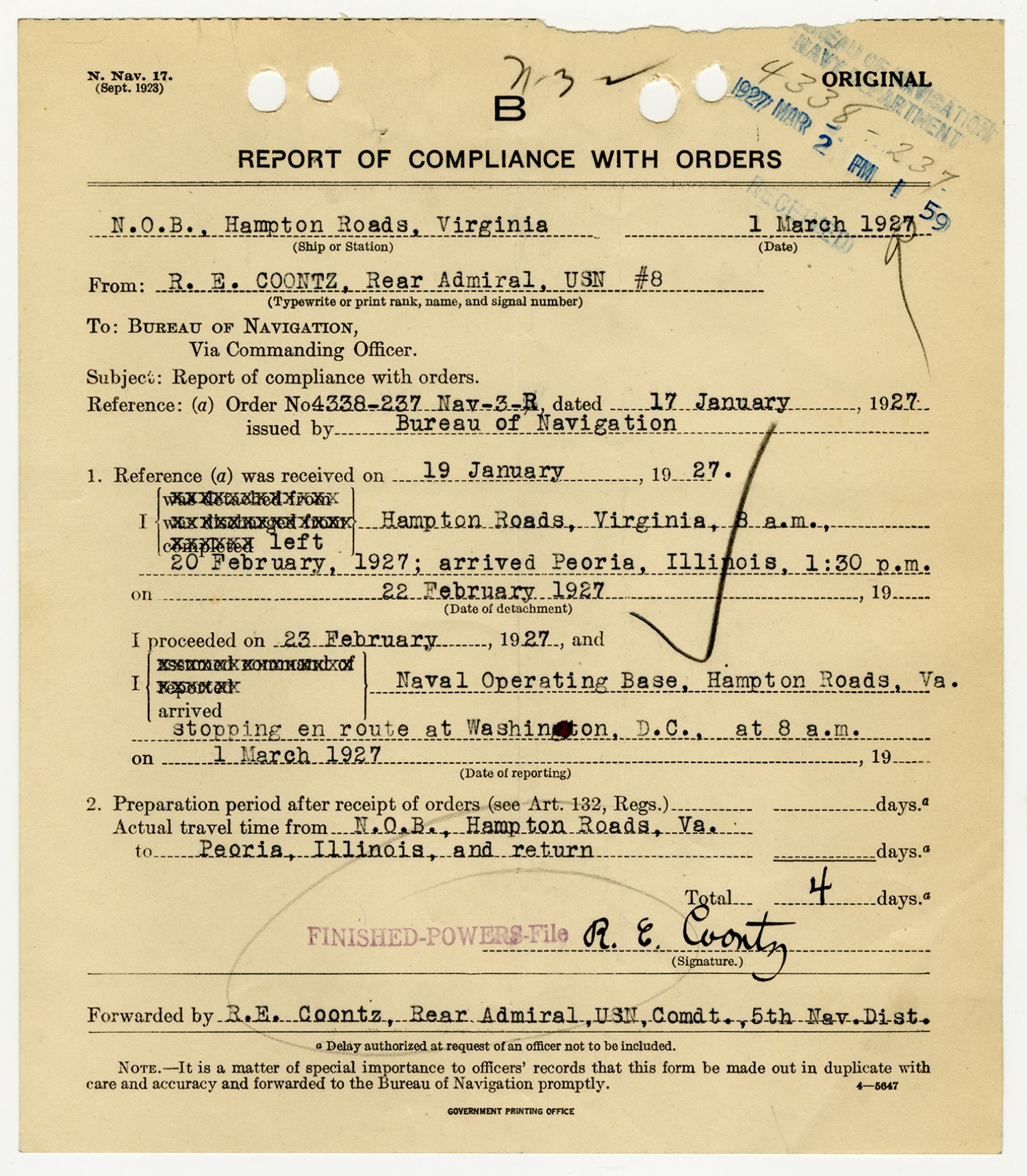 Robert E. Coontz Report of Compliance with Orders - March 1, 1927