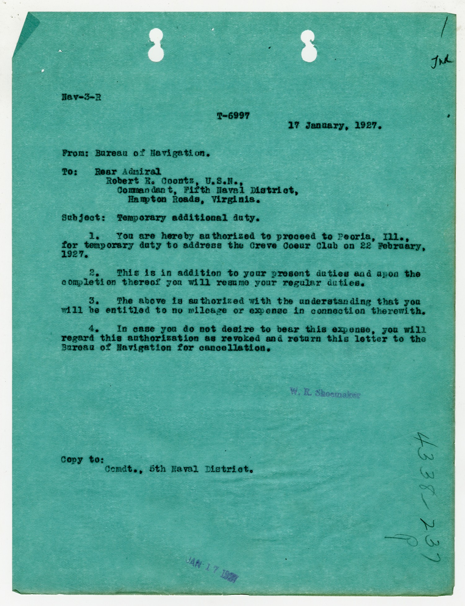 W.R. Shoemaker letter to Robert E. Coontz - January 17, 1927