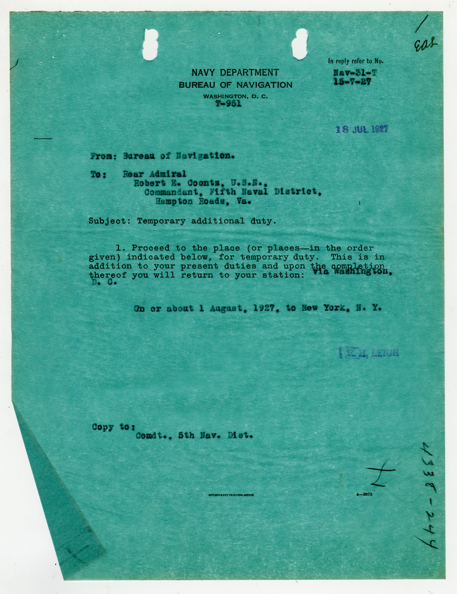 Robert E. Coontz letter to the Chief of the Bureau of Navigation - July 13, 1927