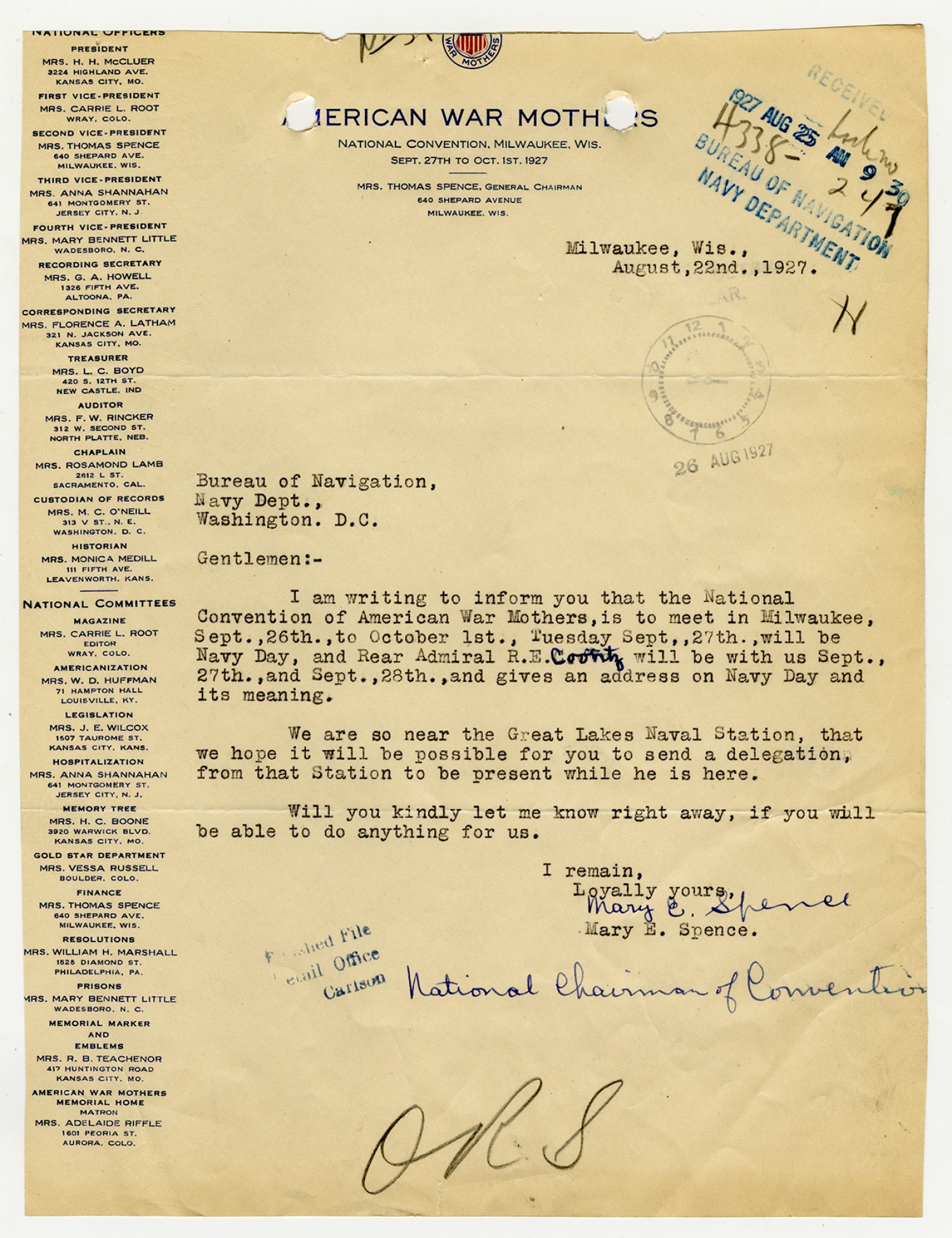 Mary E. Spence letter to the Bureau of Navigation - August 22, 1927