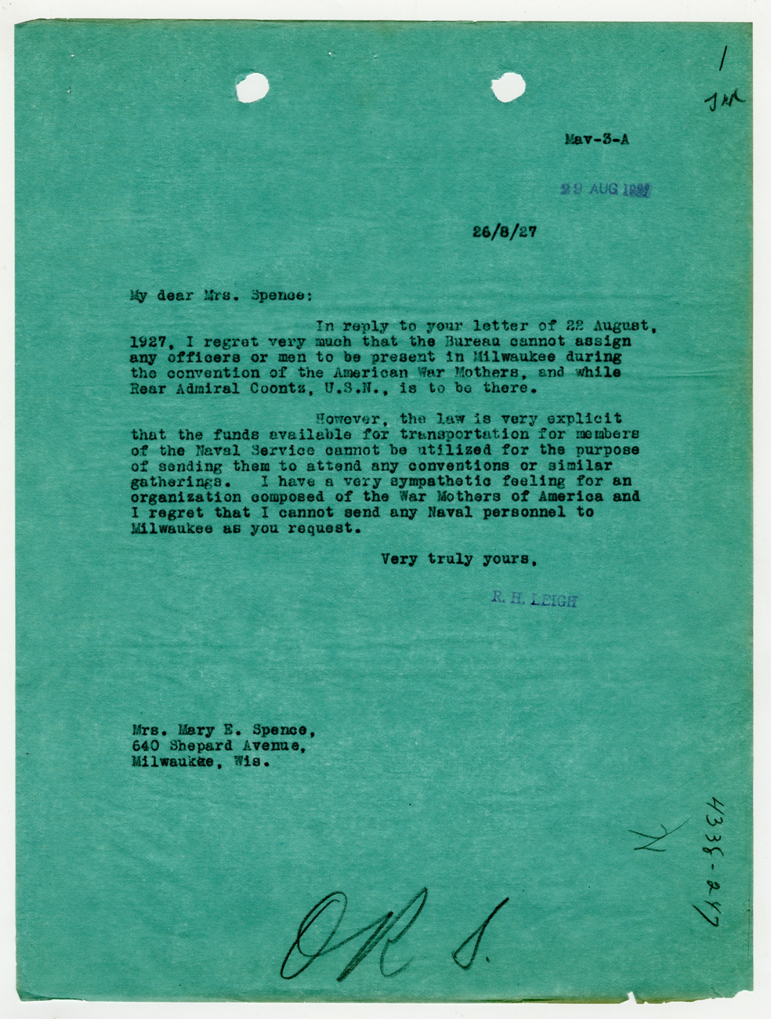 R.H. Leigh letter to Mary E. Spence - August 26, 1927