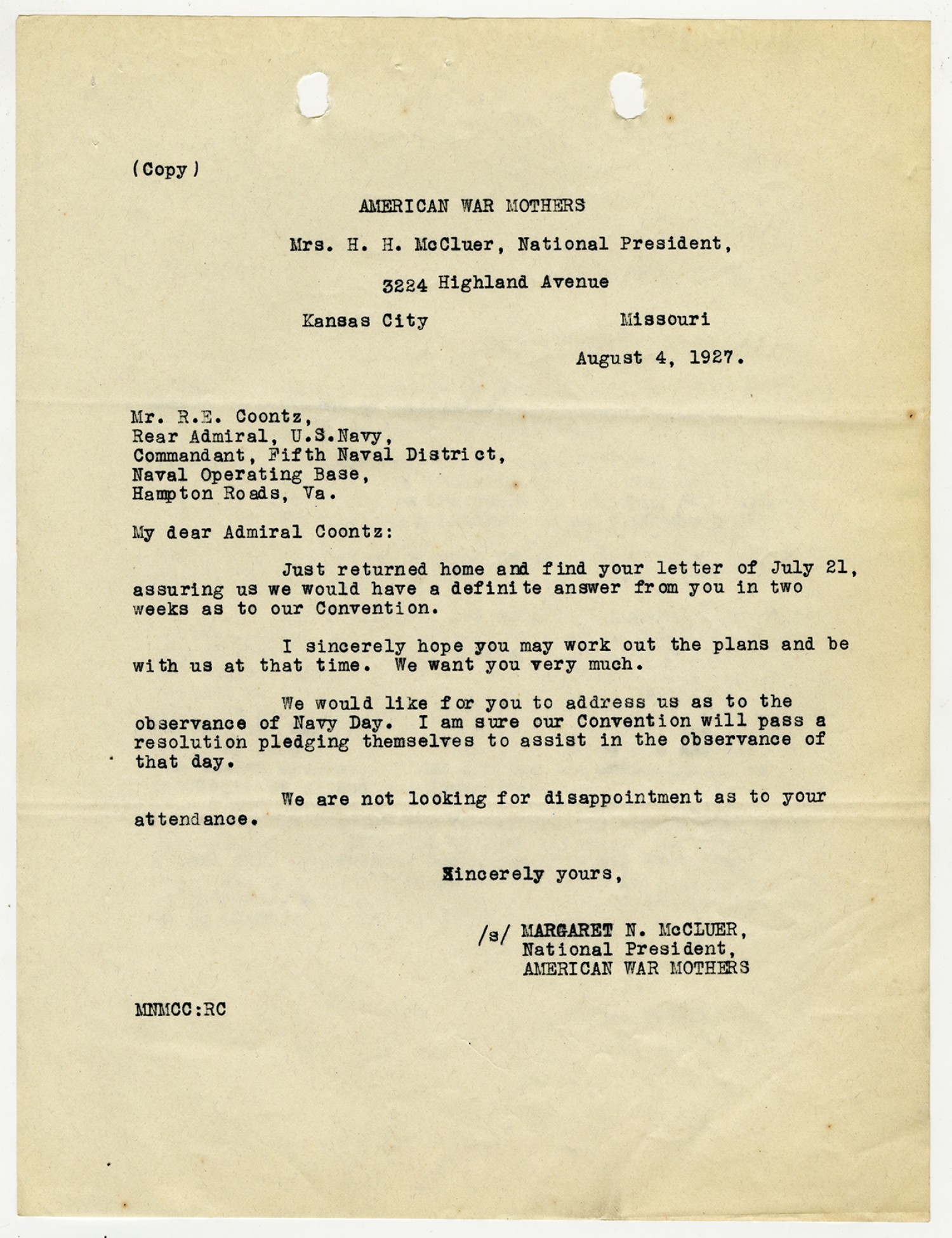 Margaret N. McClure letter to Robert E. Coontz - August 4, 1927