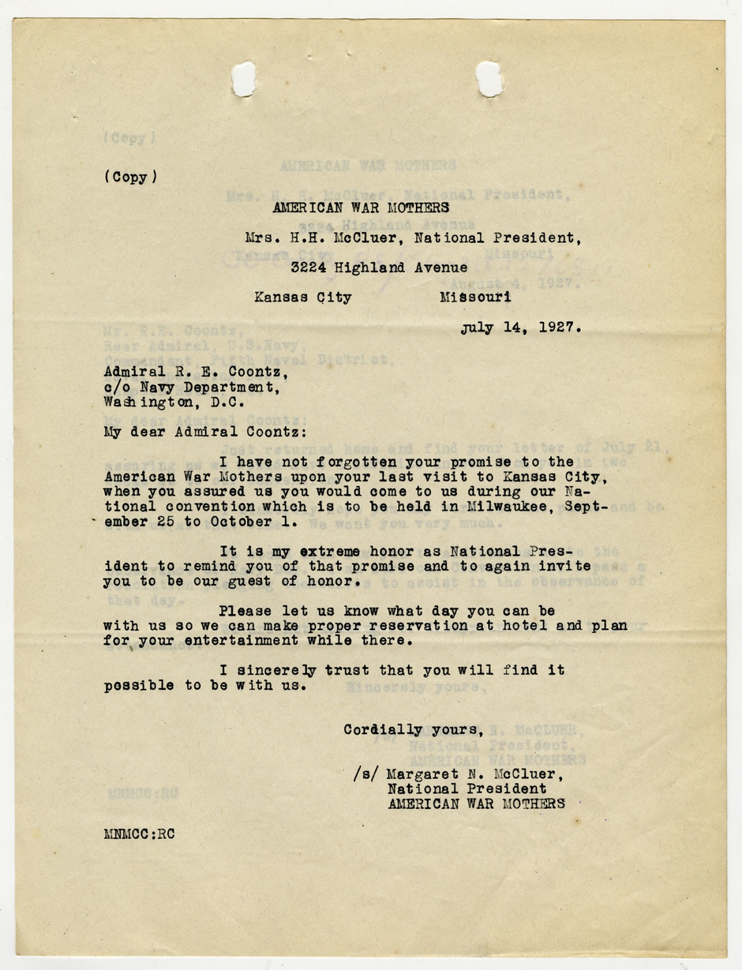Margaret N. McClure letter to Robert E. Coontz - July 14, 1927