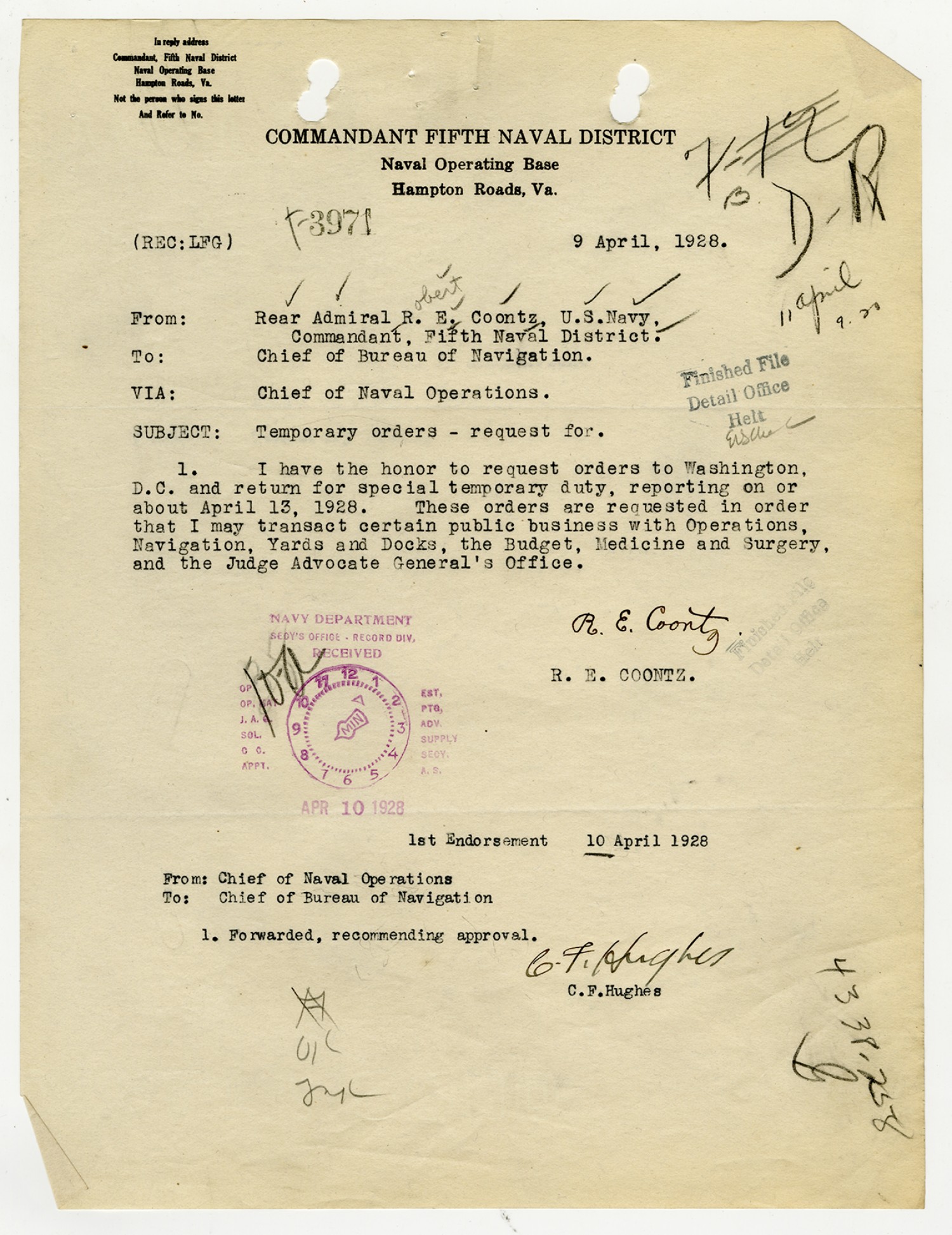 Robert E. Coontz letter to the Chief of the Bureau of Navigation - April 9, 1928