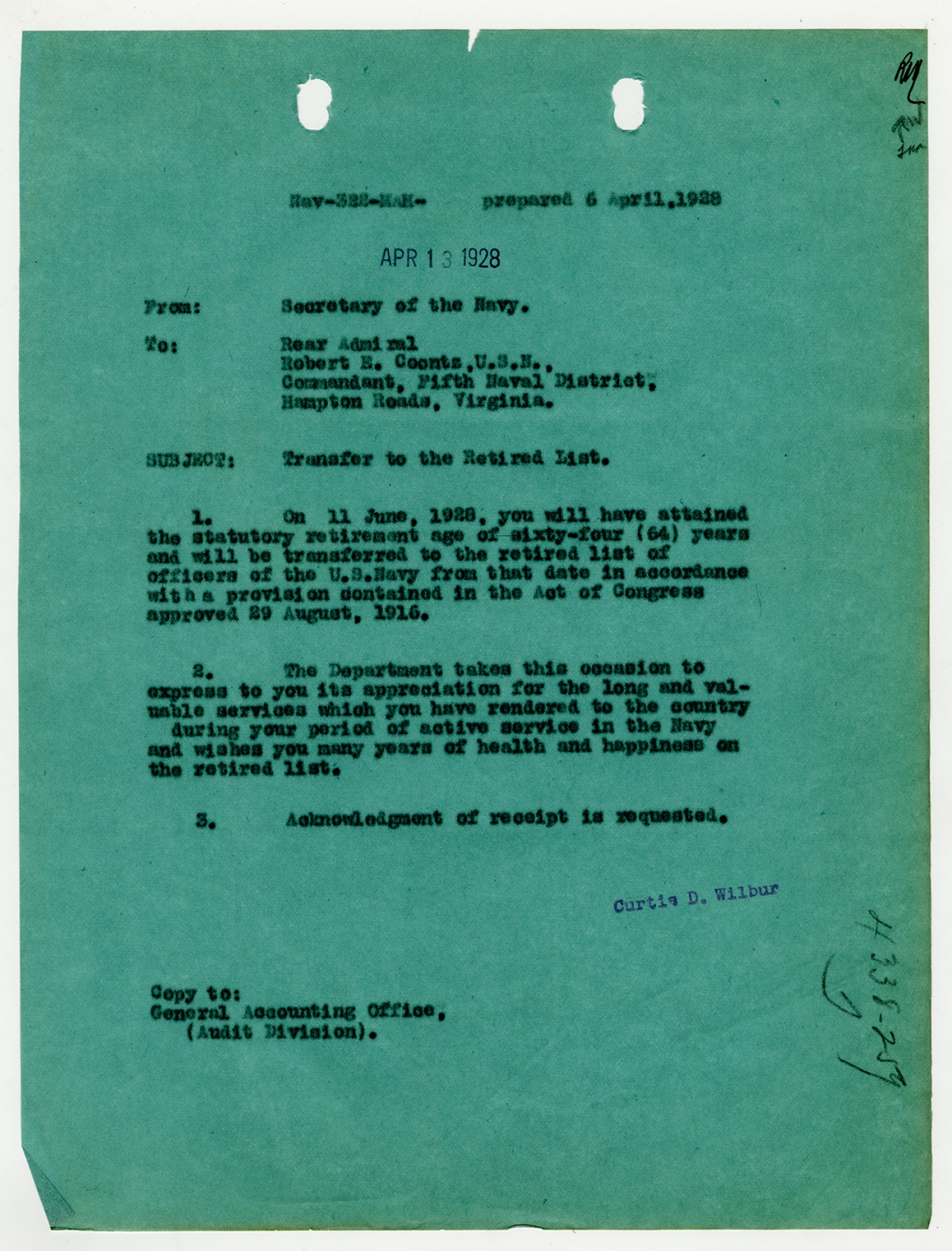 Curtis D. Wilbur letter to Robert E. Coontz - April 6, 1928