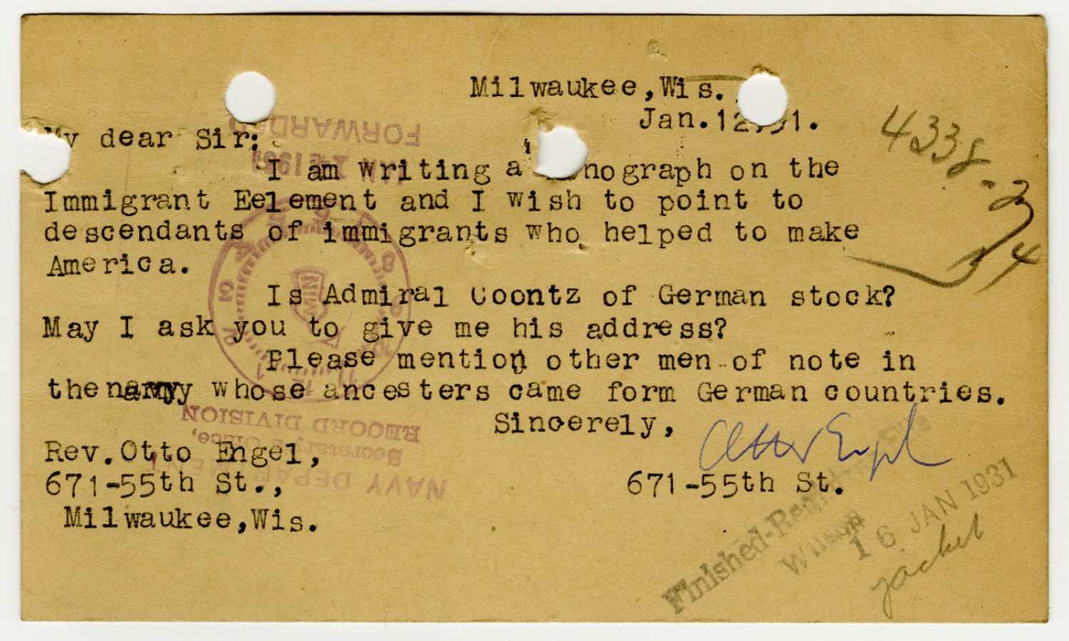 Otto Engel Letter - January 12, 1931