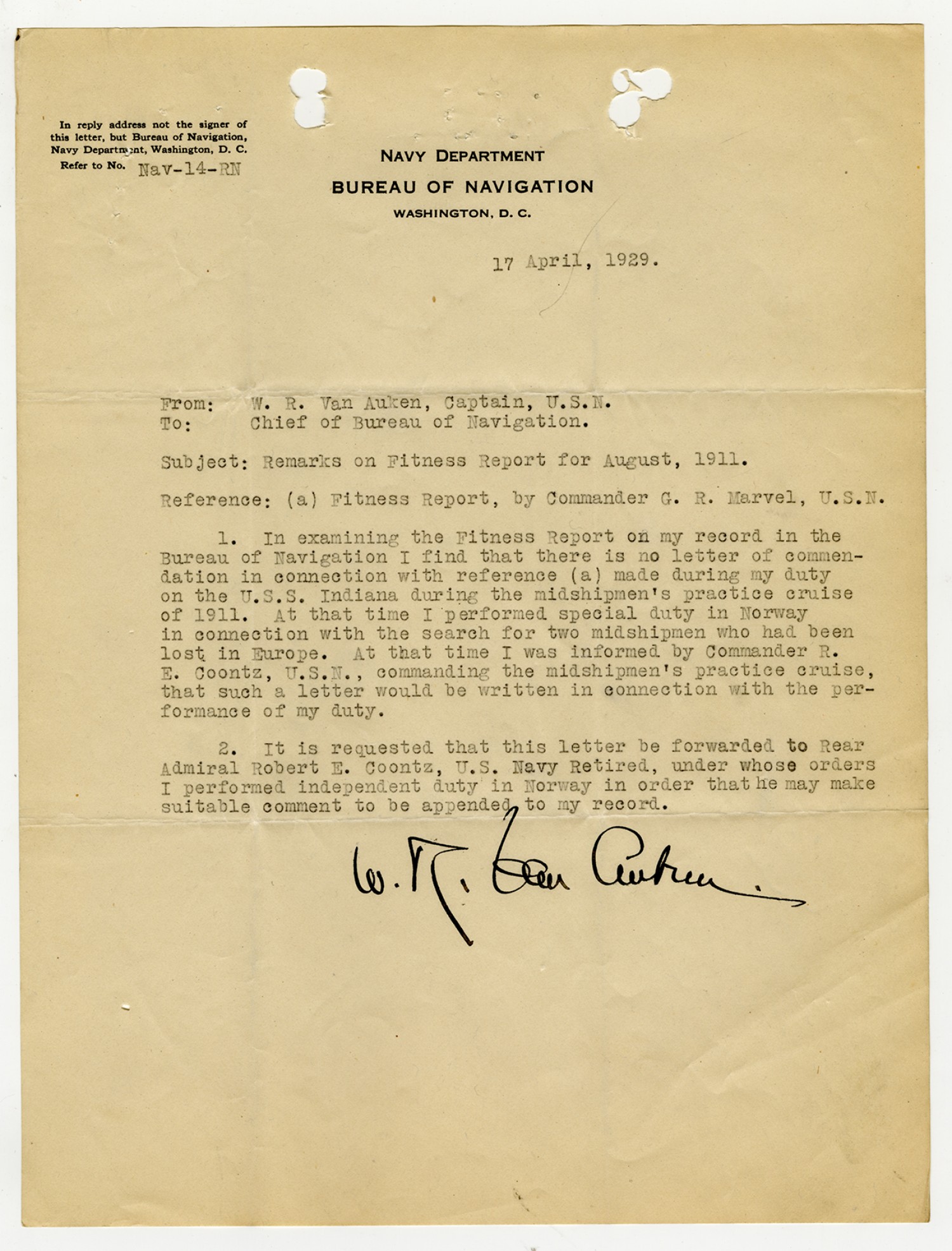 W.R. Van Auken letter to the Chief of the Bureau of Navigation - April 17, 1929