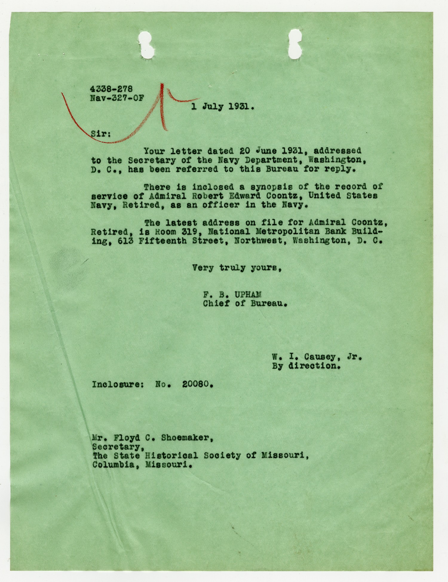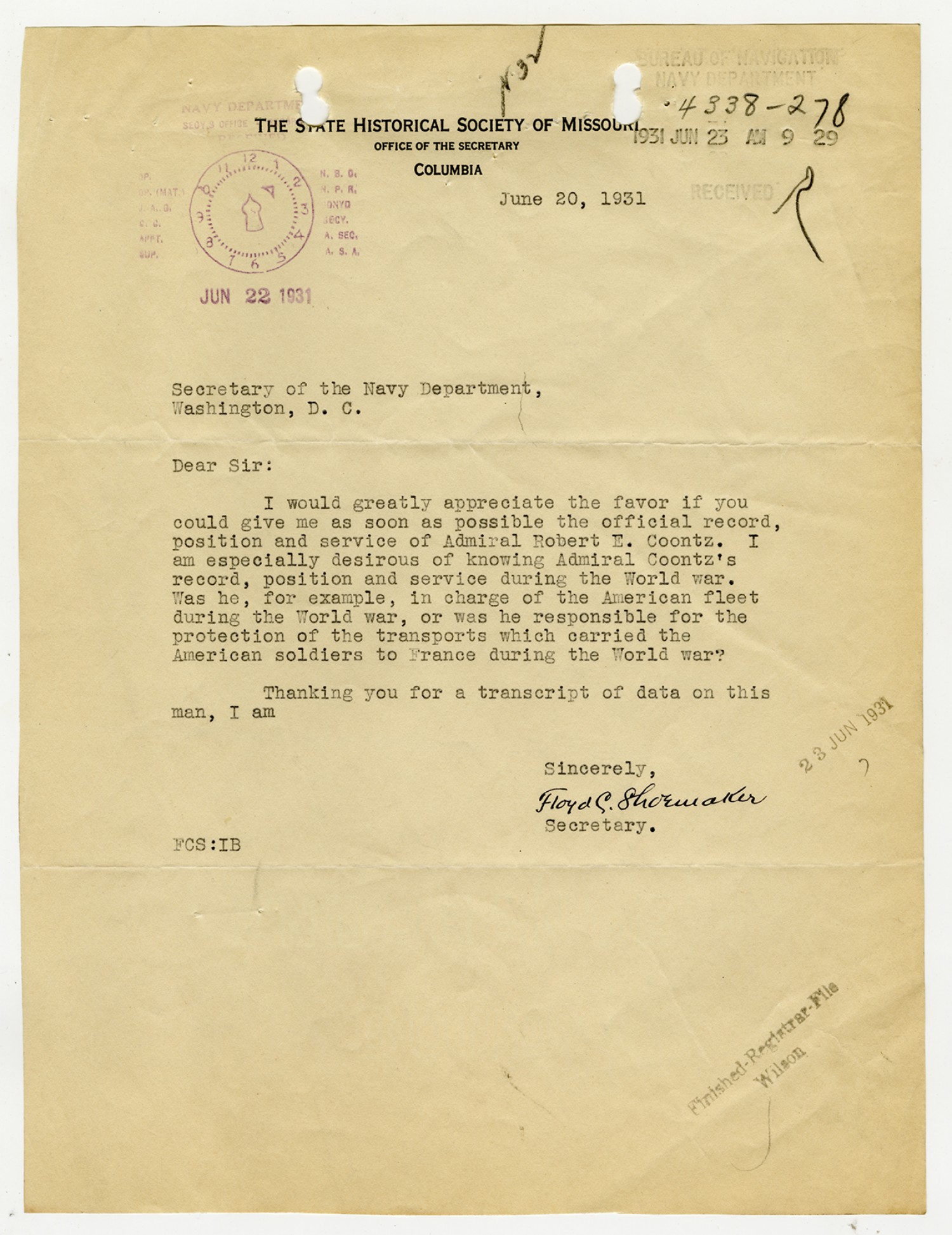 Floyd C. Shoemaker letter to the Secretary of the Navy Department - June 20, 1931
