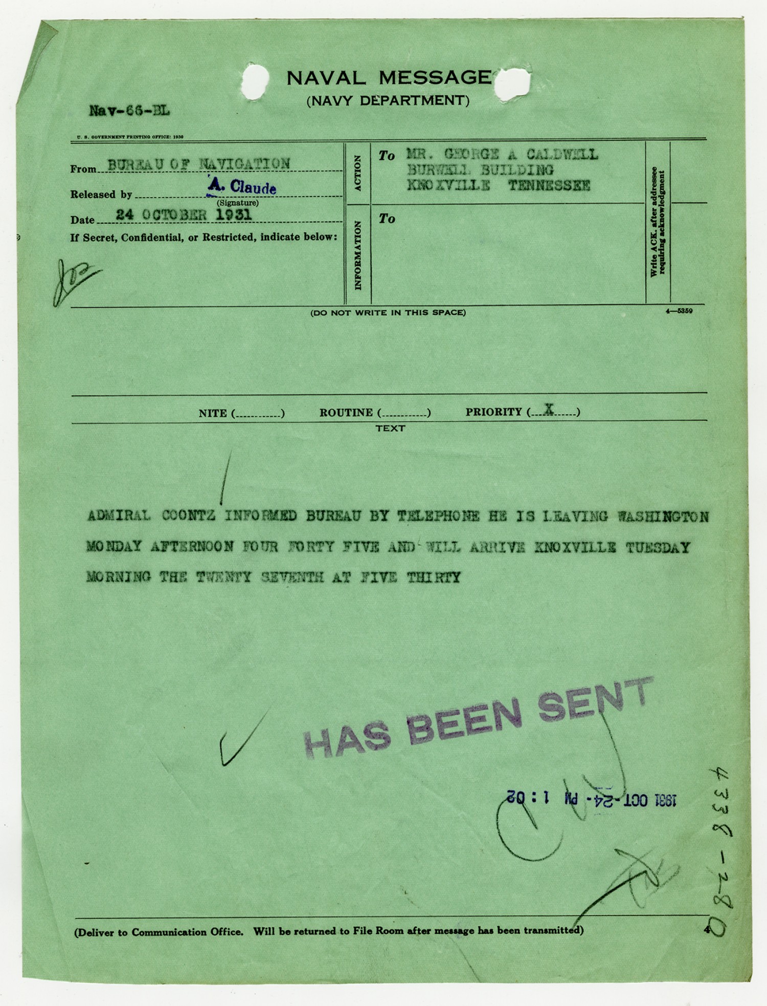 Bureau of Navigation letter to George A. Caldwell - October 24, 1931