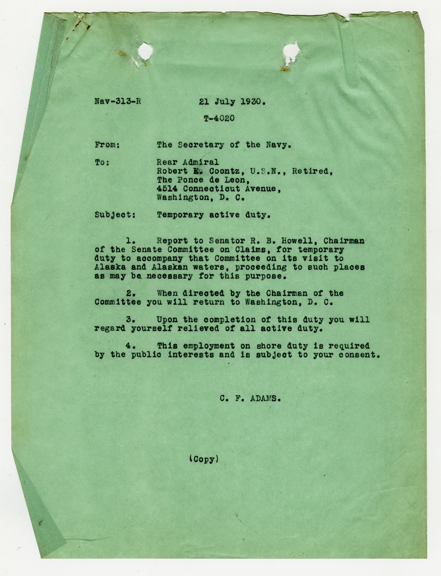C.F. Adams letter to Robert E. Coontz - July 21, 1930
