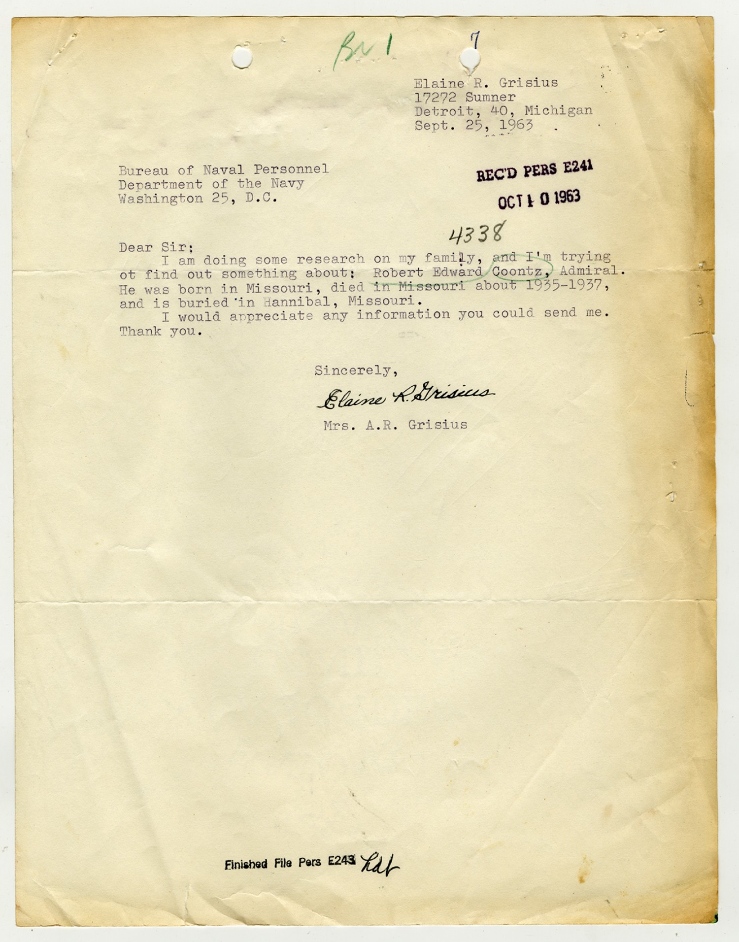 Elaine R. Grisius letter to the Bureau of Naval Personnel - September 25, 1963