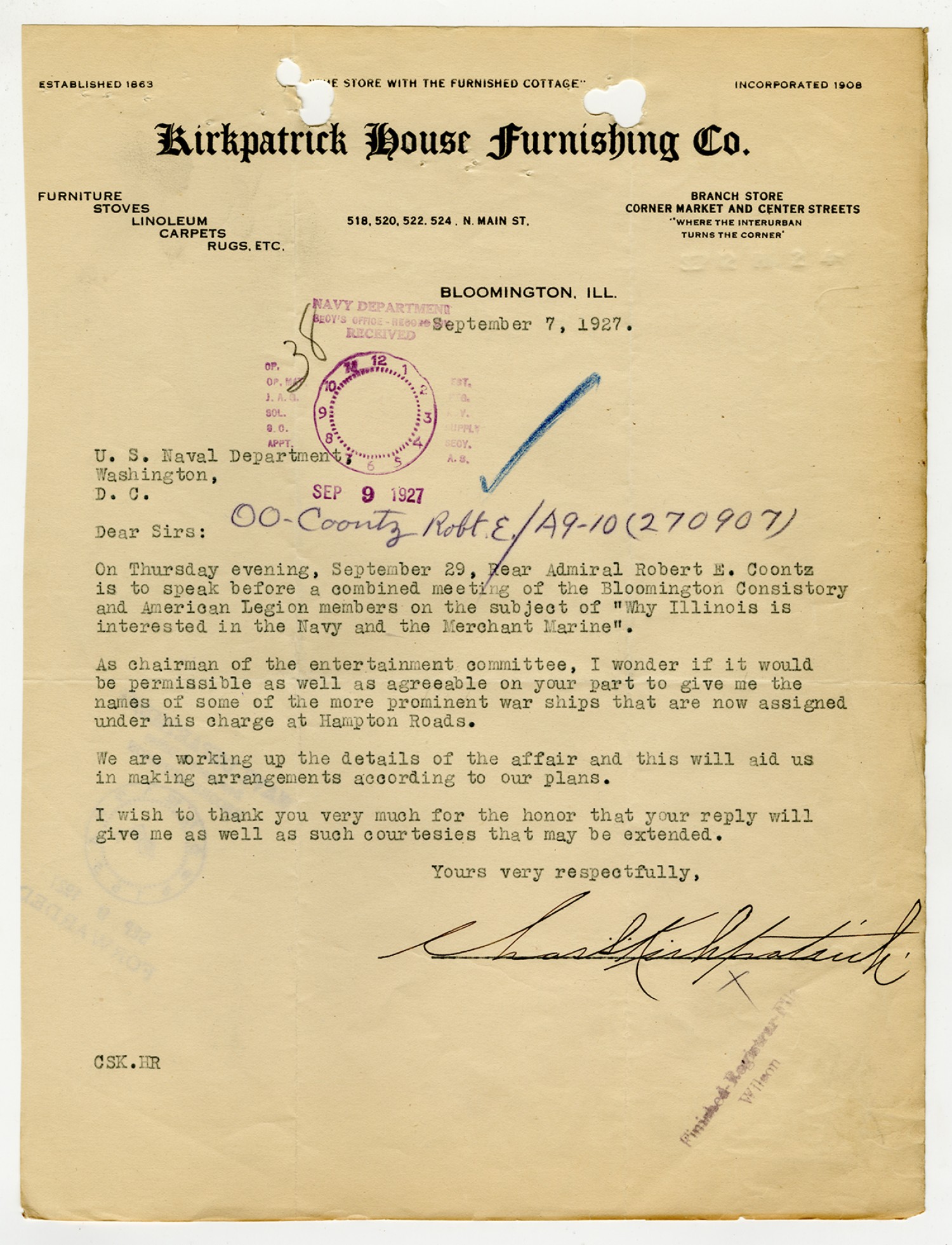 Charles Kirkpatrick letter to the U.S. Naval Department - September 7, 1927