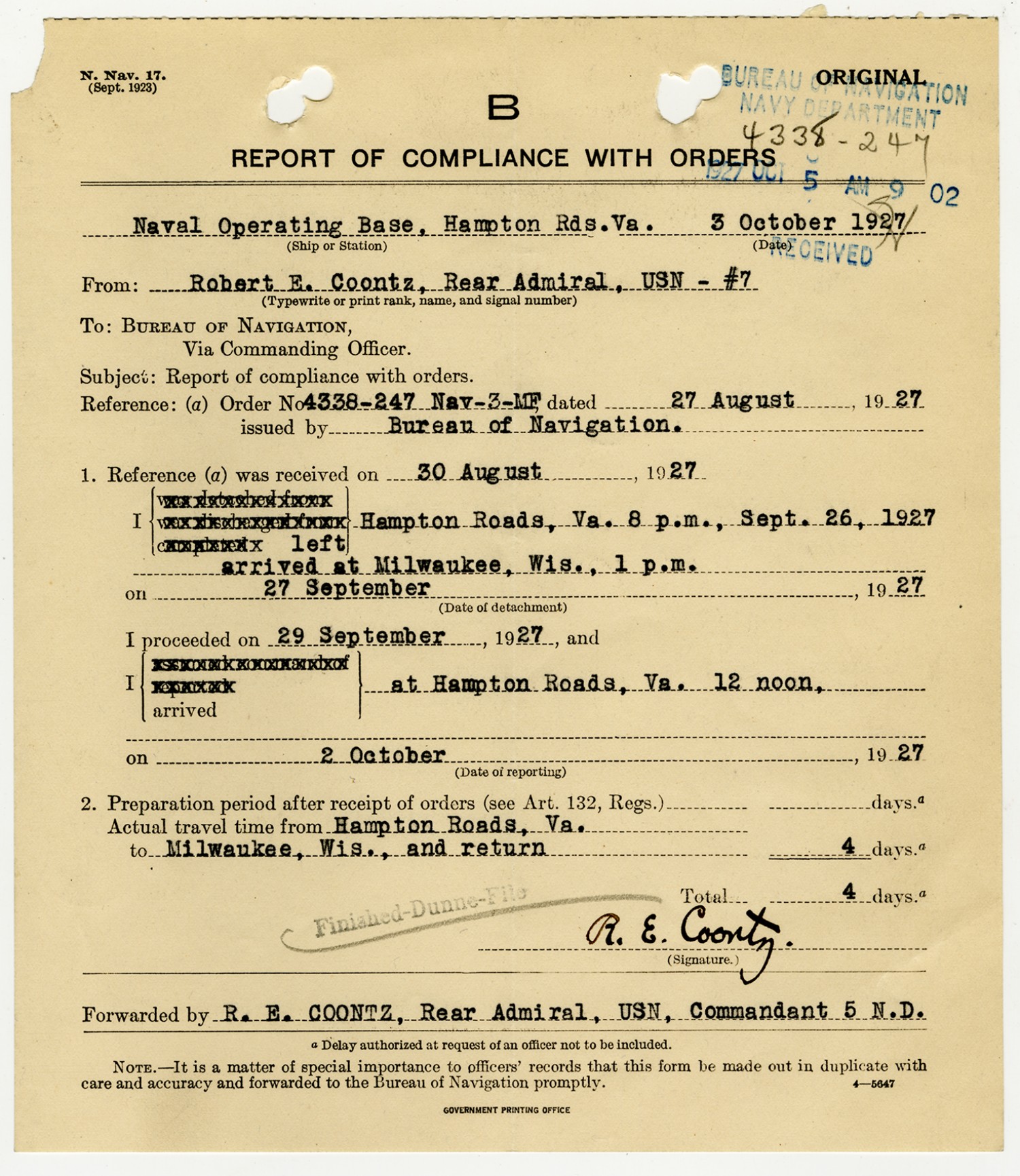 Robert E. Coontz Report of Compliance with Orders - October 3, 1927