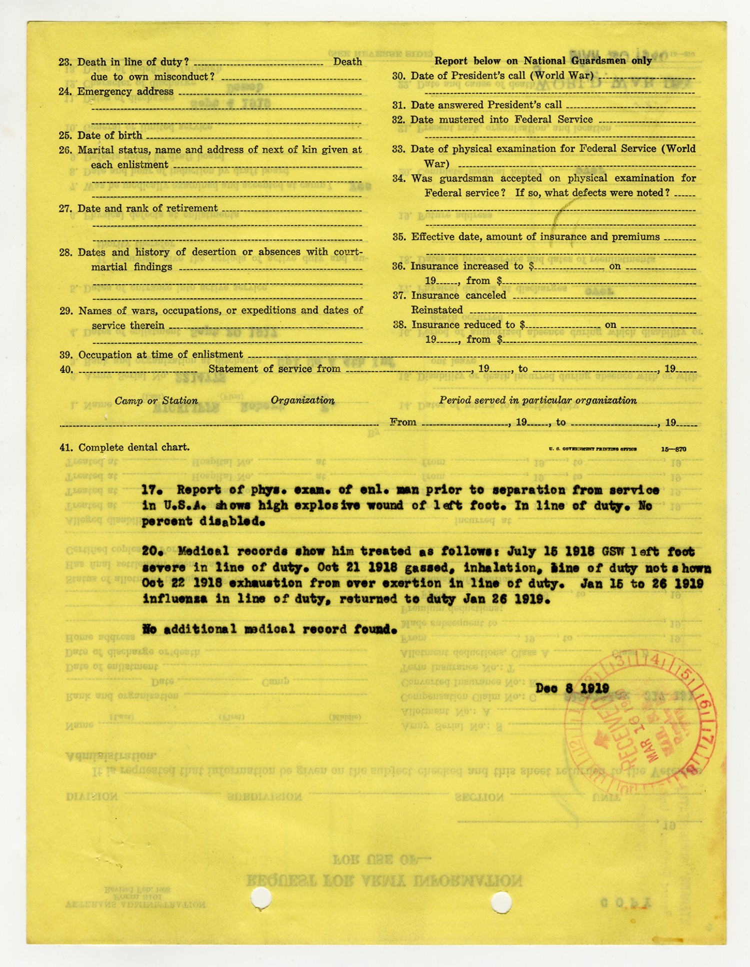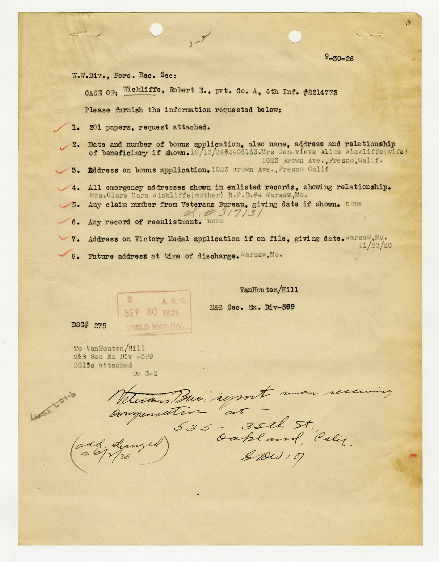 Robert E. Wickliffe Request for Army Information - December 8, 1919