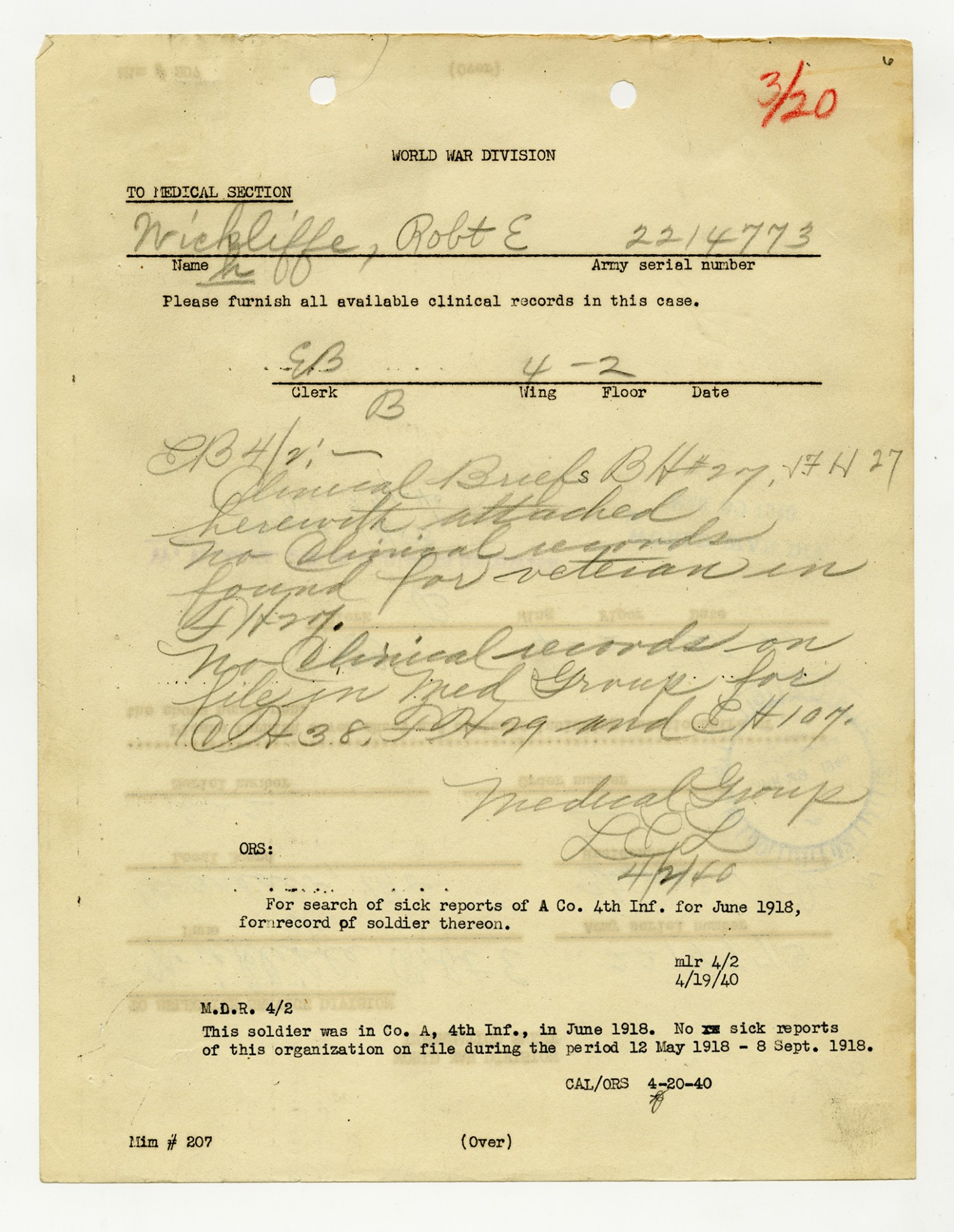 Robert E. Wickliffe Medical Record - March 28, 1940