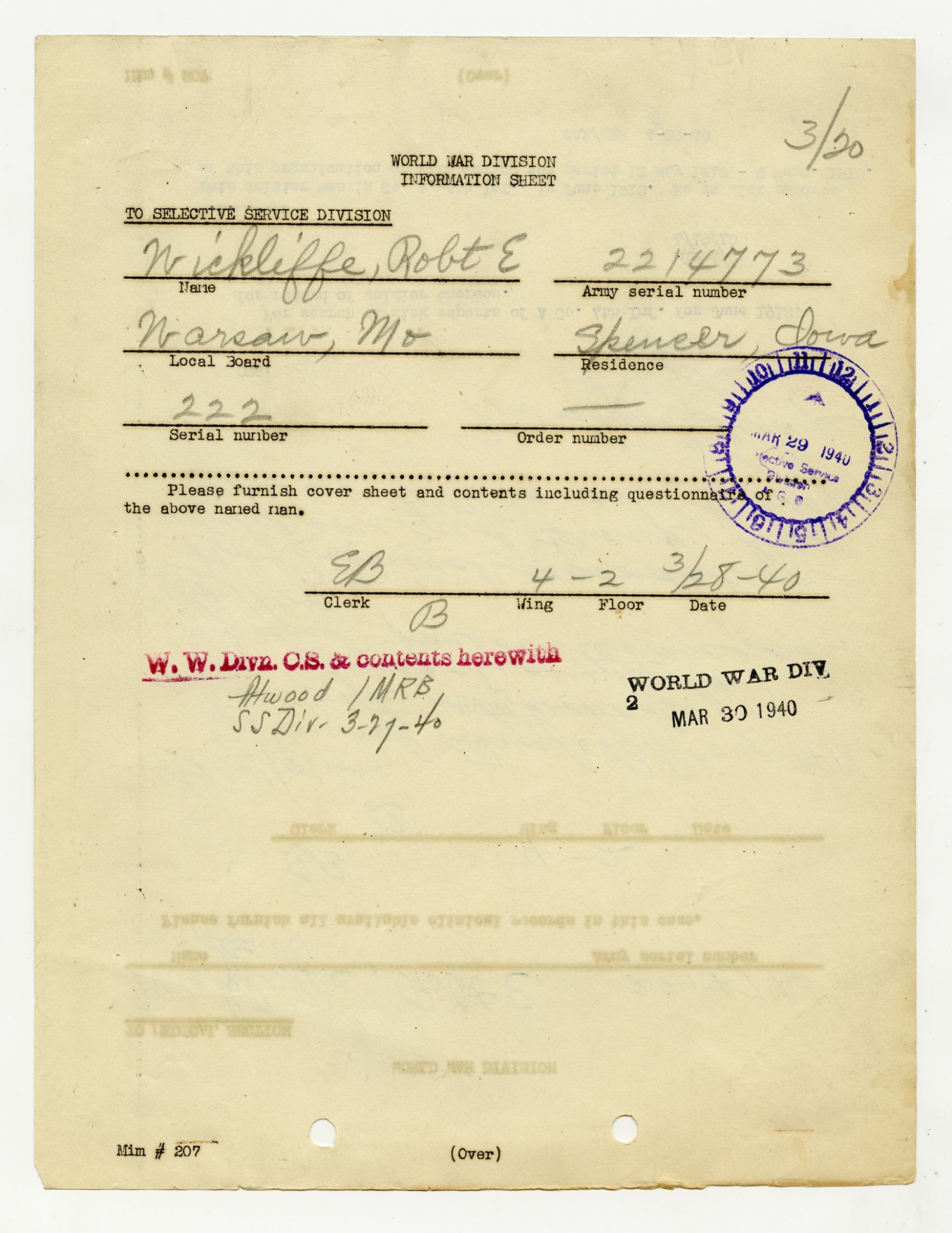 Robert E. Wickliffe Request for Army Information - March 9, 1940