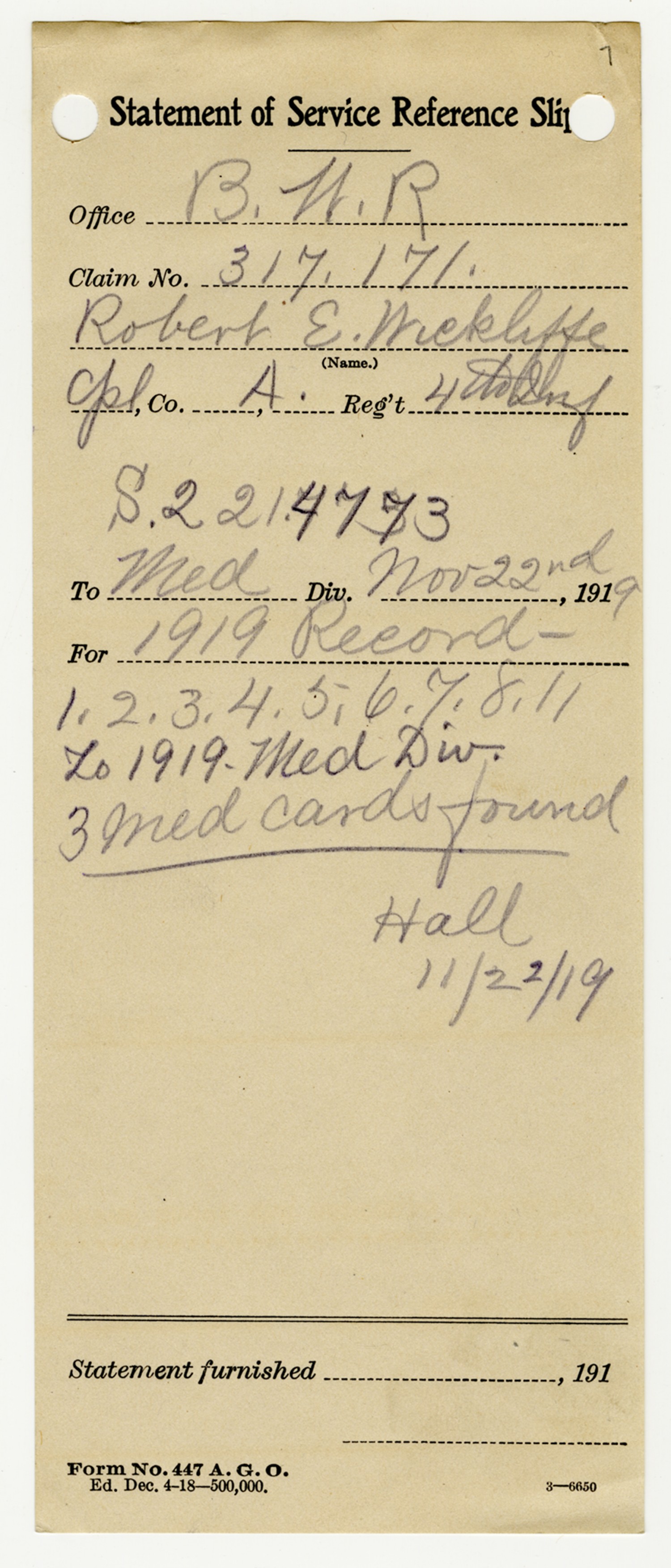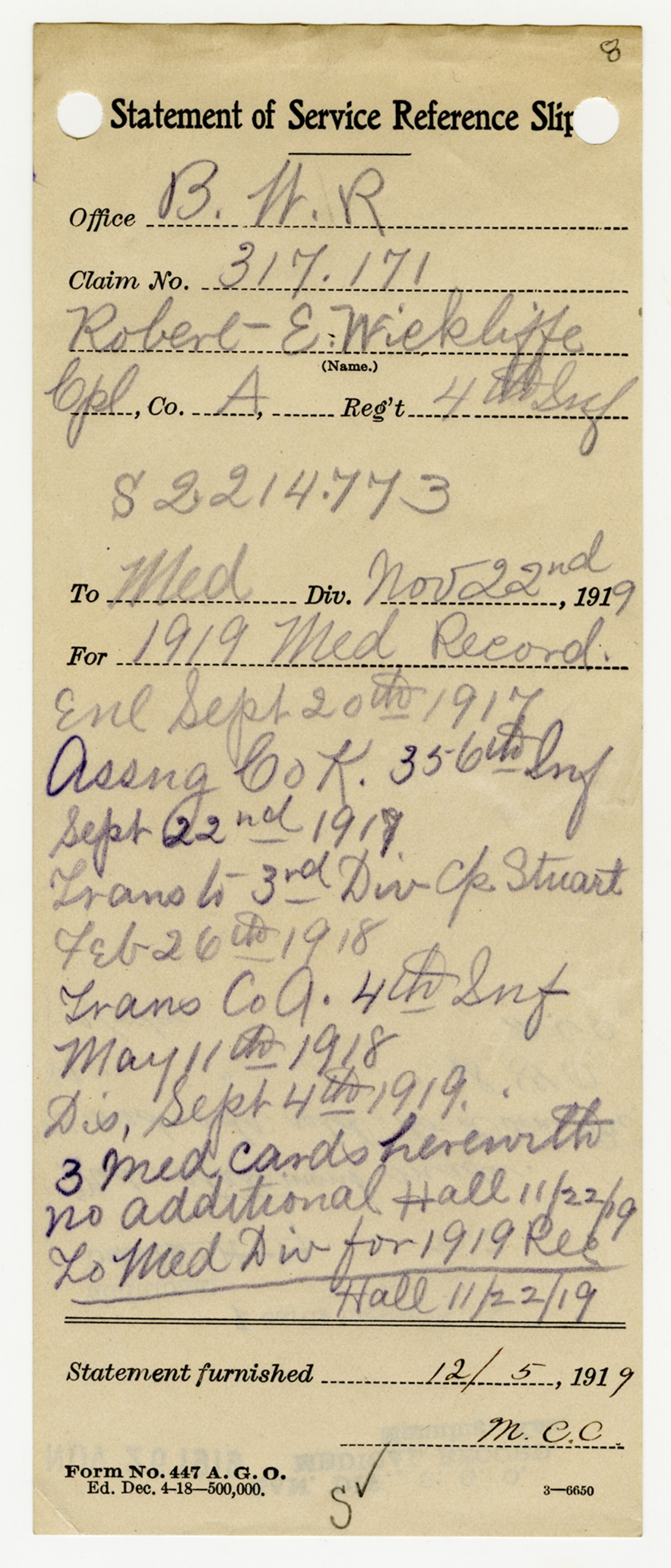 Robert E. Wickliffe Statement of Service - November 22, 1919