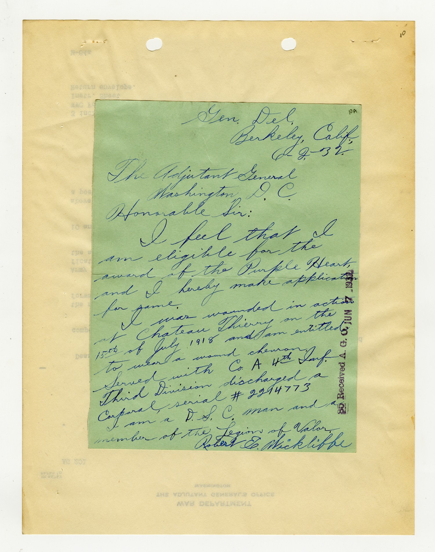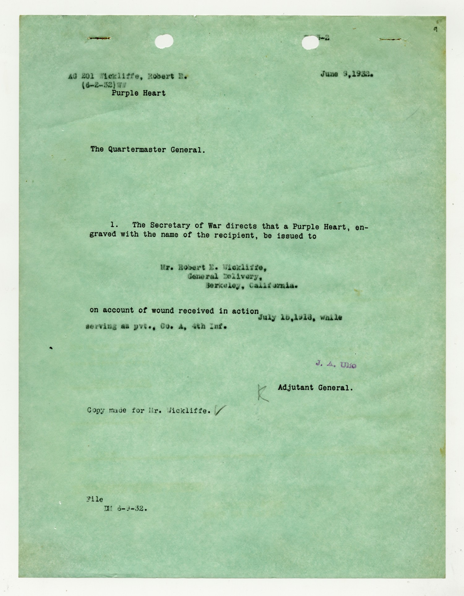 J.A. Ulio letter to the Quartermaster General - June 3, 1932